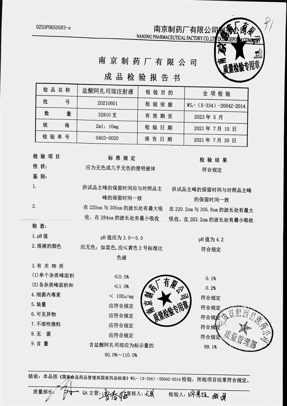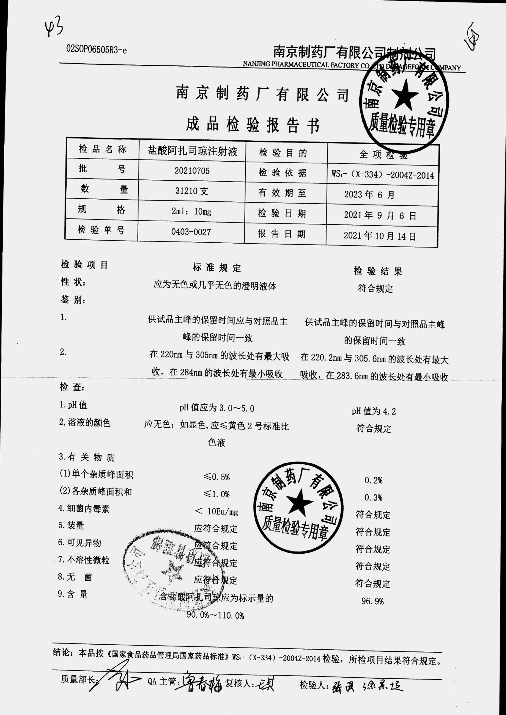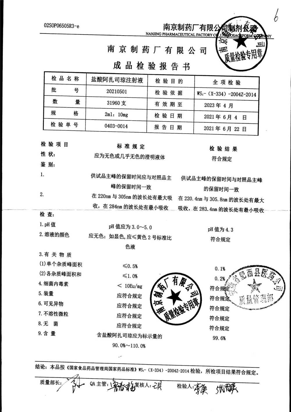 | 盐酸阿扎司琼注射液 | 2ml:10mg*5支 | 20210601 | 查看详情 |