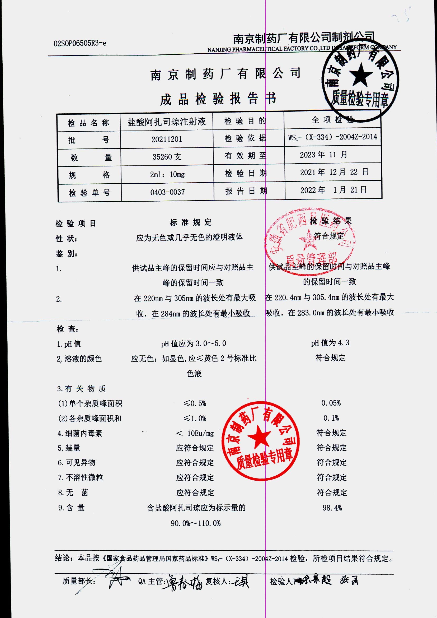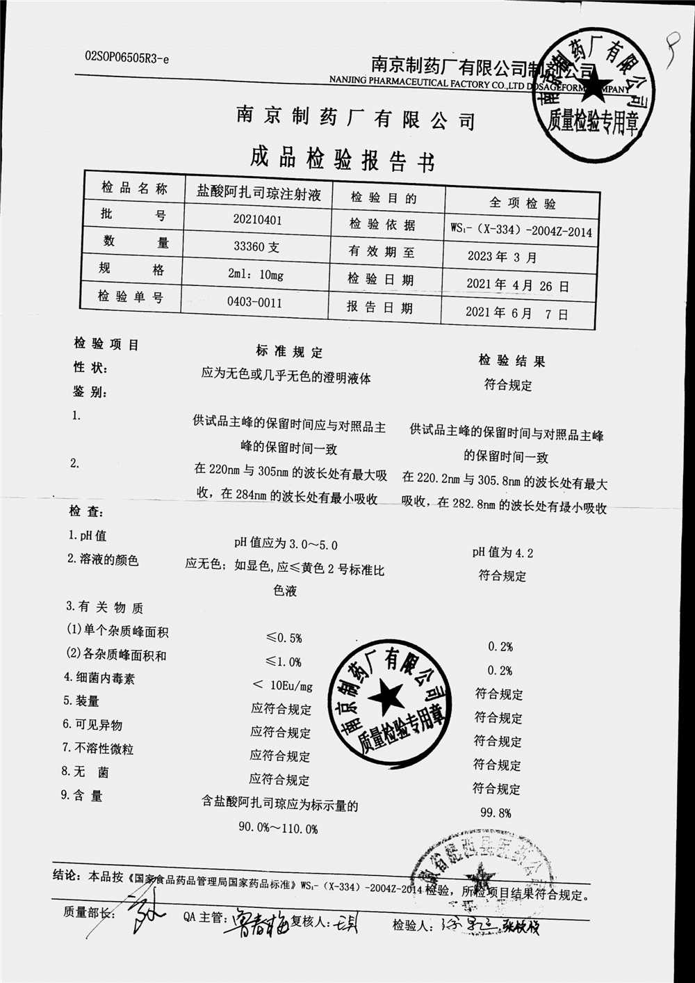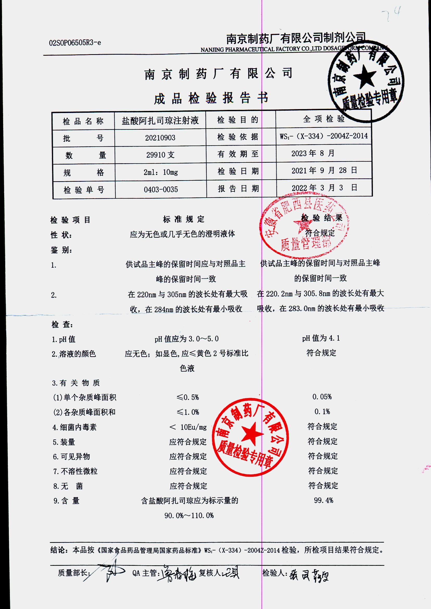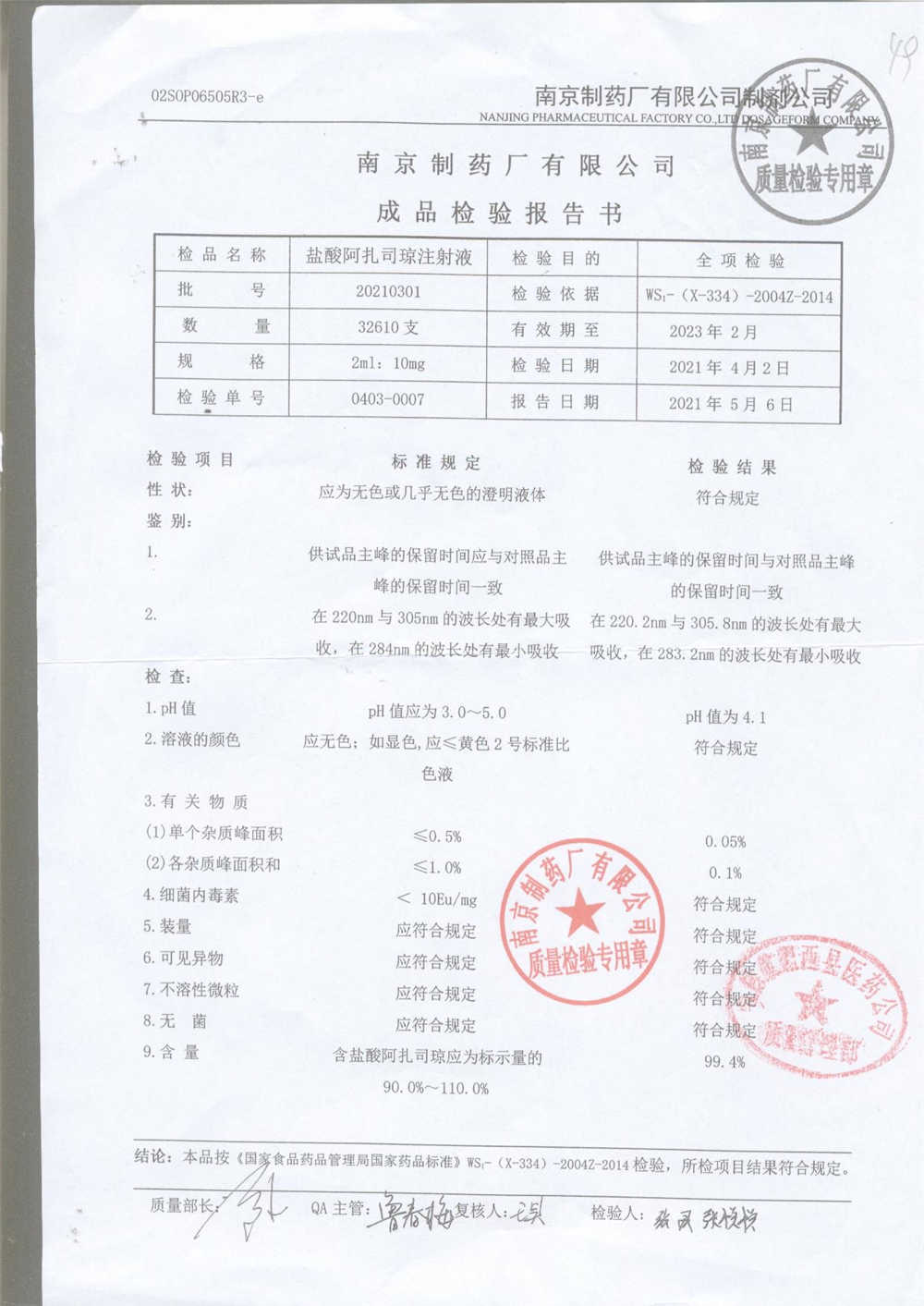 | 盐酸阿扎司琼注射液 | 2ml:10mg*5支 | 20210501 | 查看详情 |