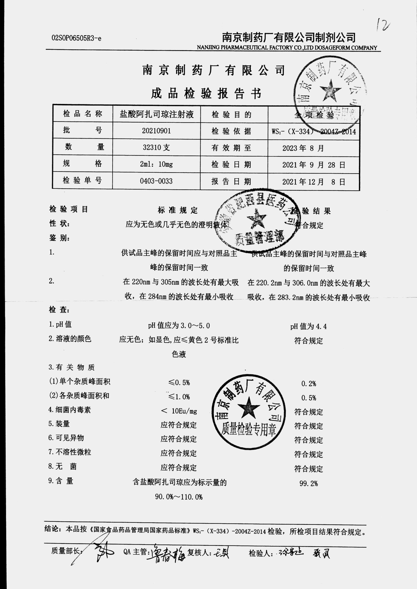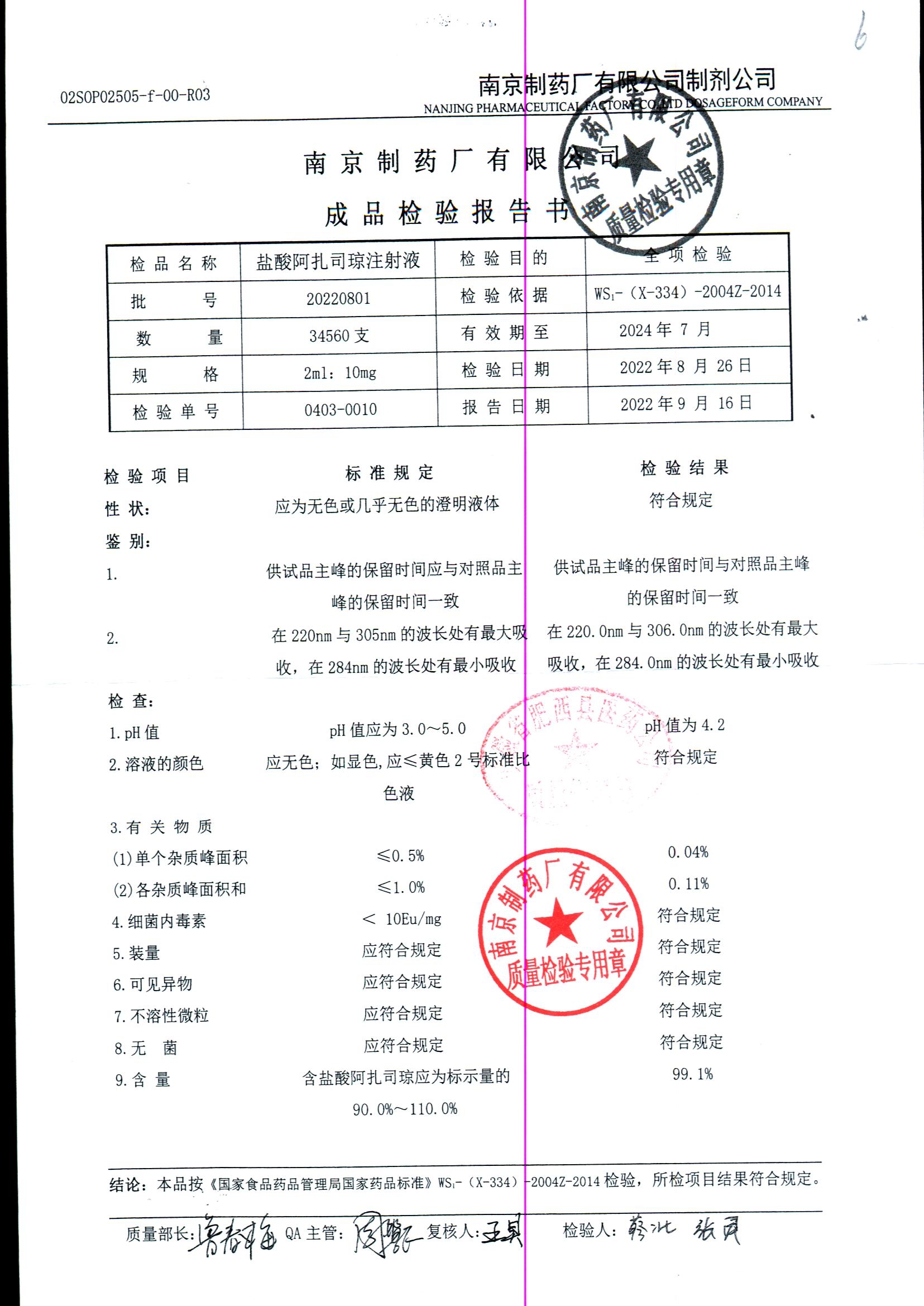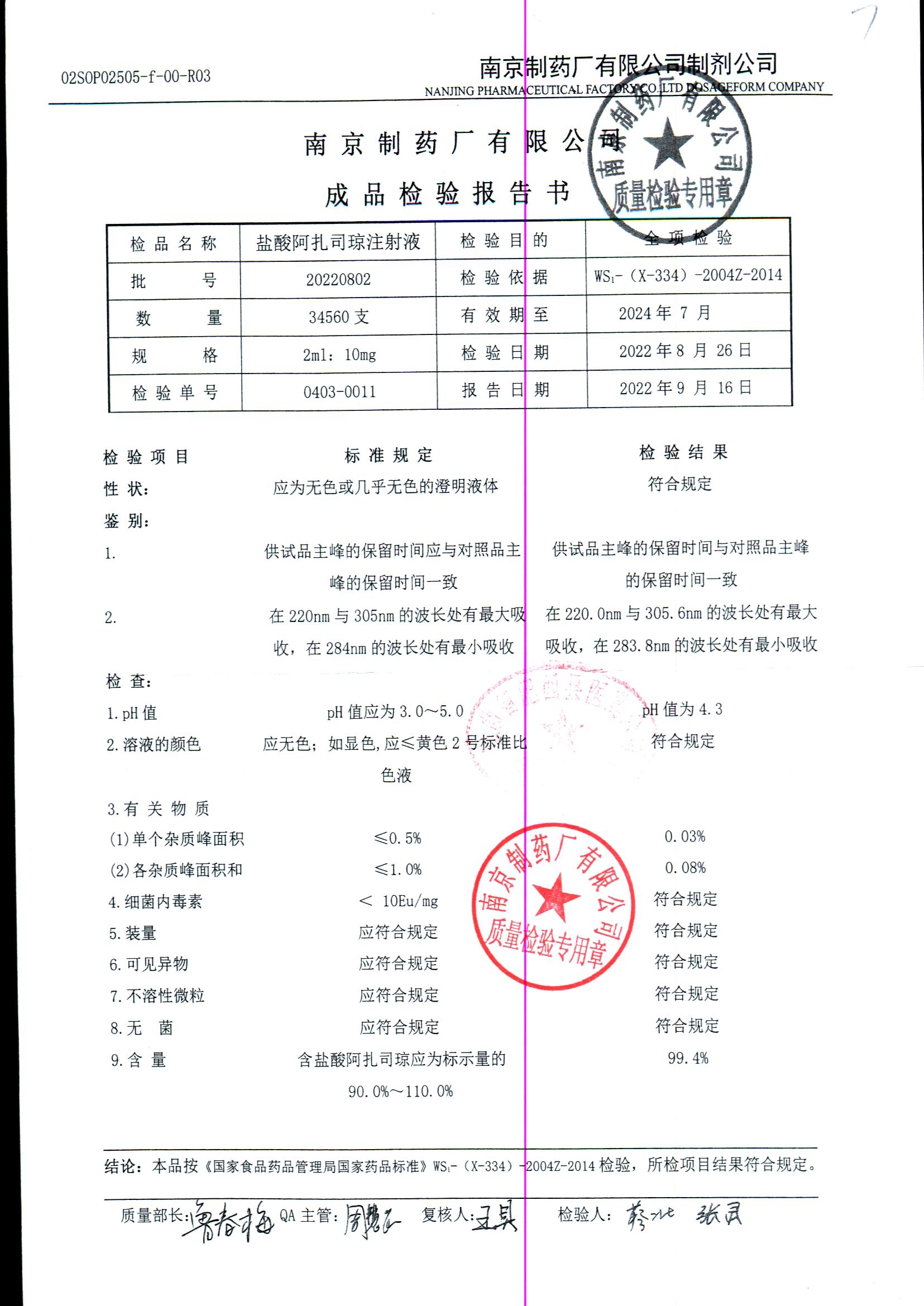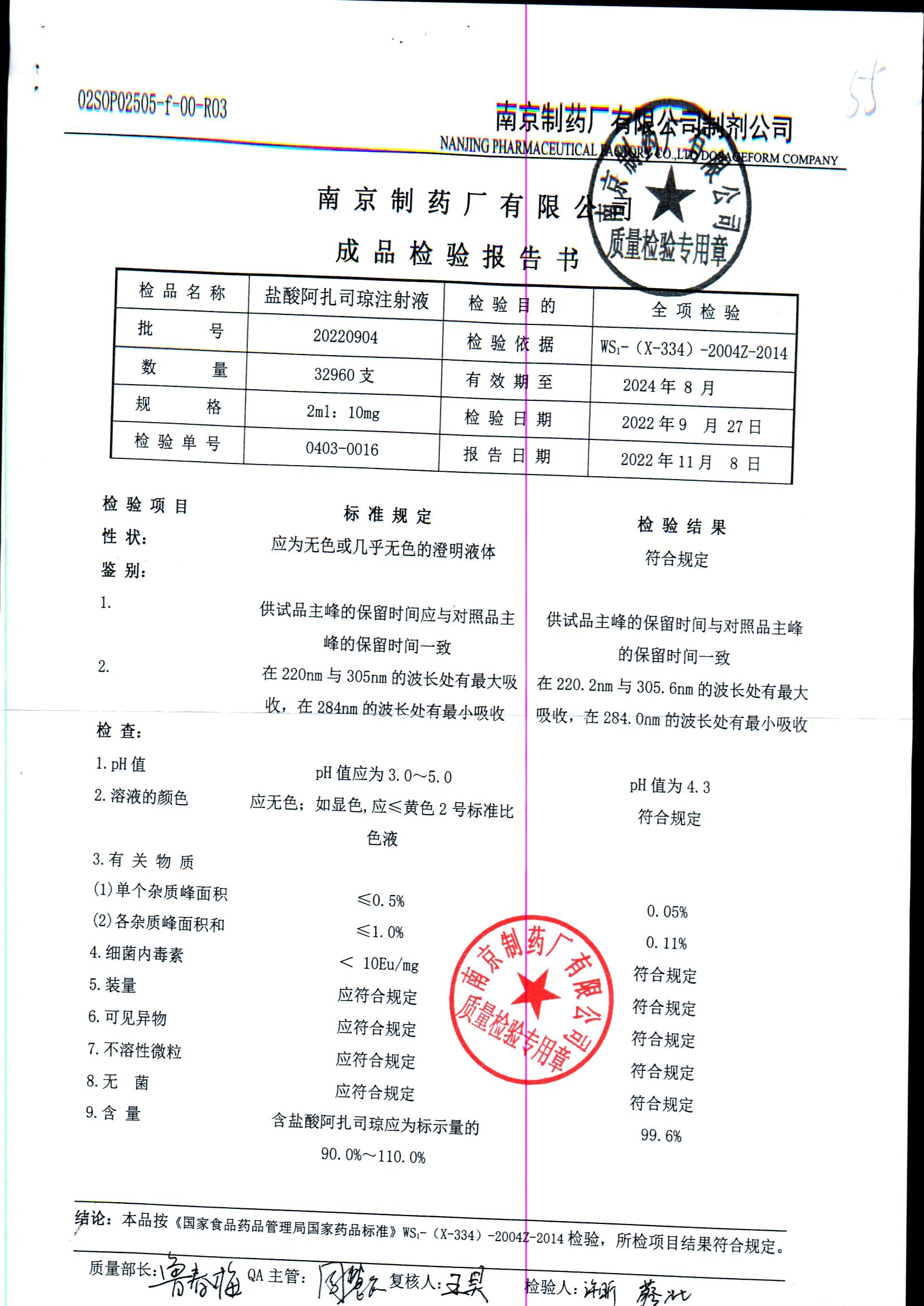 | 盐酸阿扎司琼注射液 | 2ml:10mg*5支 | 20220904 | 查看详情 |