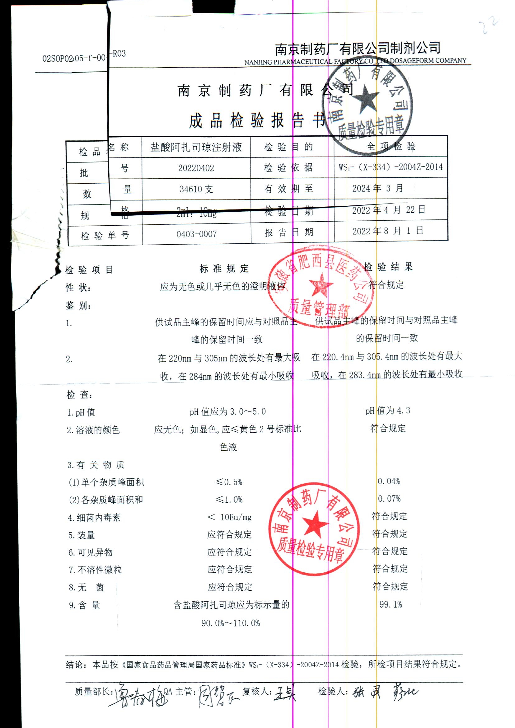 | 盐酸阿扎司琼注射液 | 2ml:10mg*5支 | 20220802 | 查看详情 |