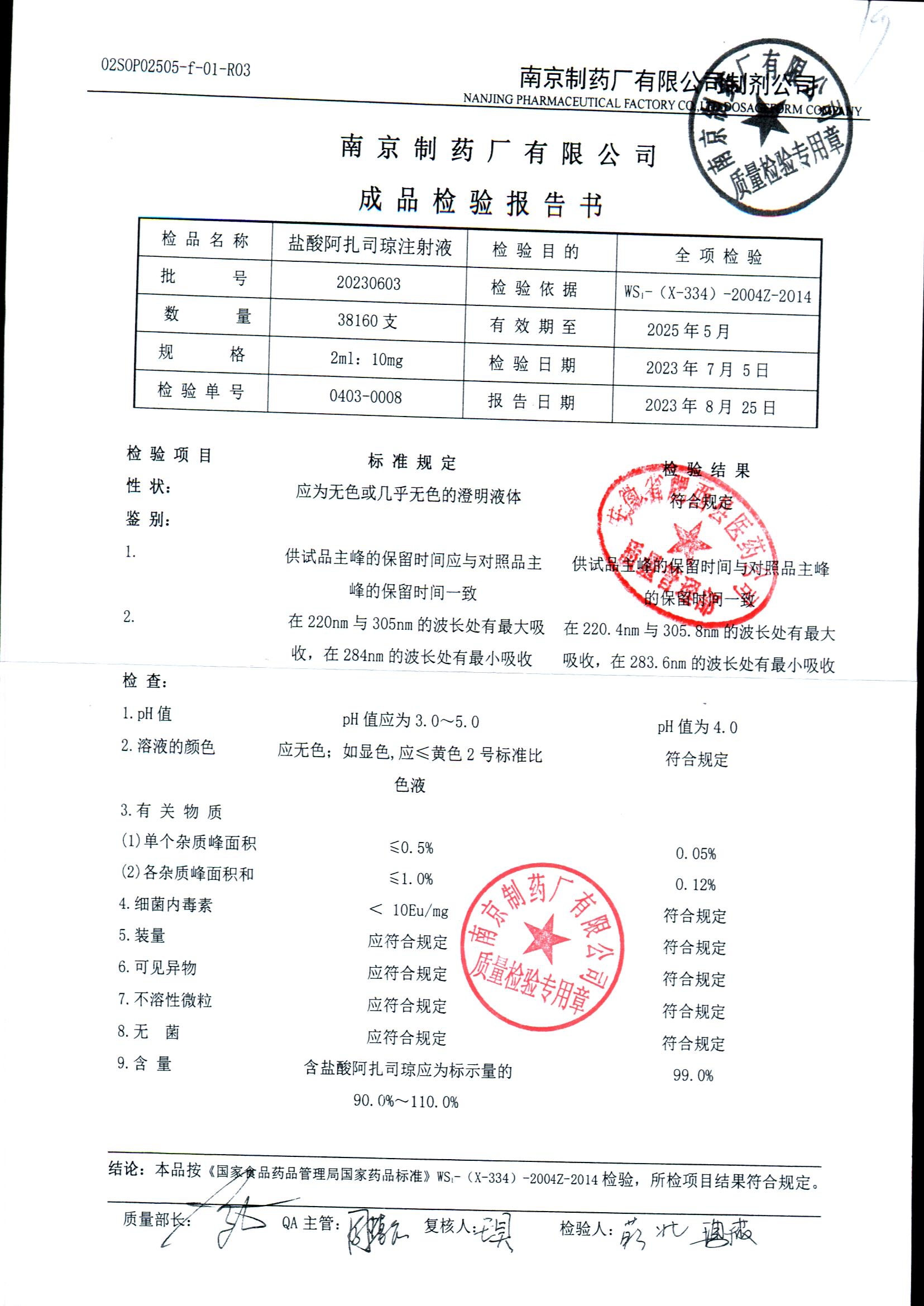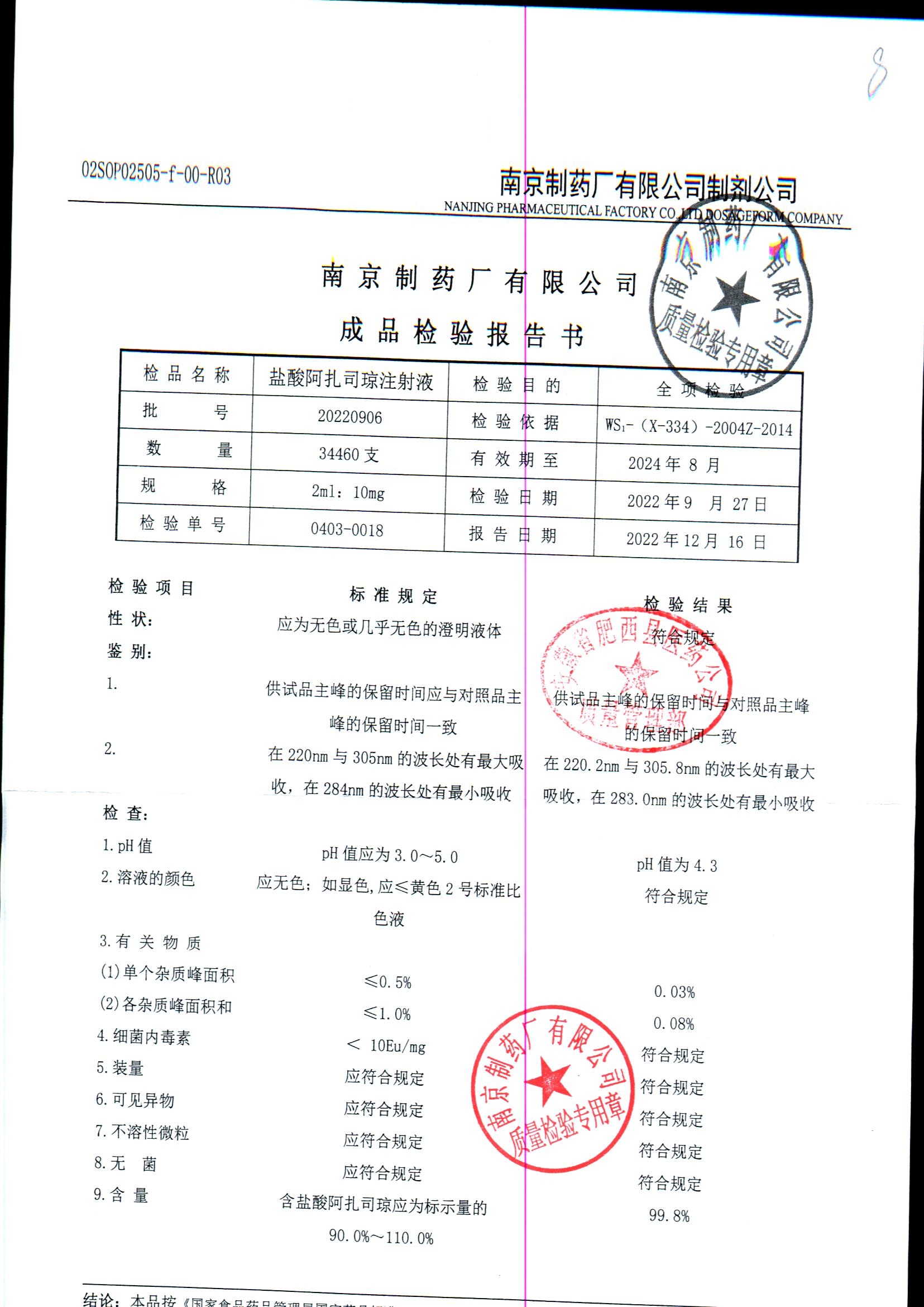 | 盐酸阿扎司琼注射液 | 2ml:10mg*5支 | 20220801 | 查看详情 |