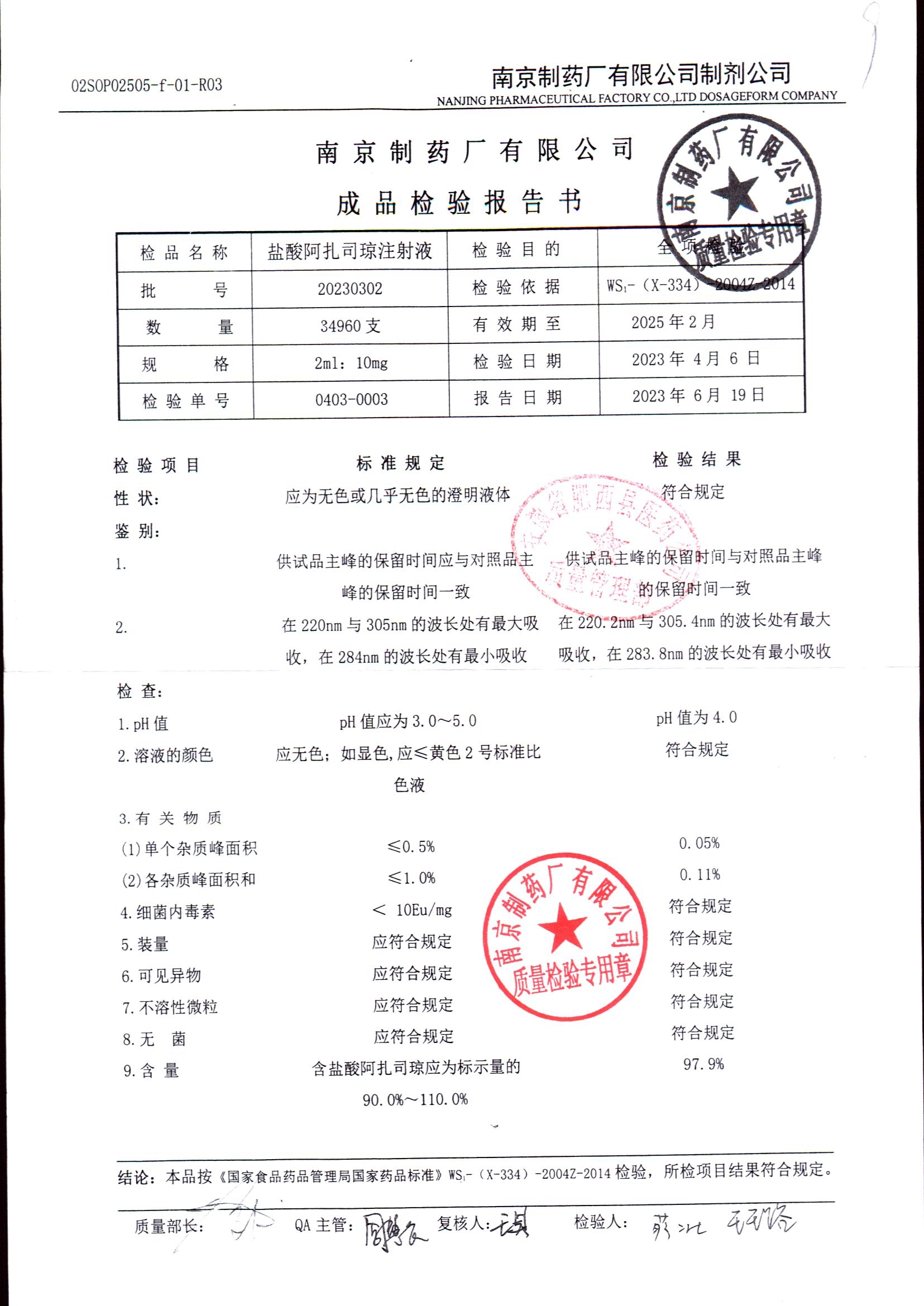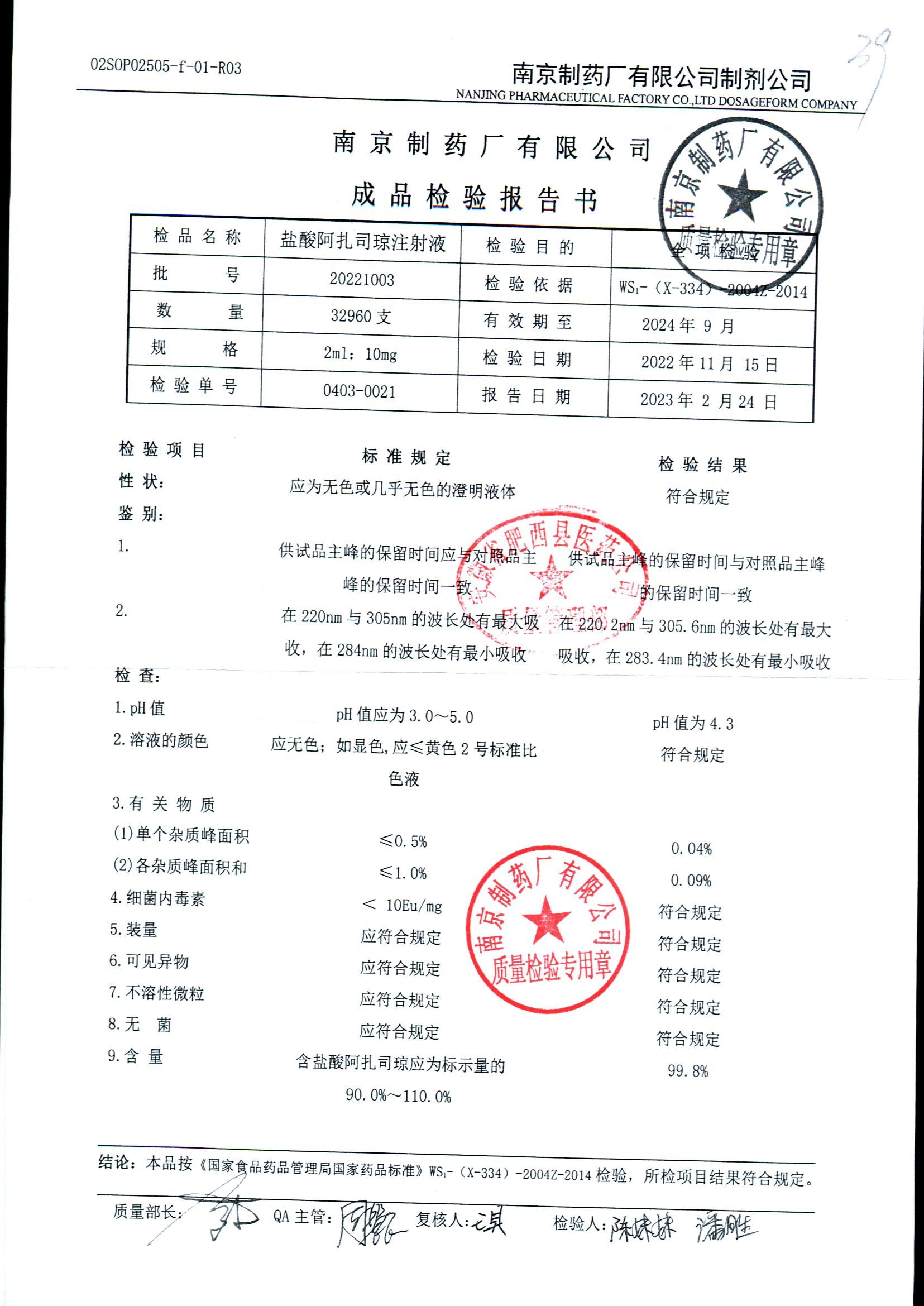 | 盐酸阿扎司琼注射液 | 2ml:10mg*5支 | 20230302 | 查看详情 |