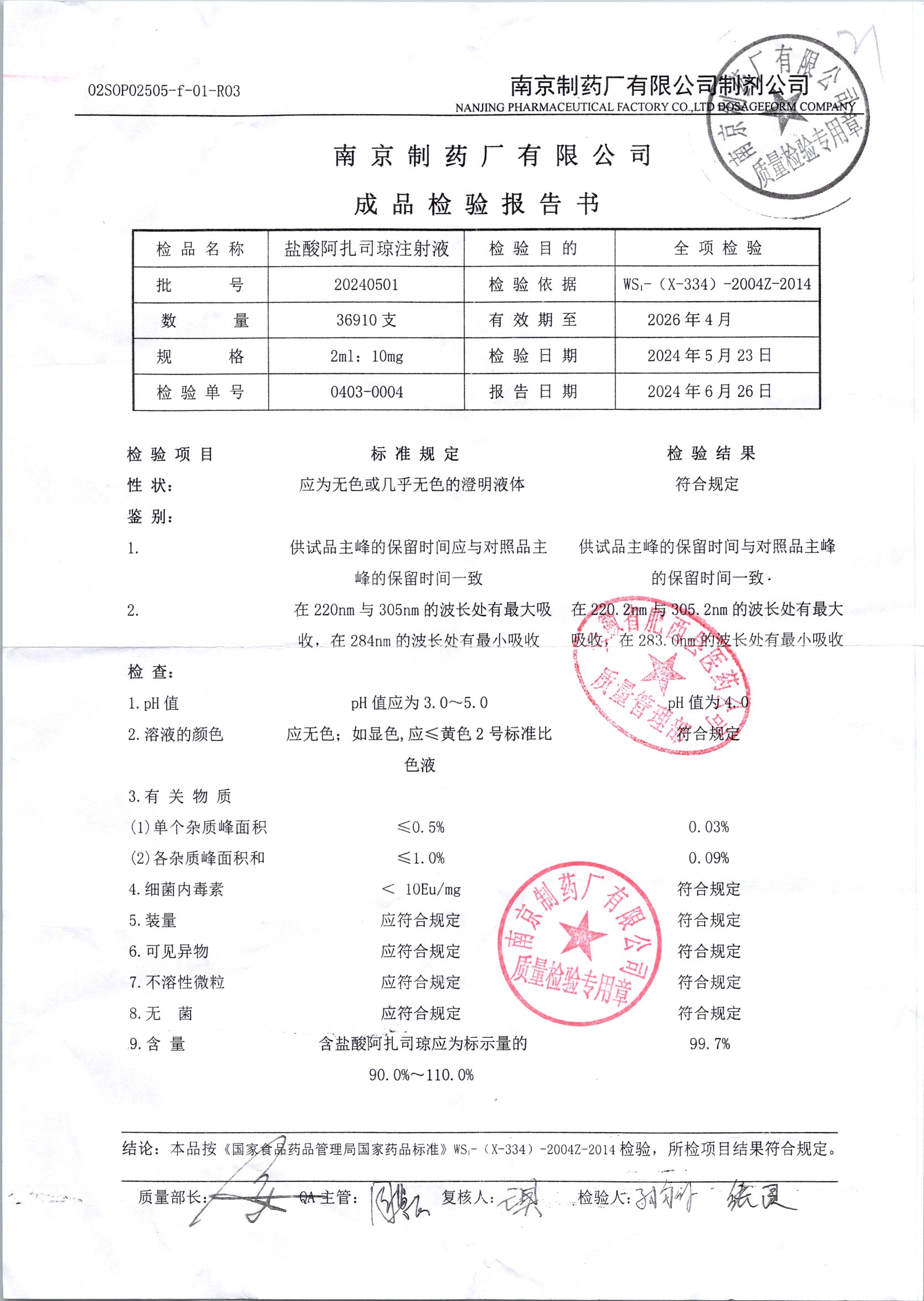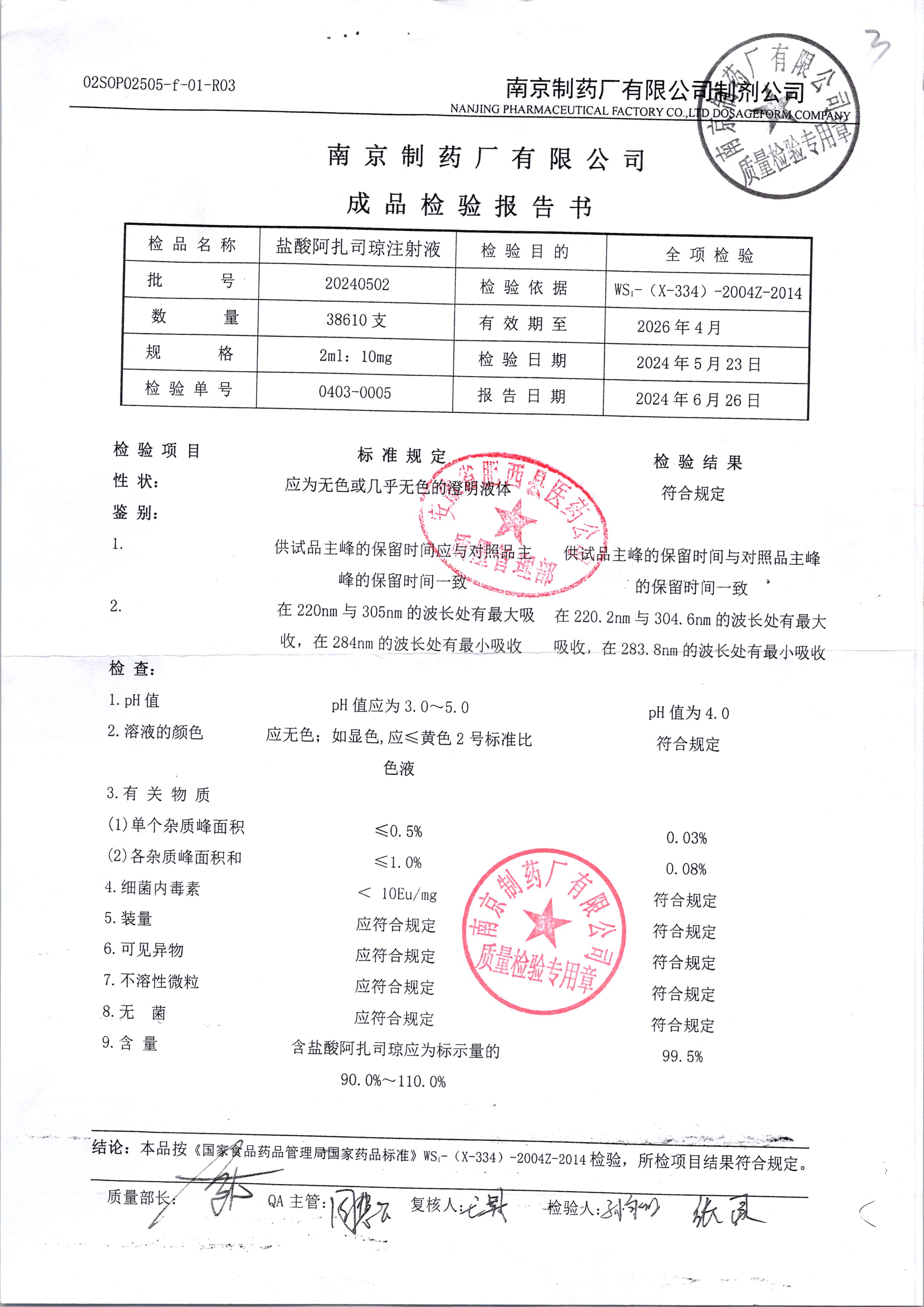 | 盐酸阿扎司琼注射液 | 2ml:10mg*5支 | 20240502 | 查看详情 |