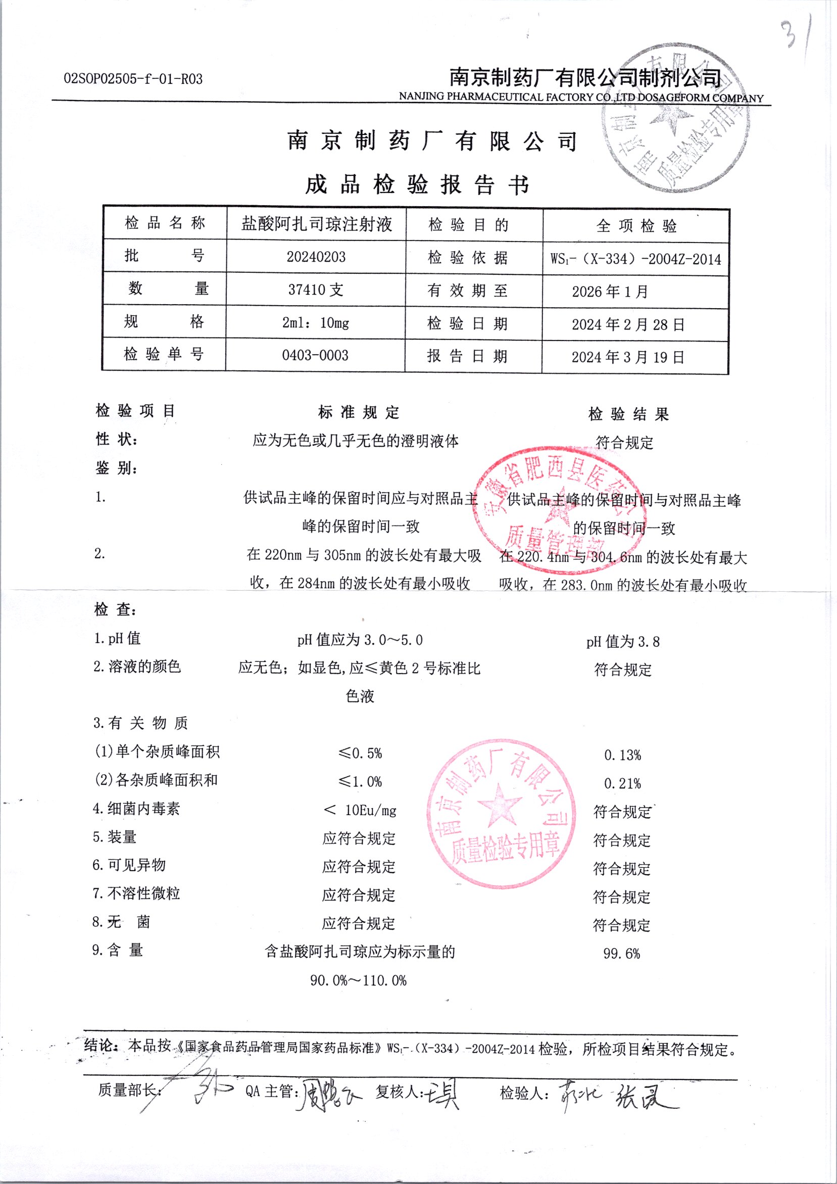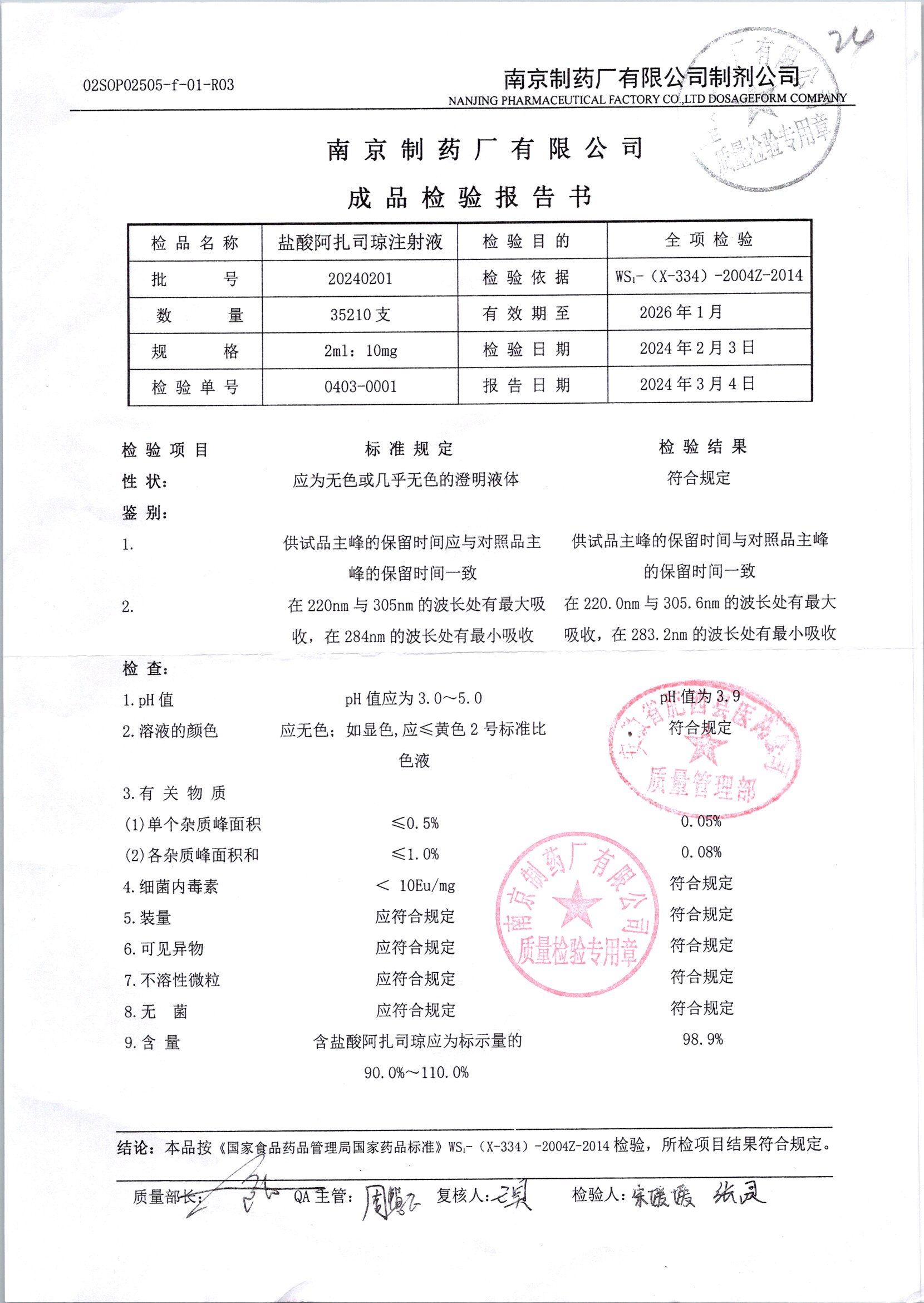 | 盐酸阿扎司琼注射液 | 2ml:10mg*5支 | 20240203 | 查看详情 |