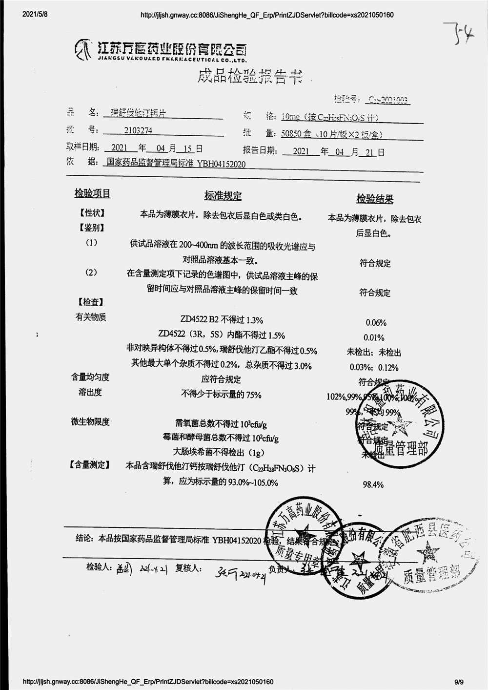 | 瑞舒伐他汀钙片 | 10mg*10片/板*2板 | 2103274 | 查看详情 |
