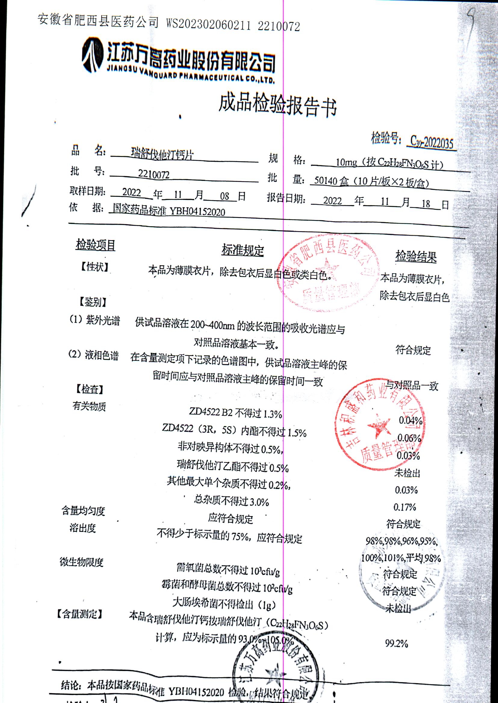 | 瑞舒伐他汀钙片 | 10mg*10片/板*2板 | 2210072 | 查看详情 |