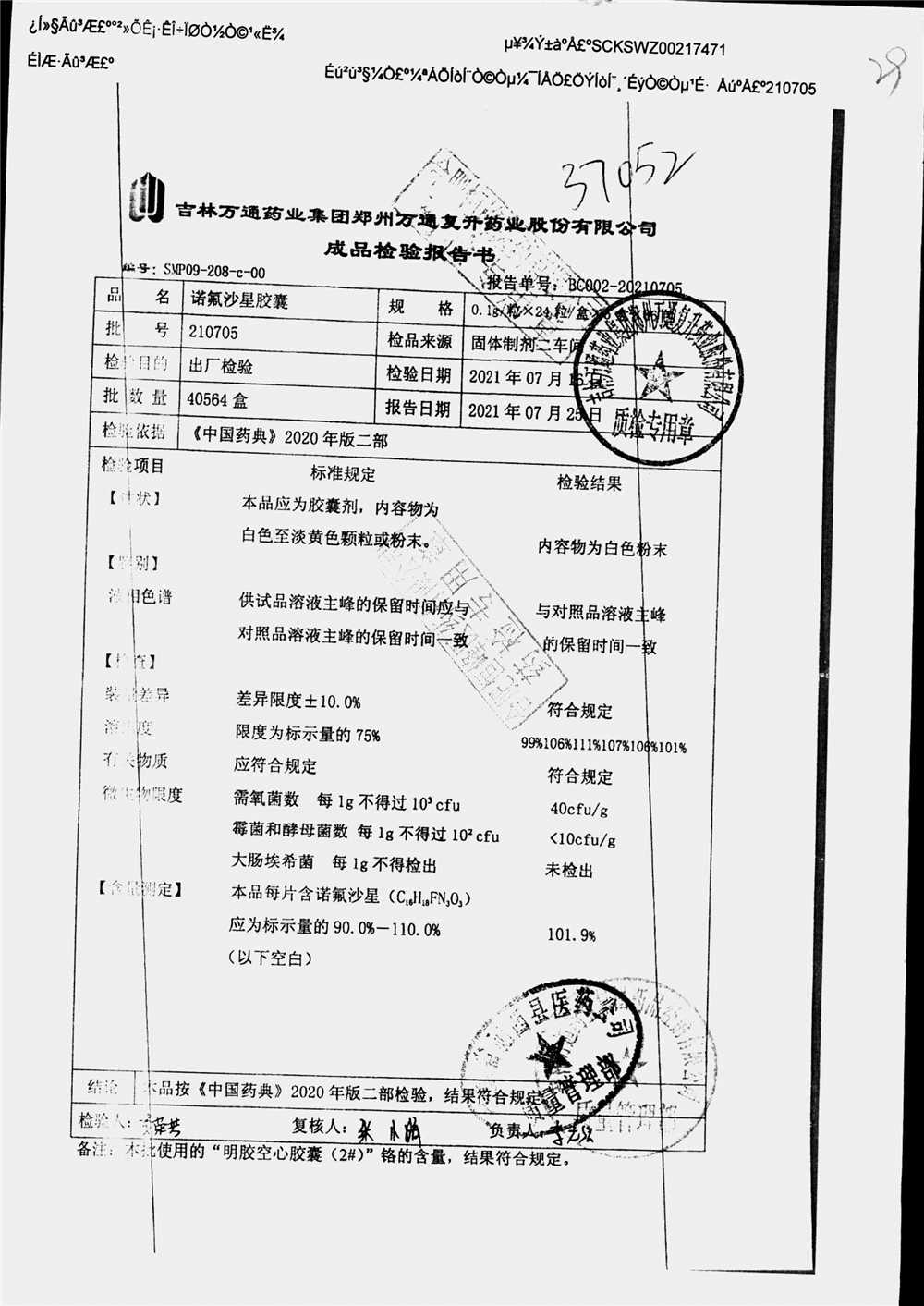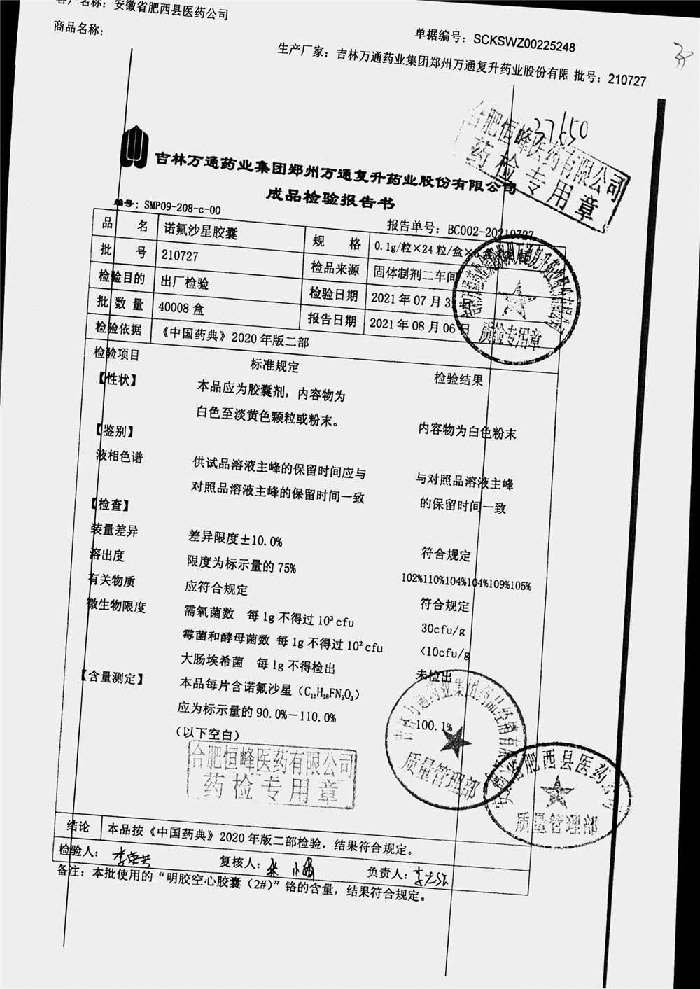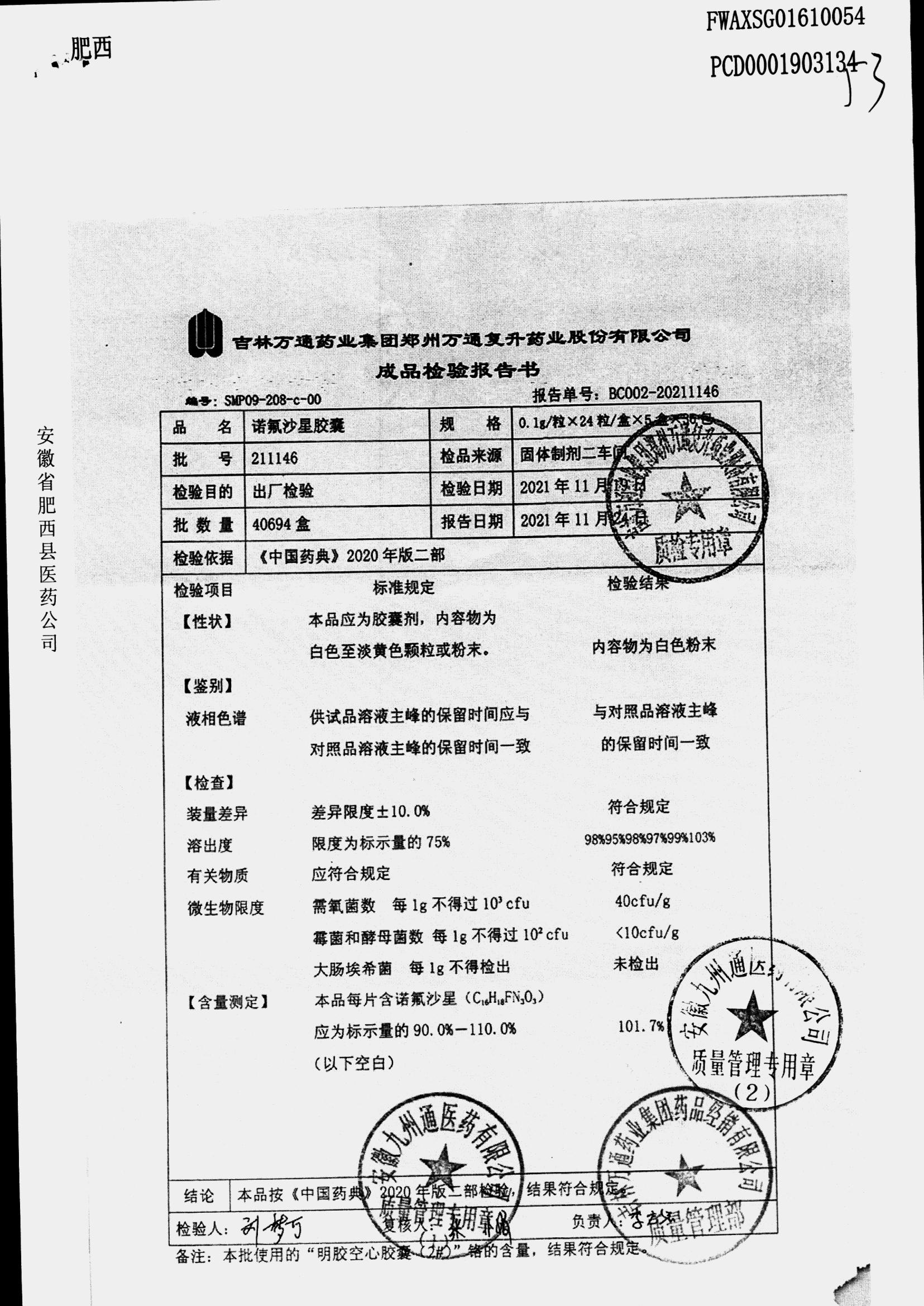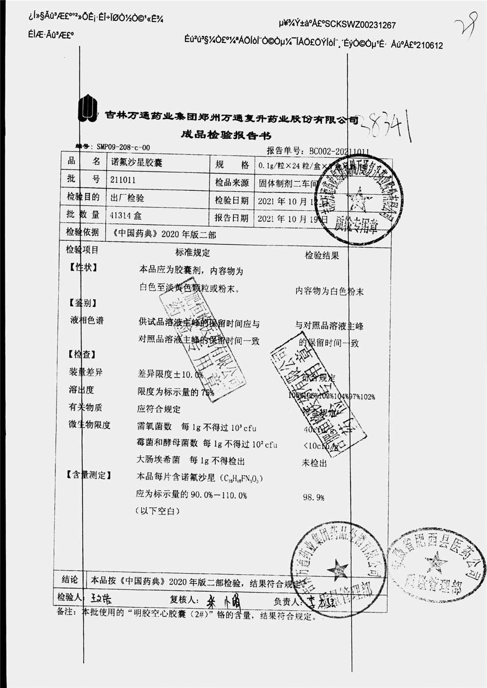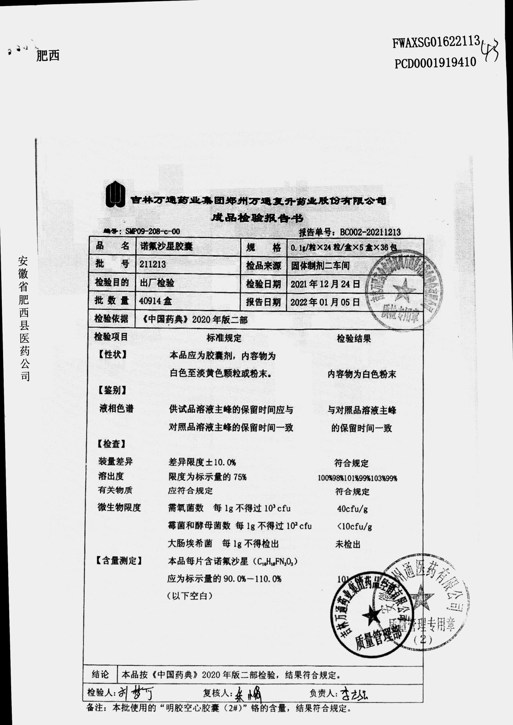 | 诺氟沙星胶囊 | 0.1g*12粒*2板 | 210711 | 查看详情 |