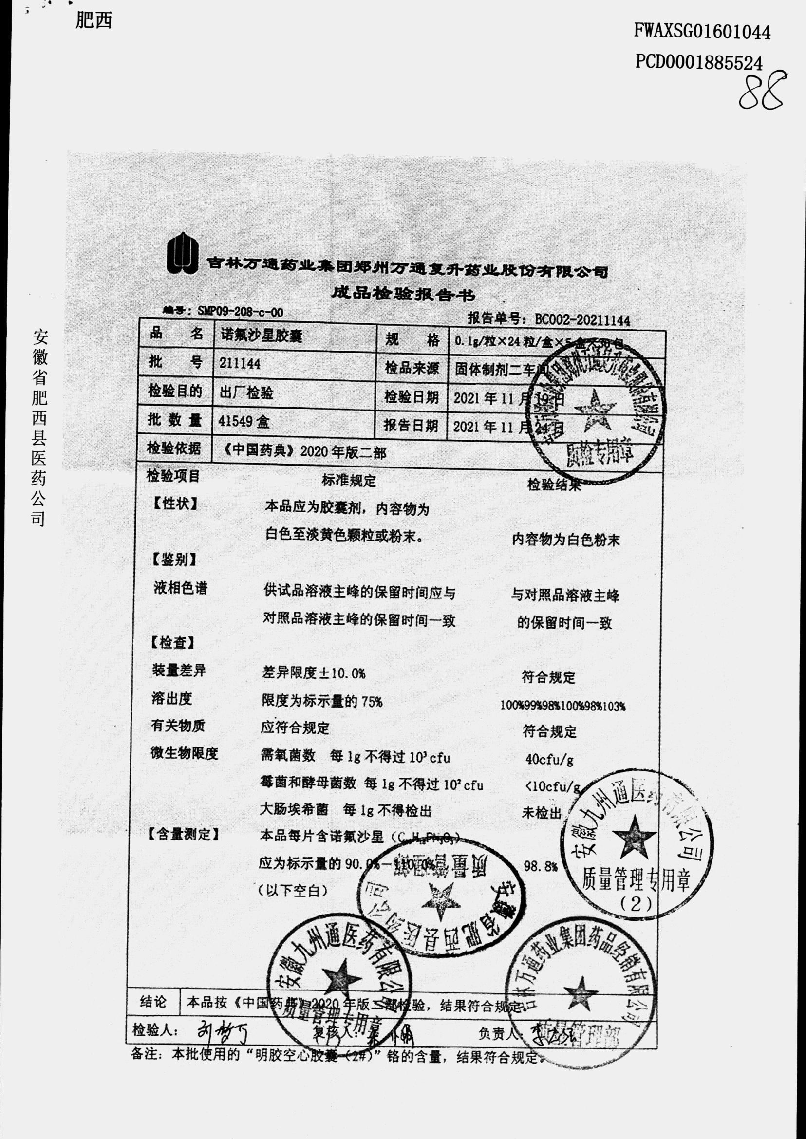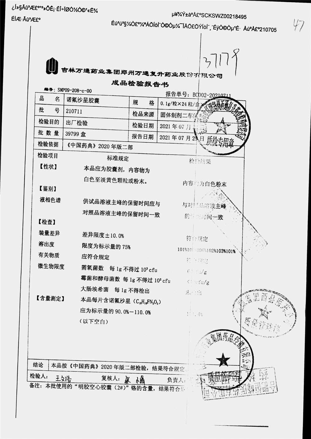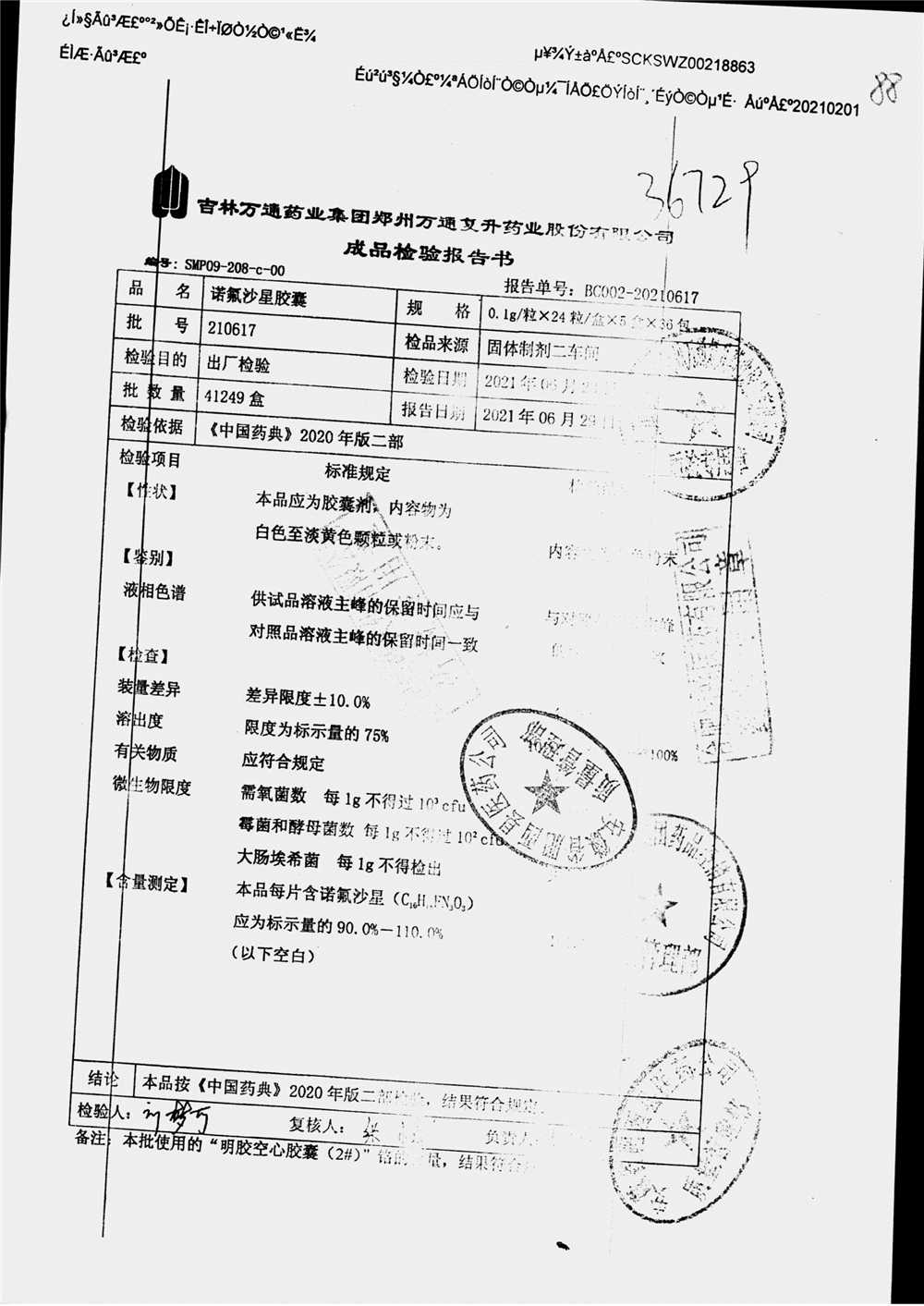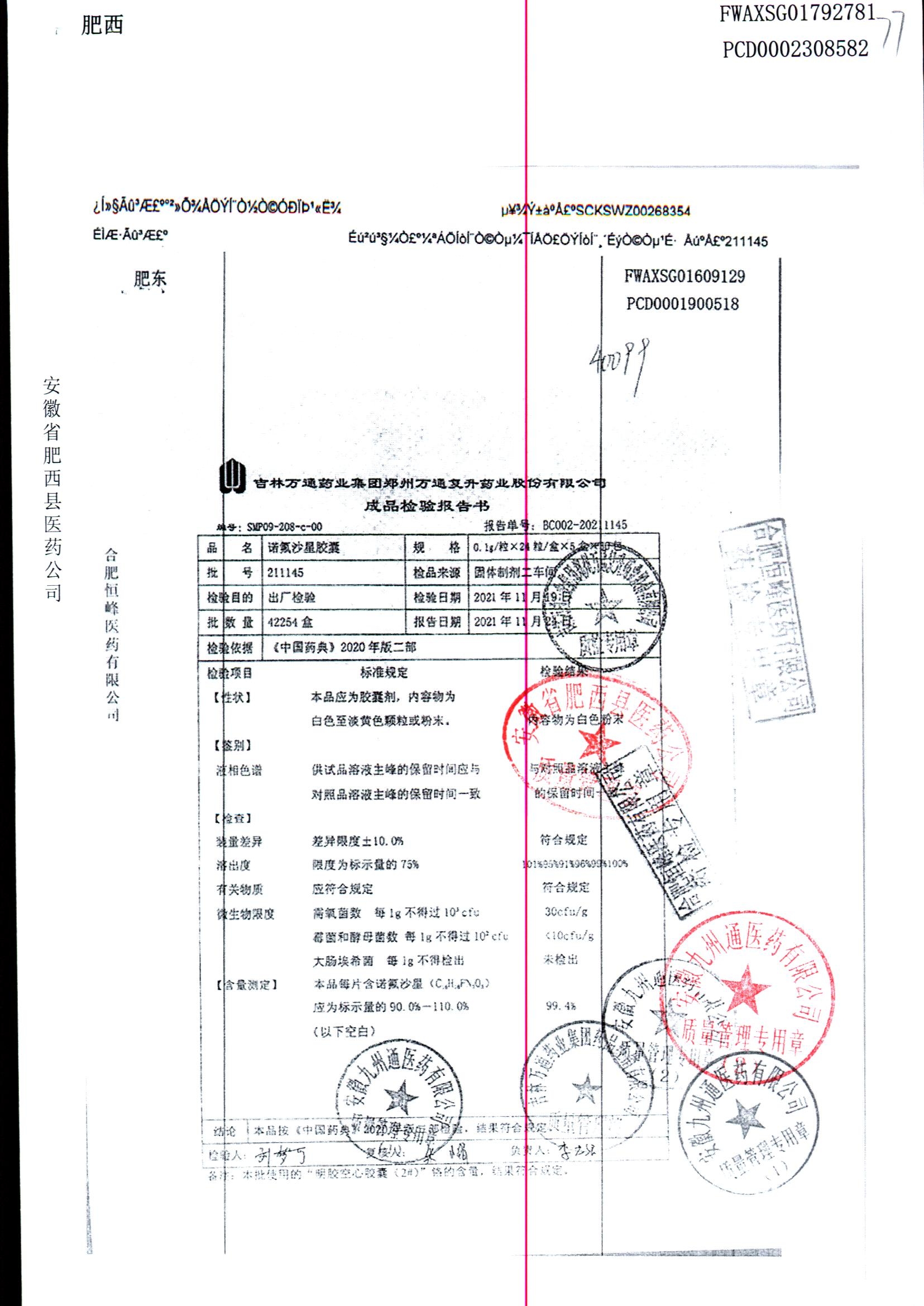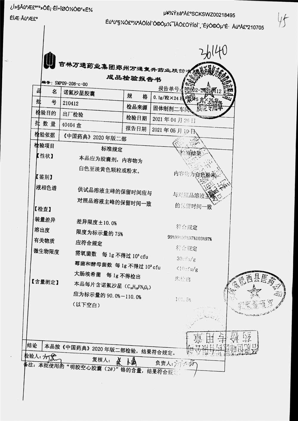 | 诺氟沙星胶囊 | 0.1g*12粒*2板 | 210711 | 查看详情 |