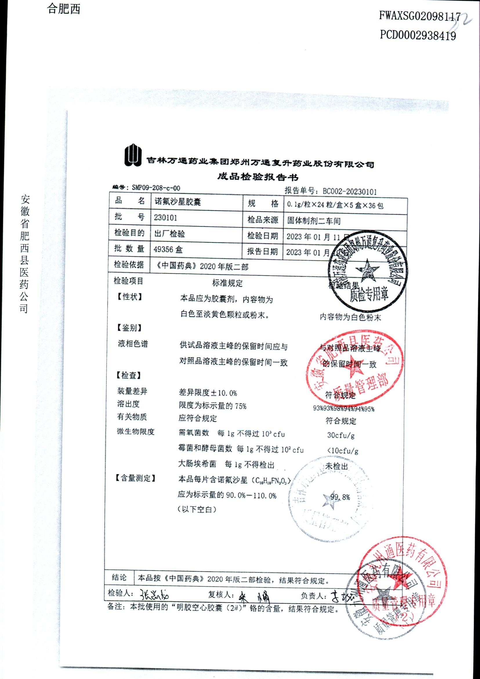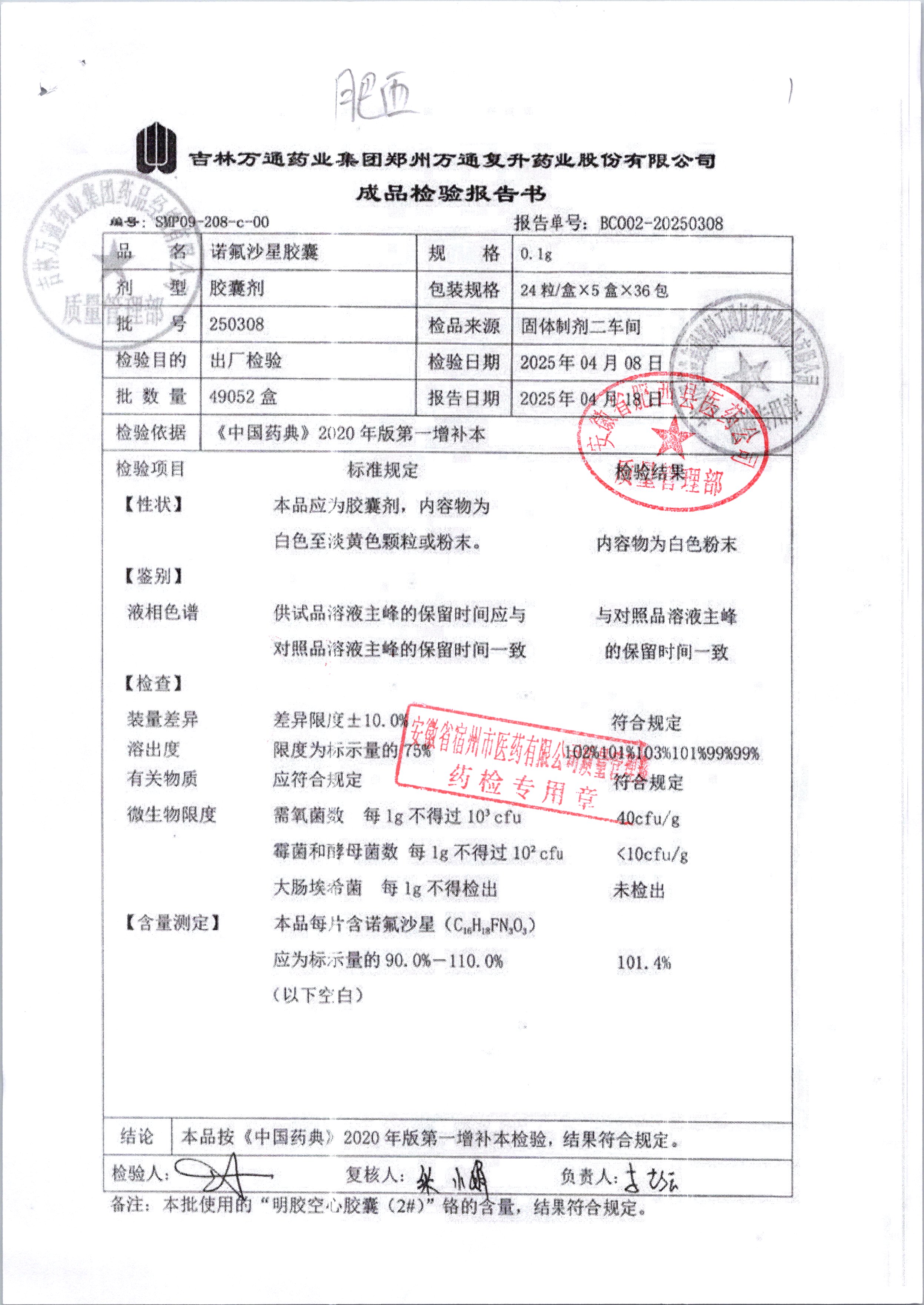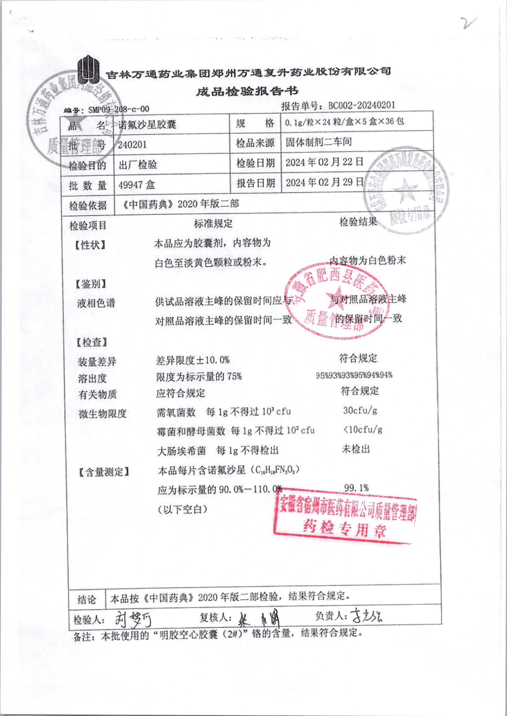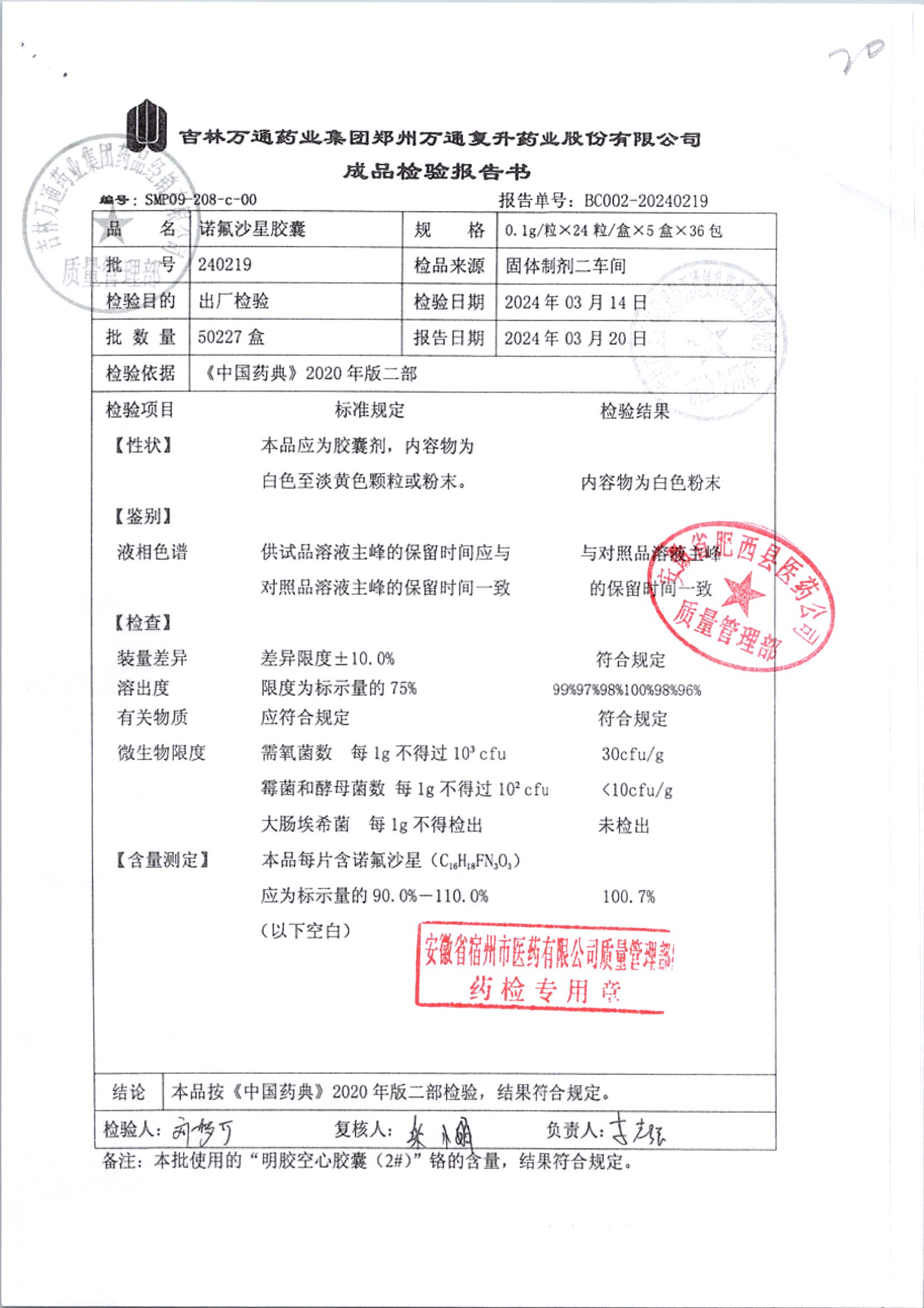 | 诺氟沙星胶囊 | 0.1g*12粒*2板 | 240201 | 查看详情 |