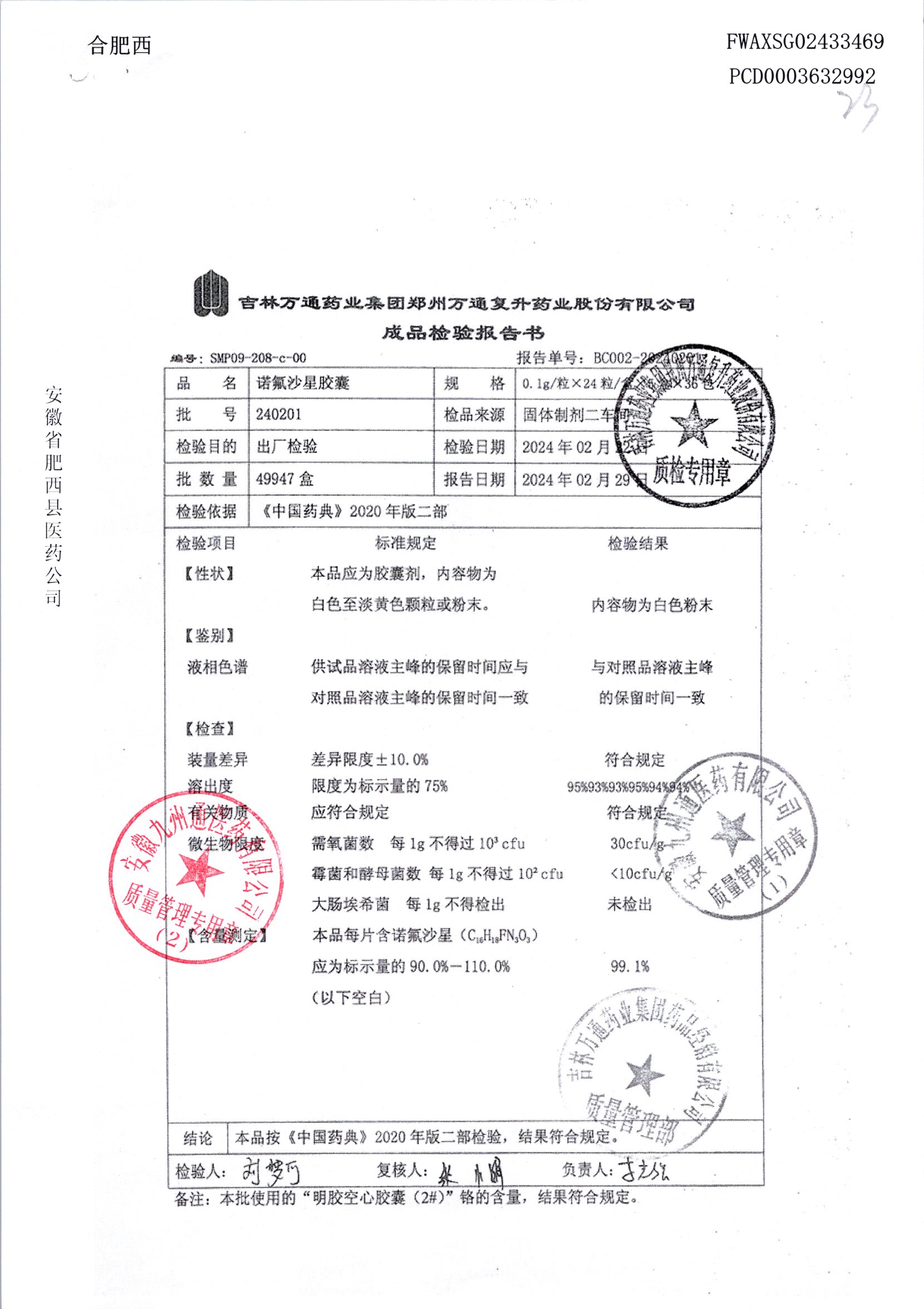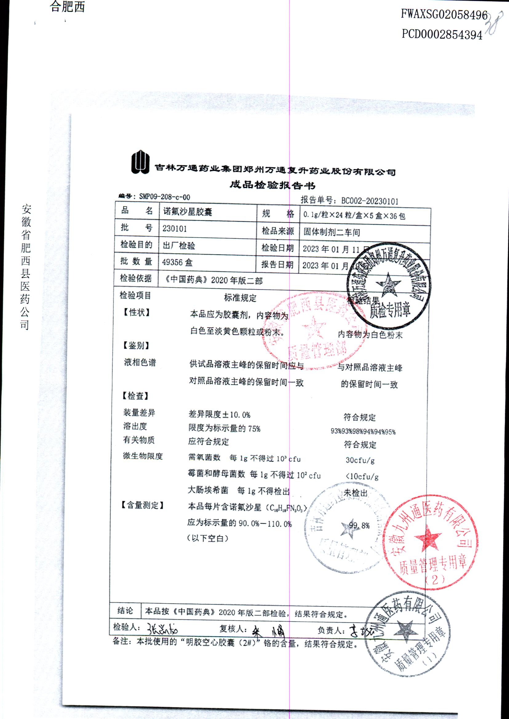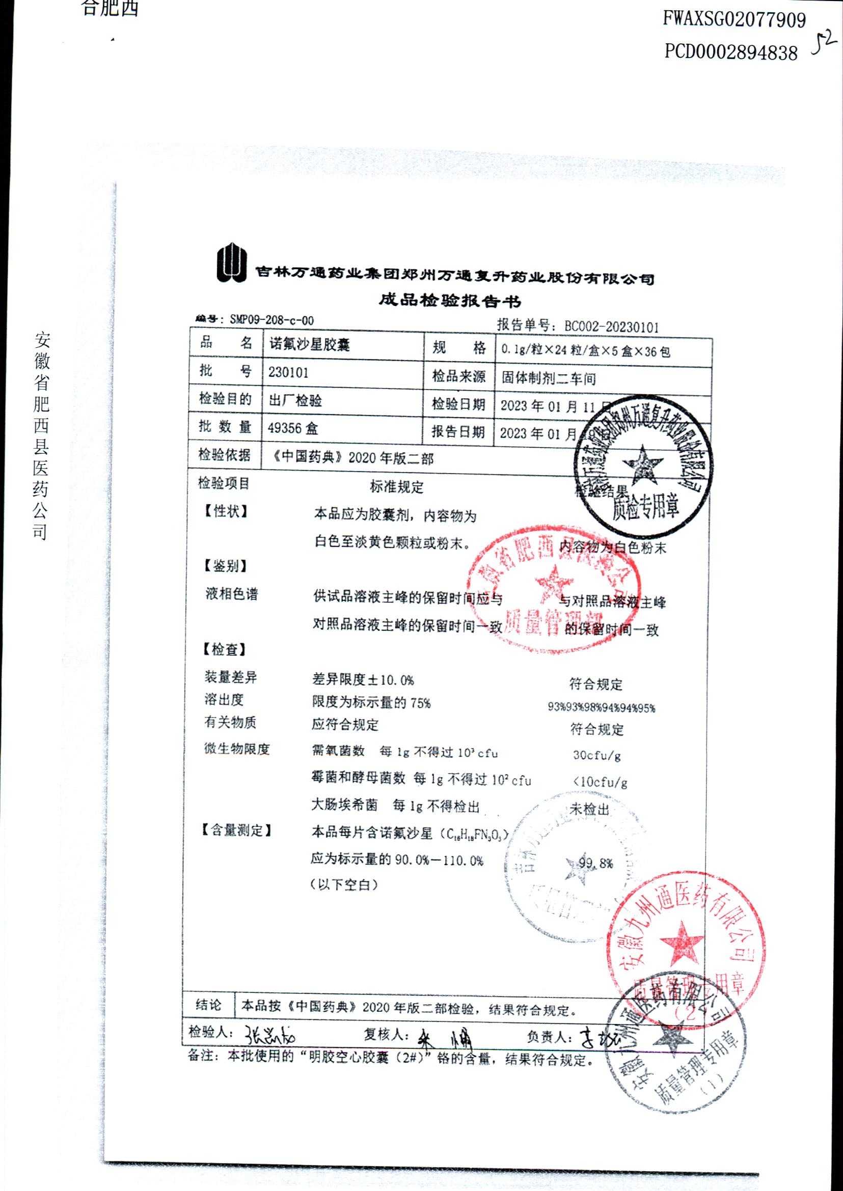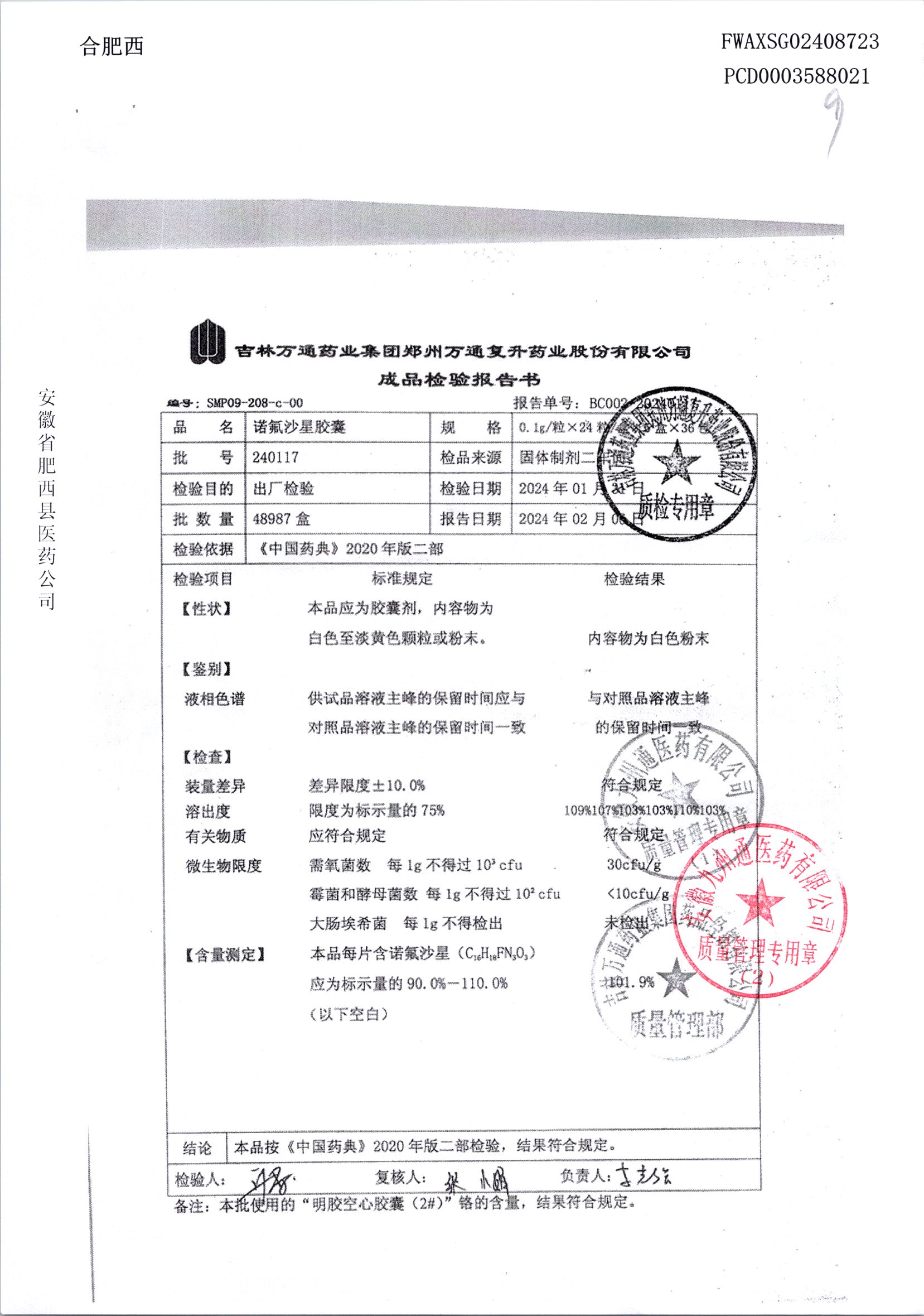 | 诺氟沙星胶囊 | 0.1g*12粒*2板 | 240201 | 查看详情 |