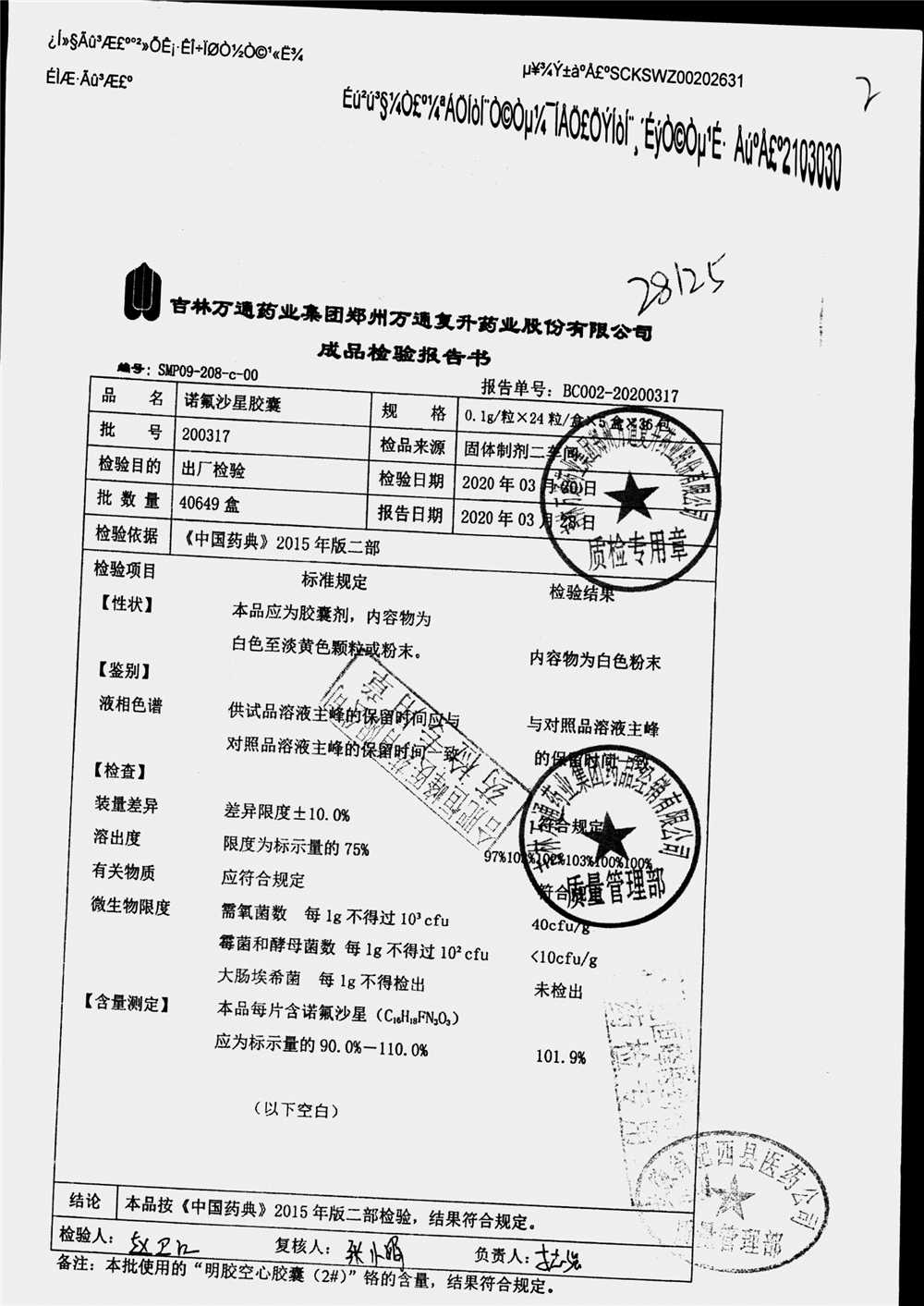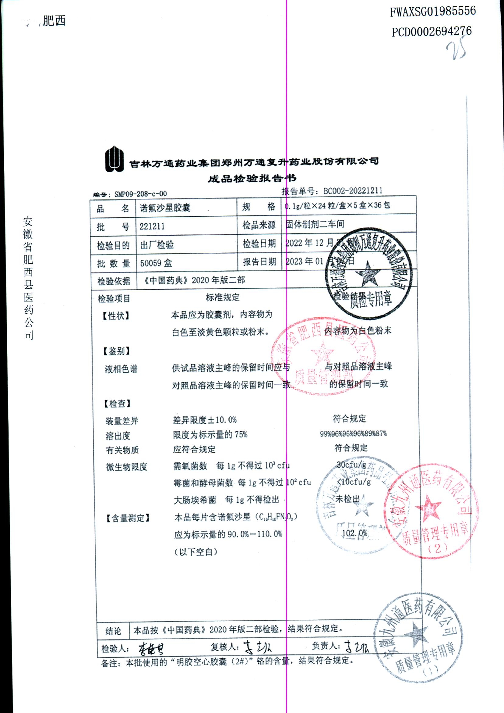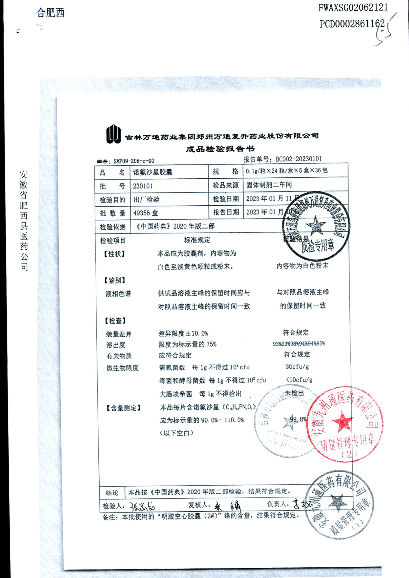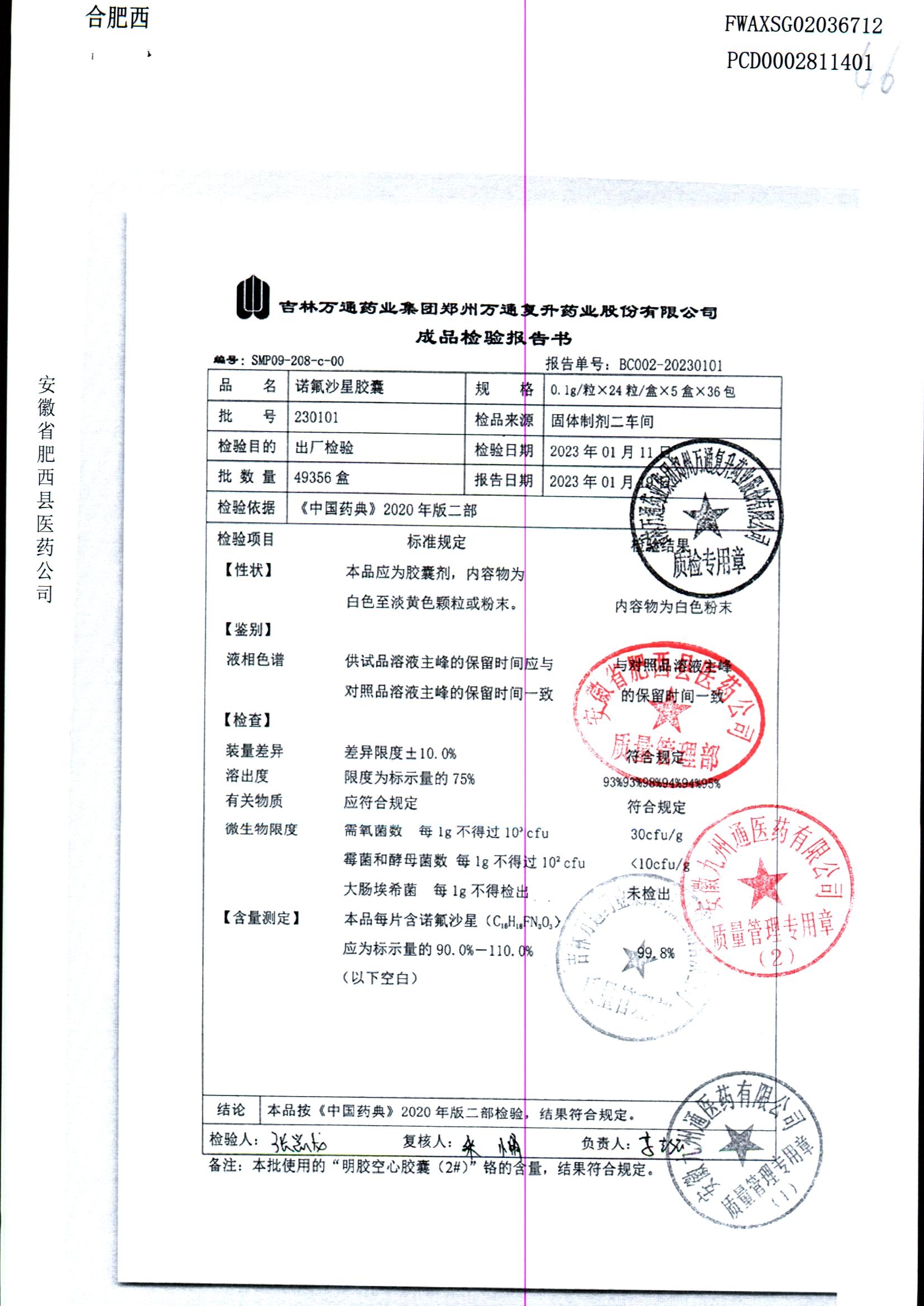 | 诺氟沙星胶囊 | 0.1g*12粒*2板 | 240201 | 查看详情 |