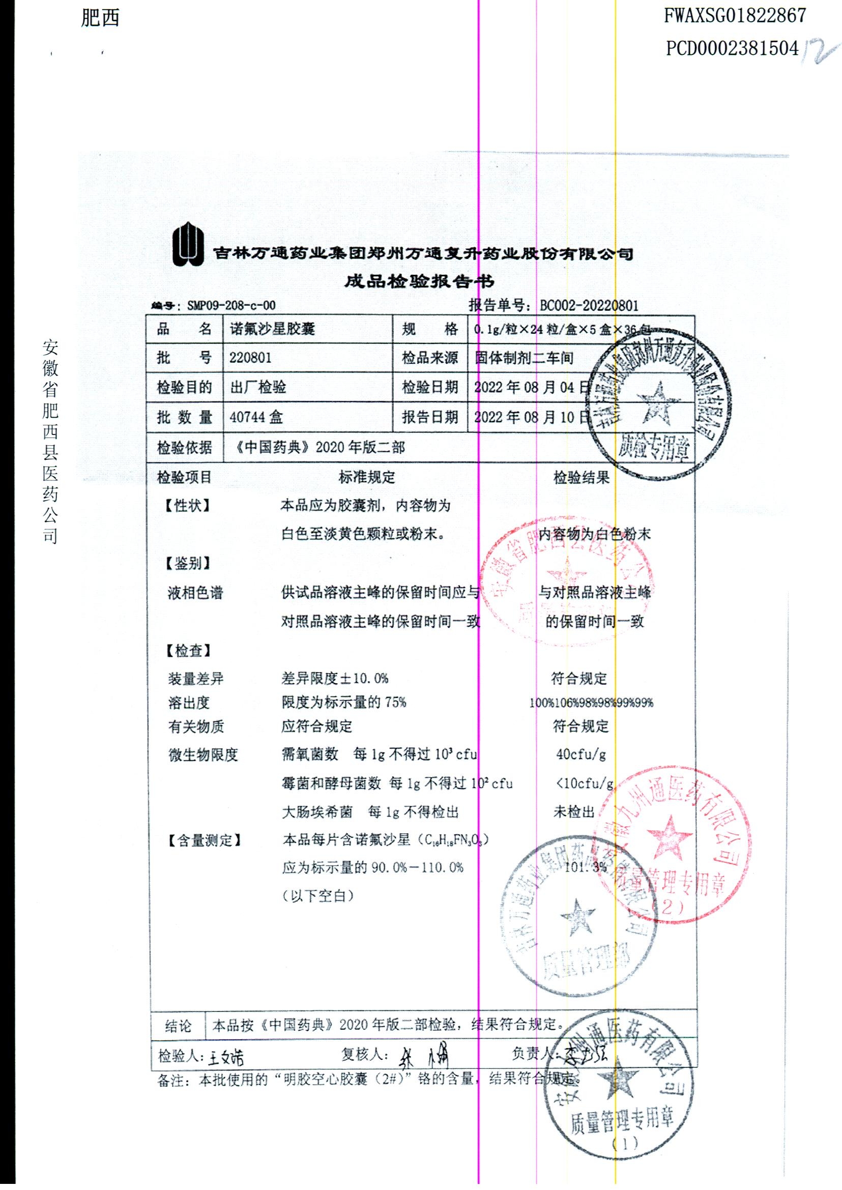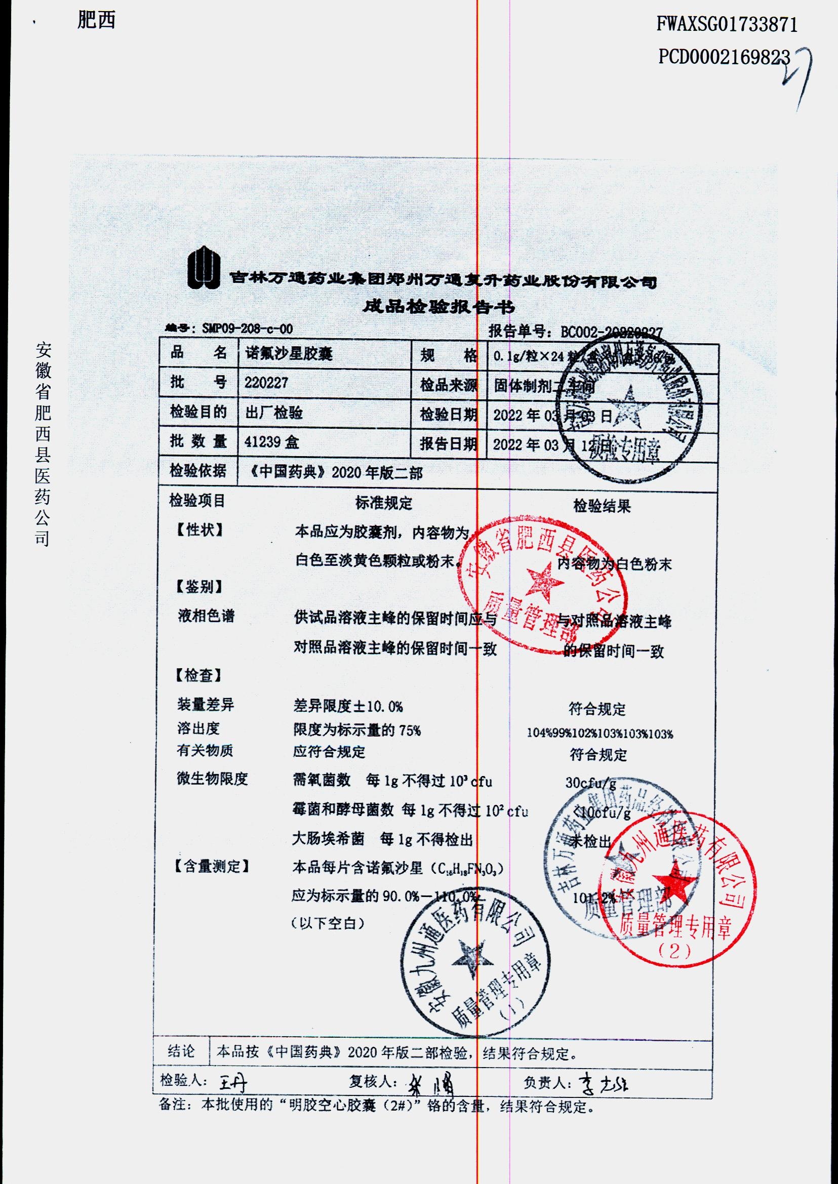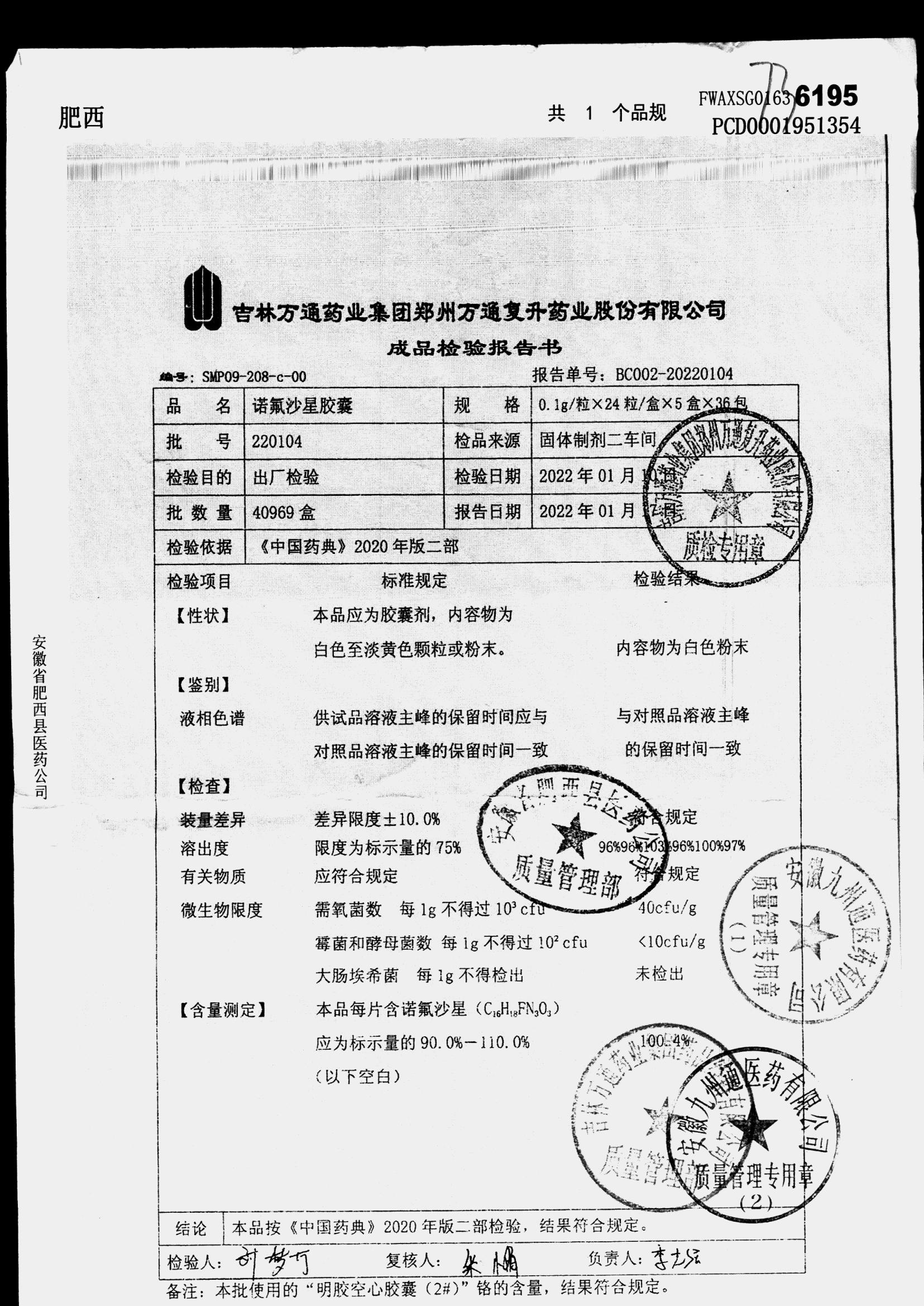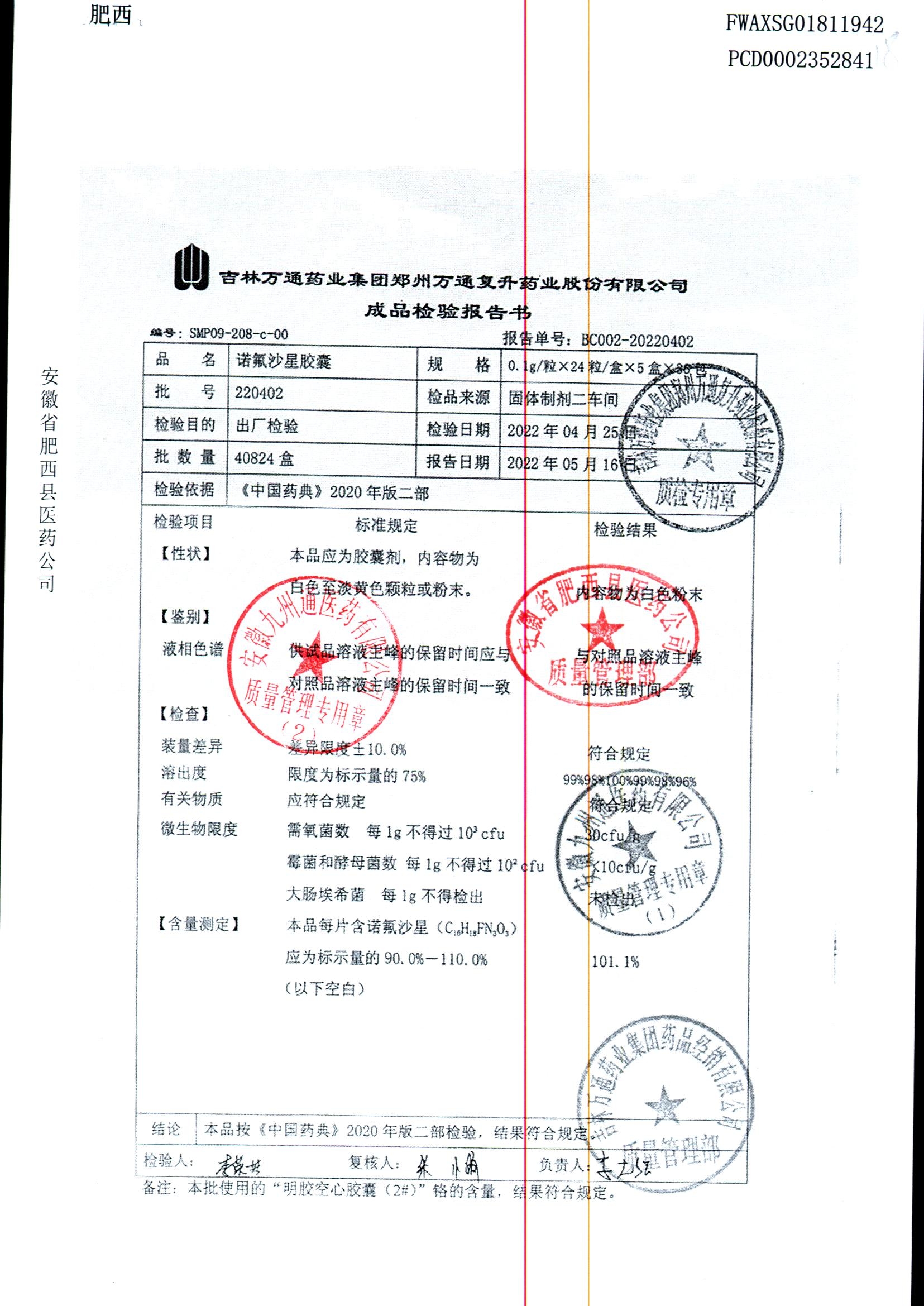 | 诺氟沙星胶囊 | 0.1g*12粒*2板 | 220801 | 查看详情 |