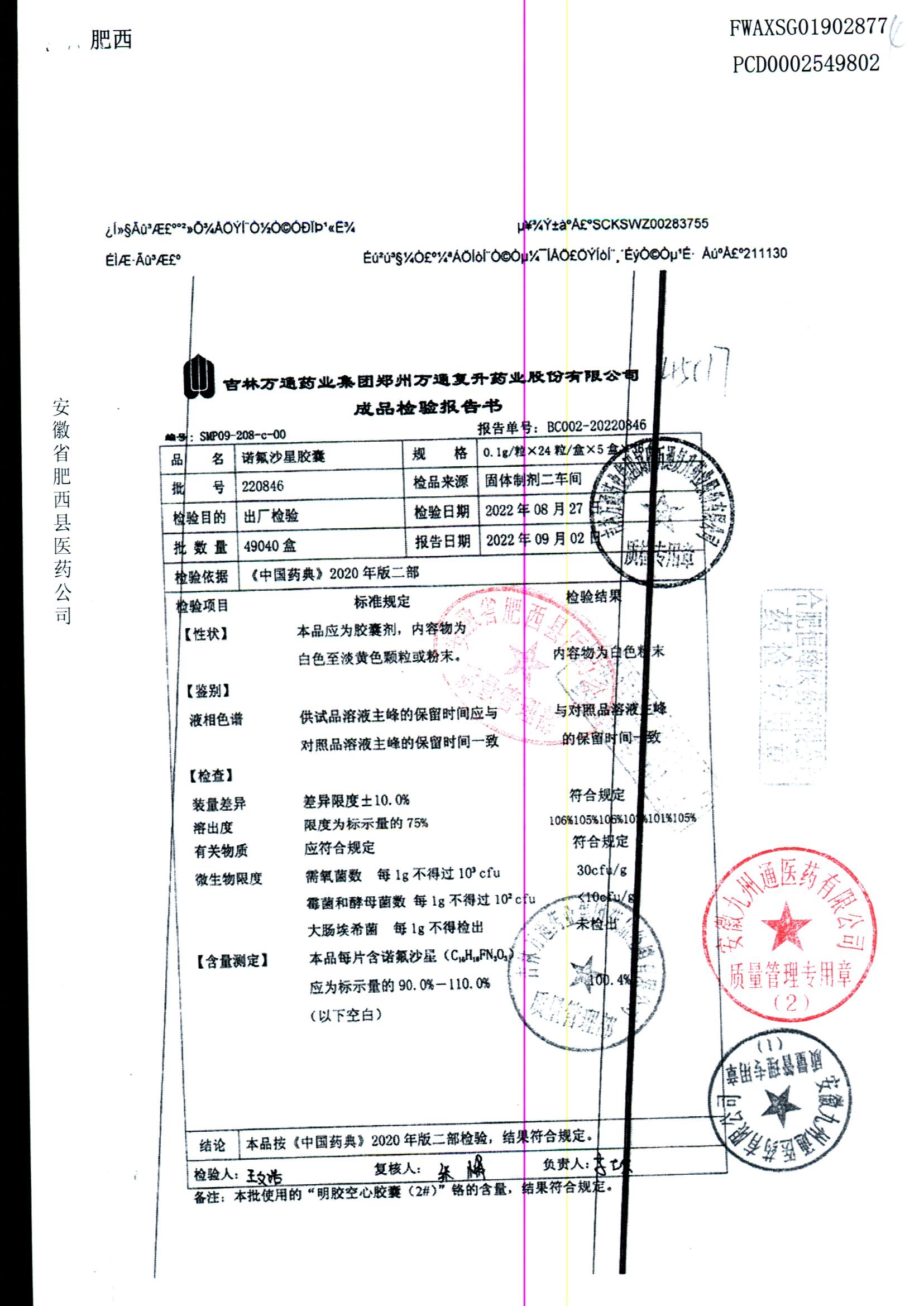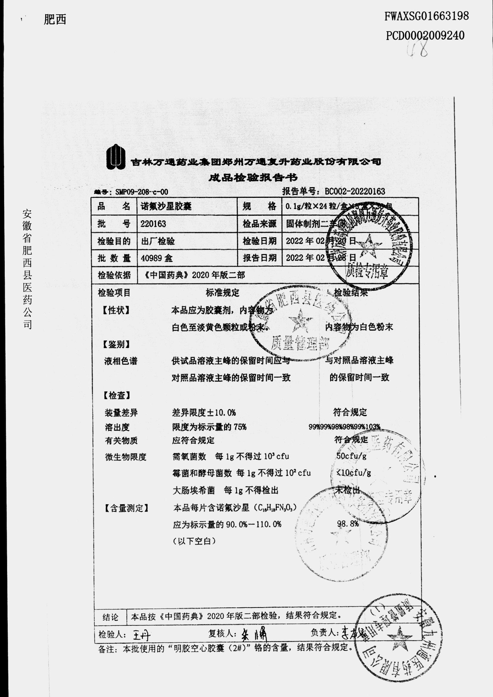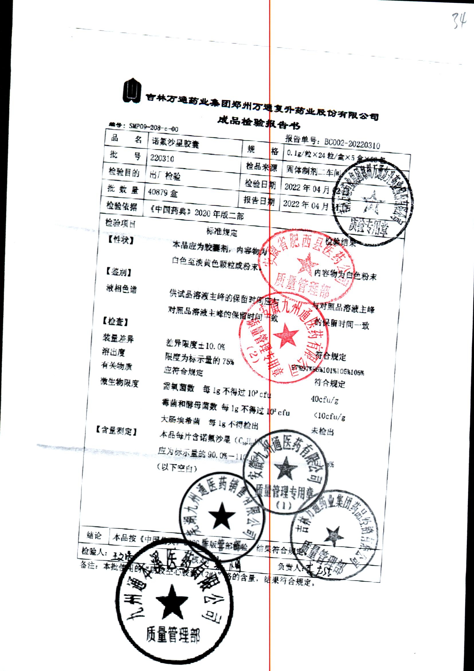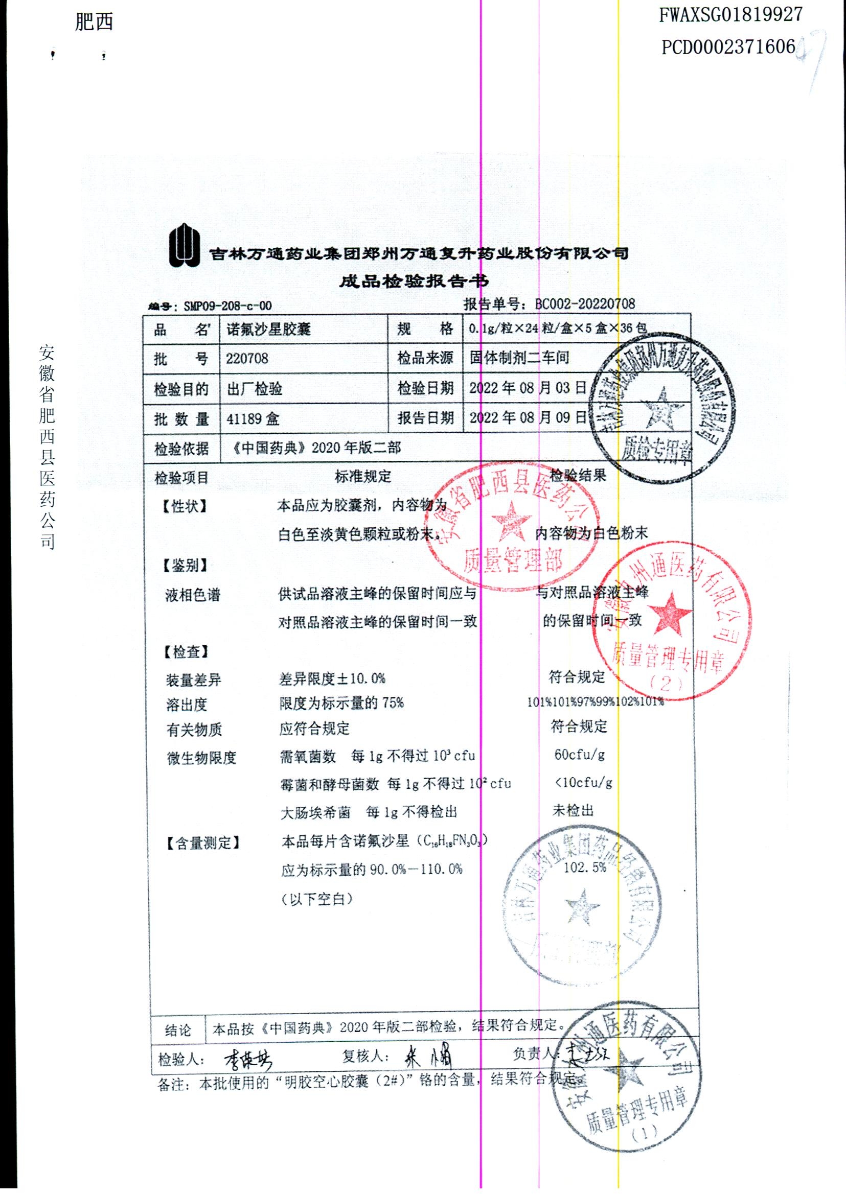 | 诺氟沙星胶囊 | 0.1g*12粒*2板 | 220801 | 查看详情 |