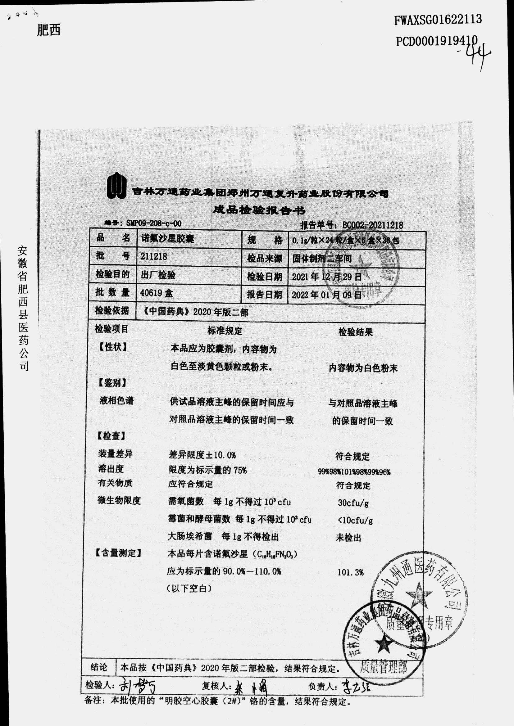 | 诺氟沙星胶囊 | 0.1g*12粒*2板 | 211218 | 查看详情 |