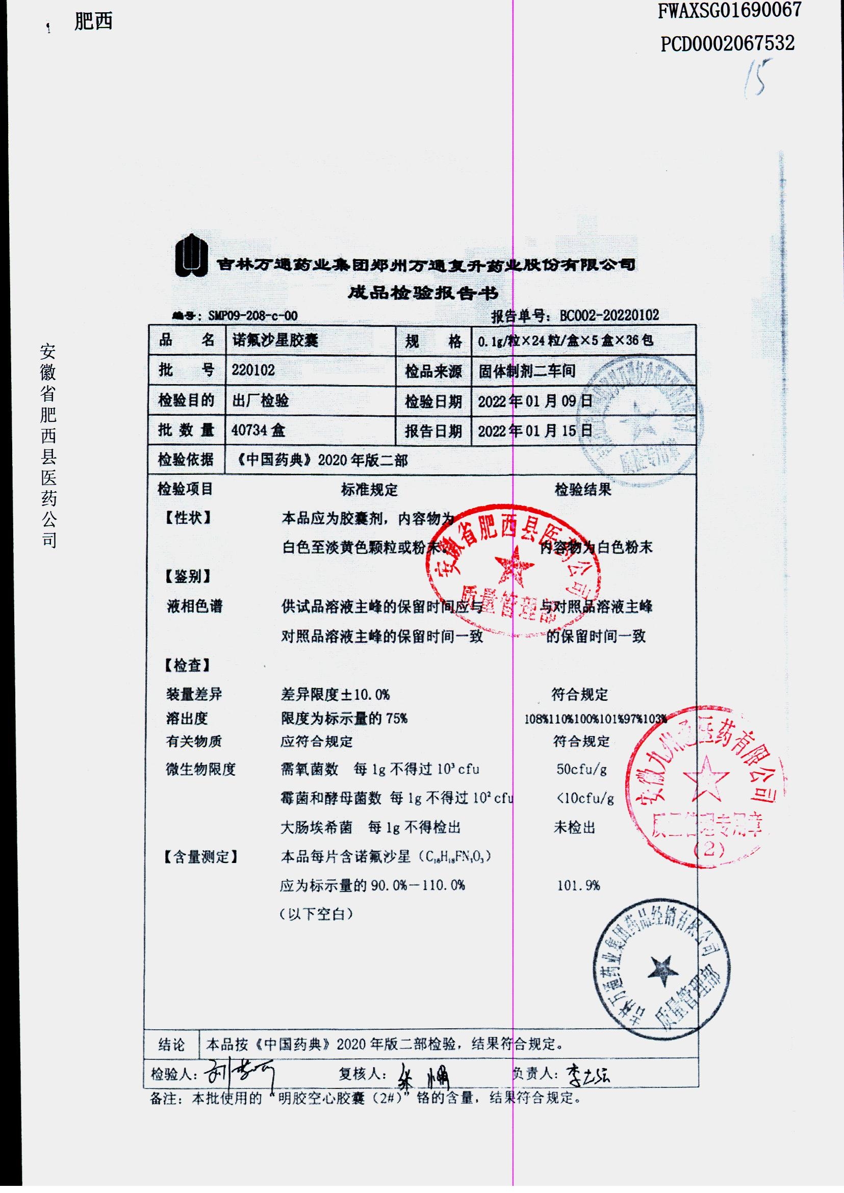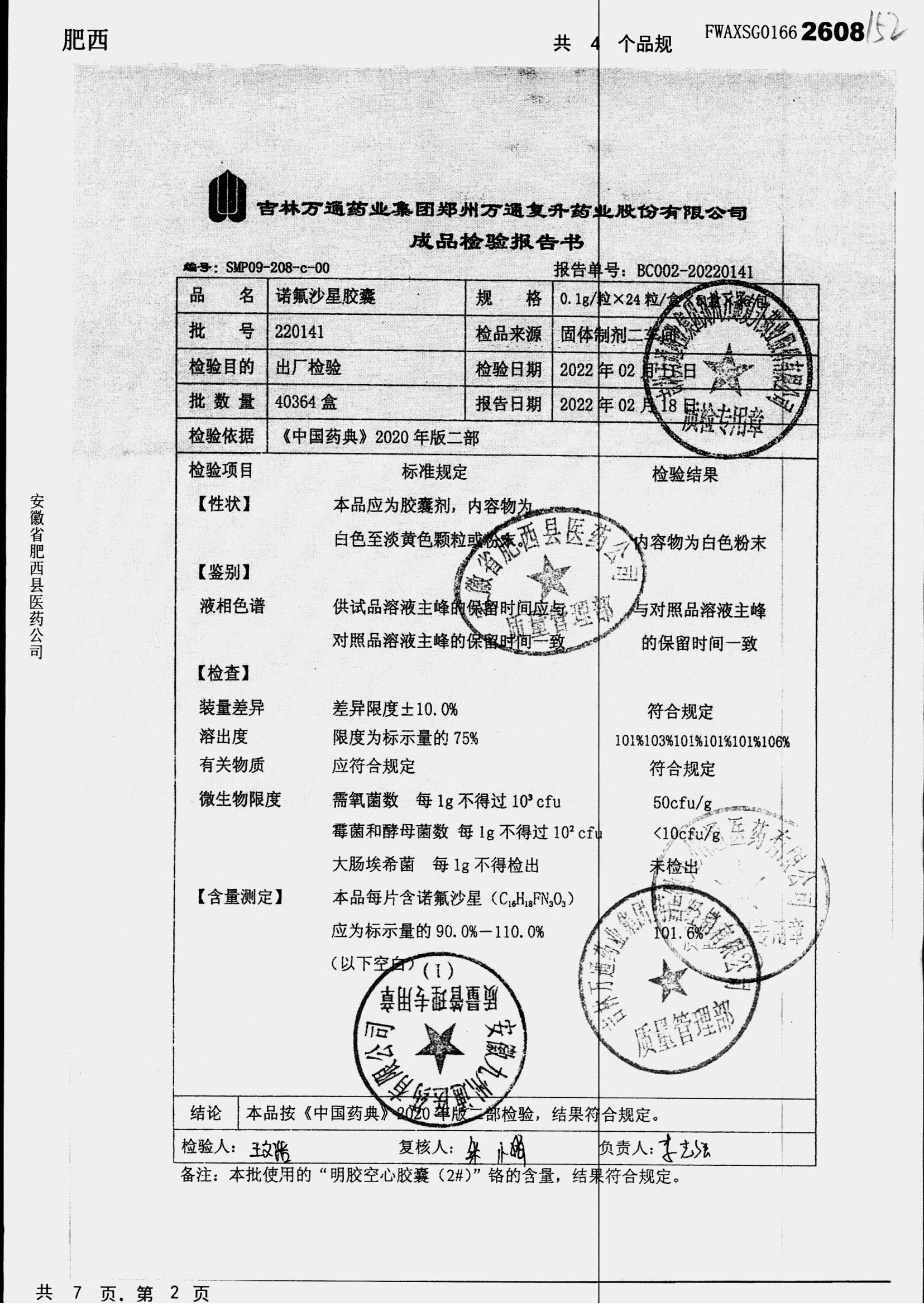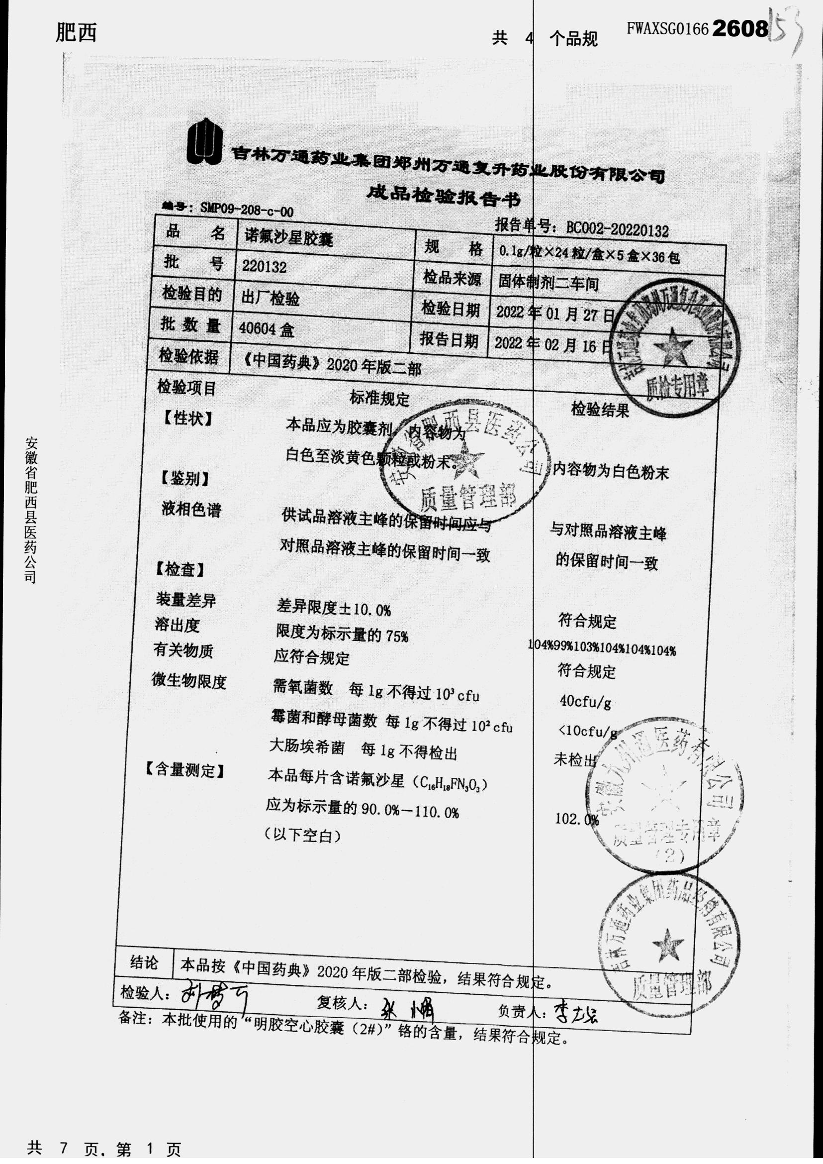 | 诺氟沙星胶囊 | 0.1g*12粒*2板 | 220708 | 查看详情 |