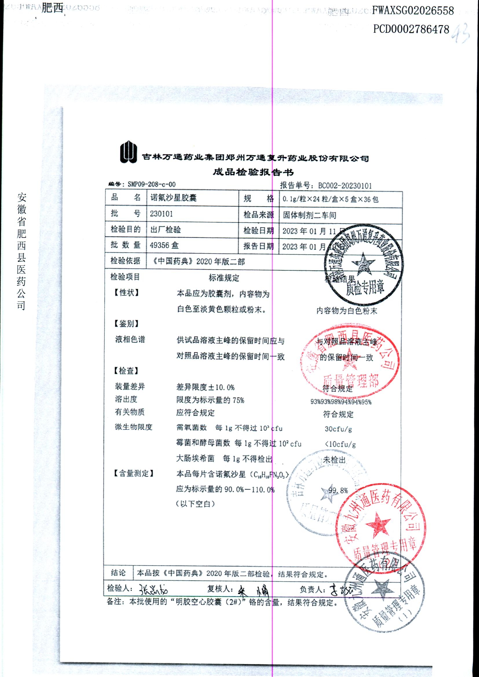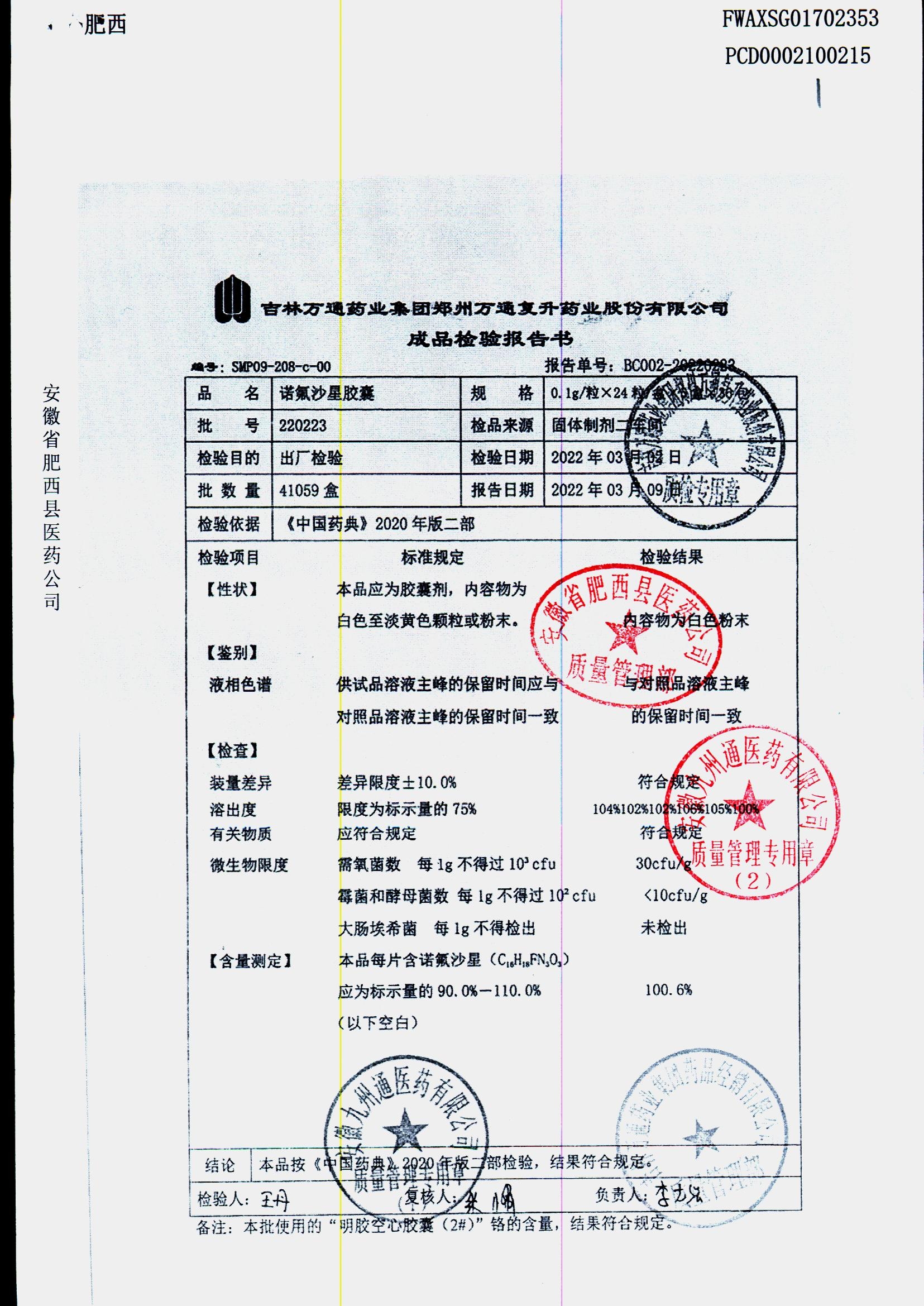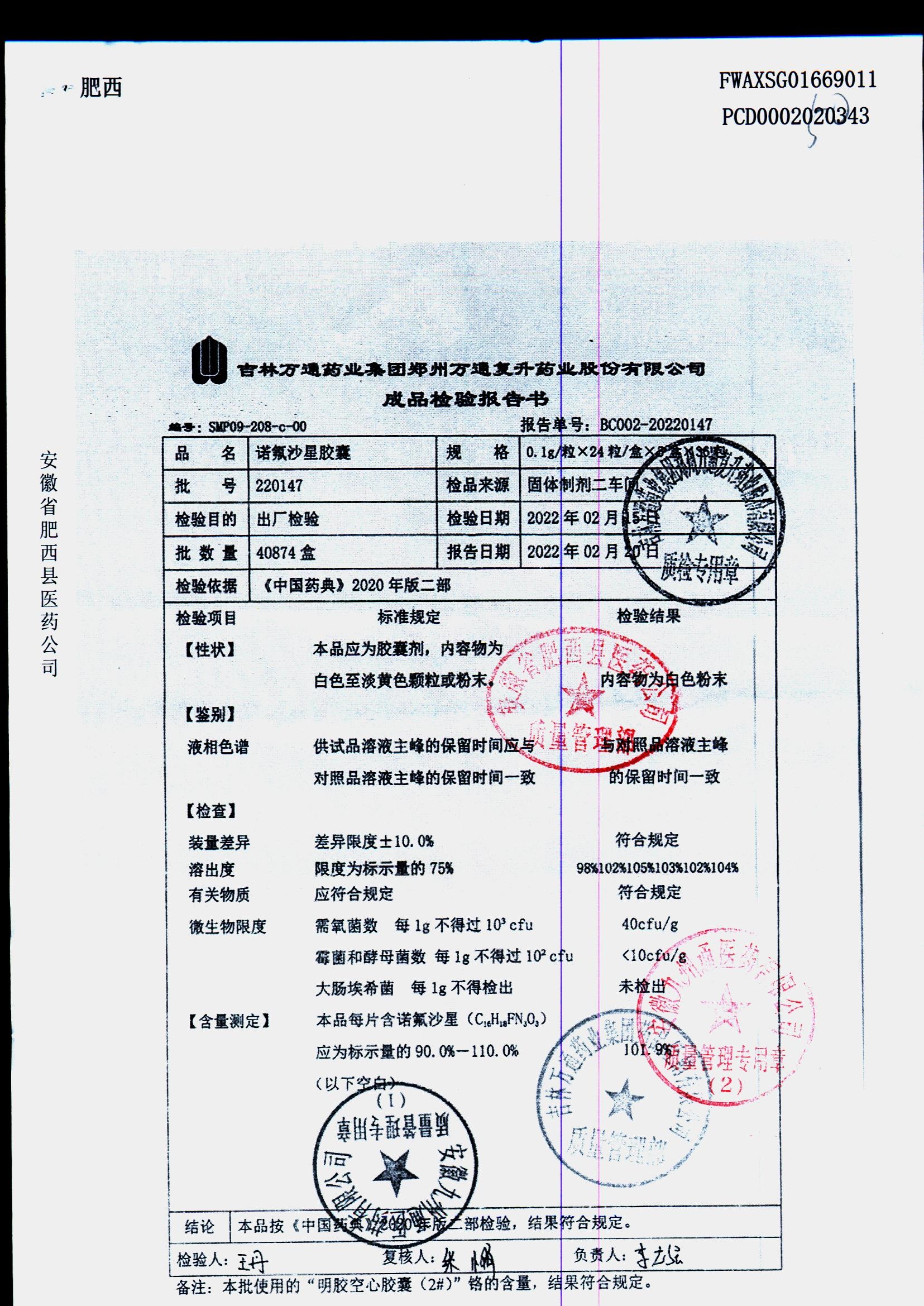 | 诺氟沙星胶囊 | 0.1g*12粒*2板 | 220223 | 查看详情 |