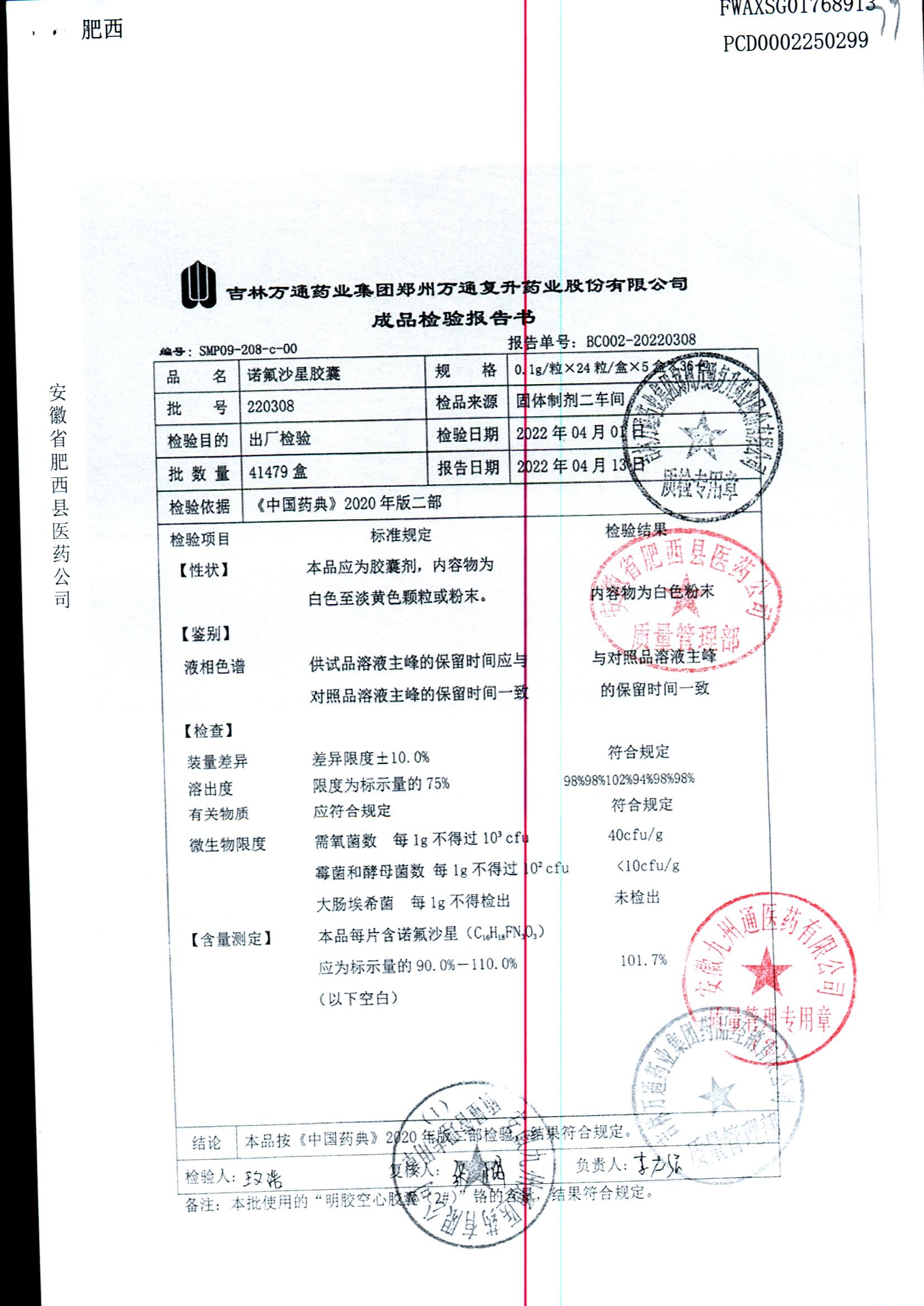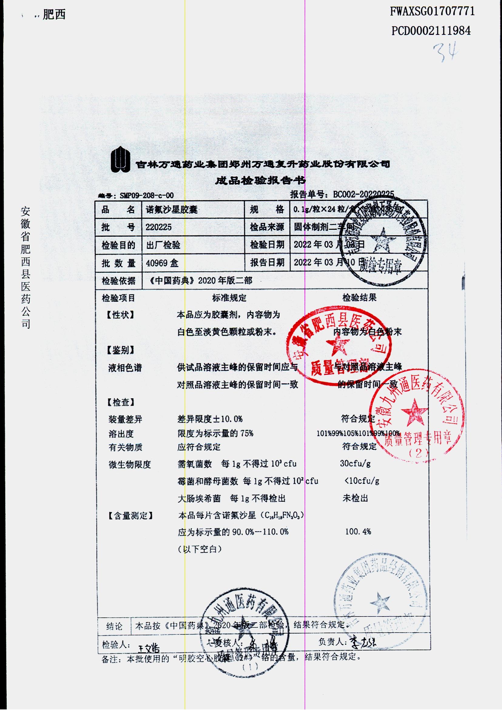 | 诺氟沙星胶囊 | 0.1g*12粒*2板 | 220225 | 查看详情 |