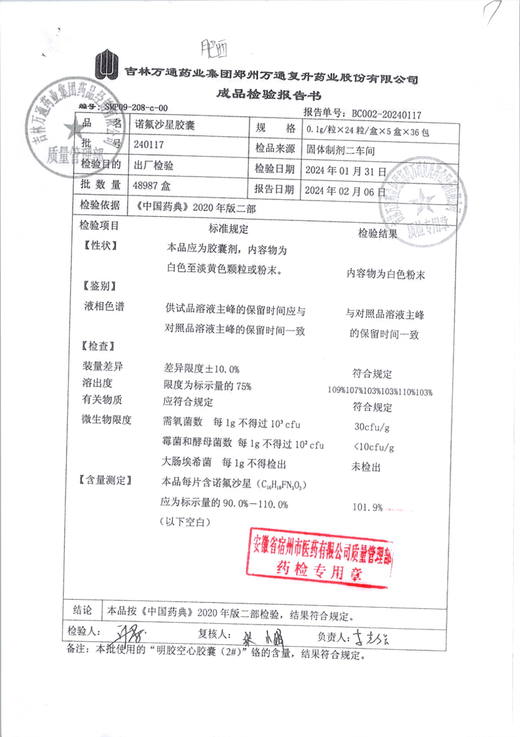 | 诺氟沙星胶囊 | 0.1g*12粒*2板 | 240117 | 查看详情 |