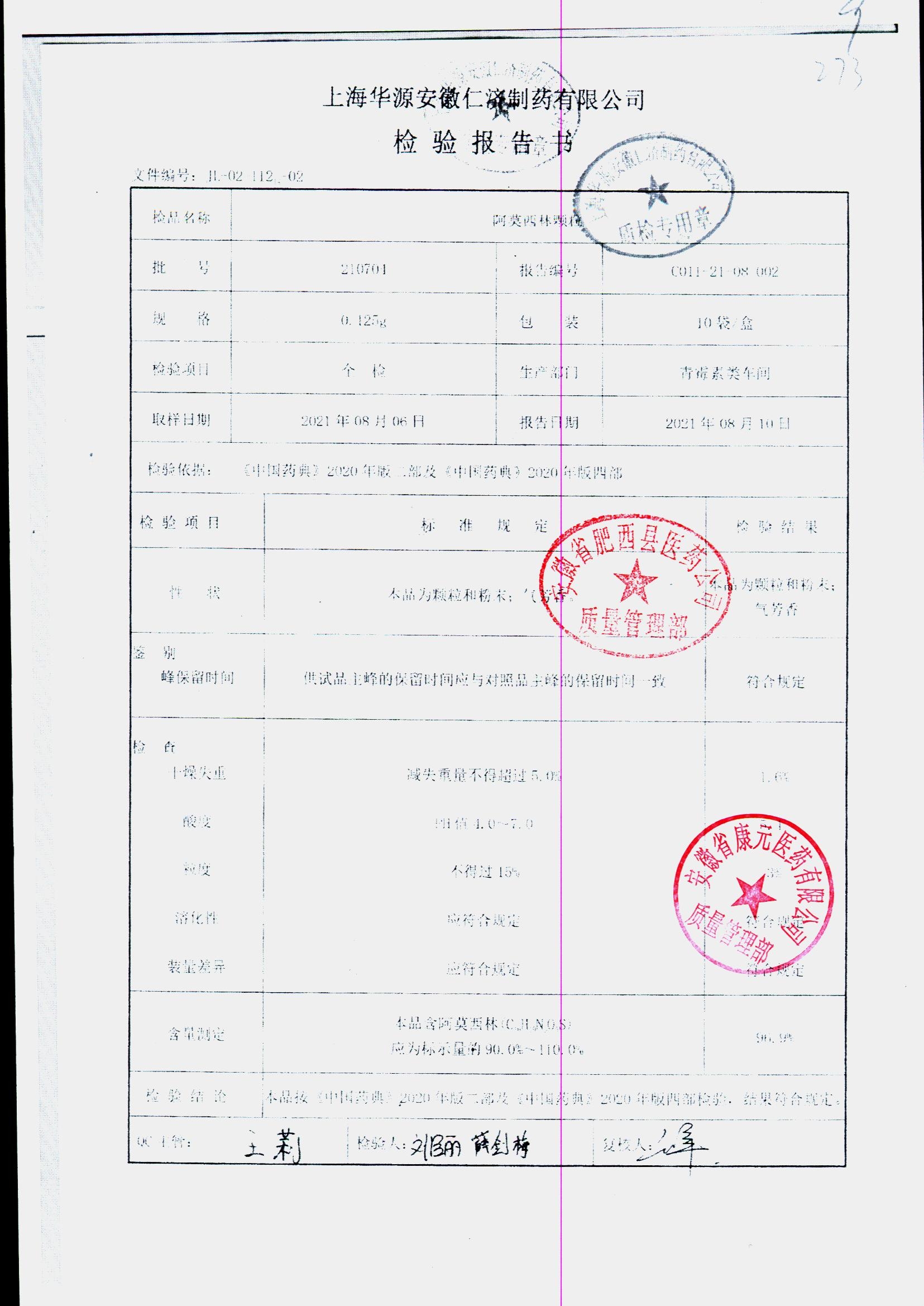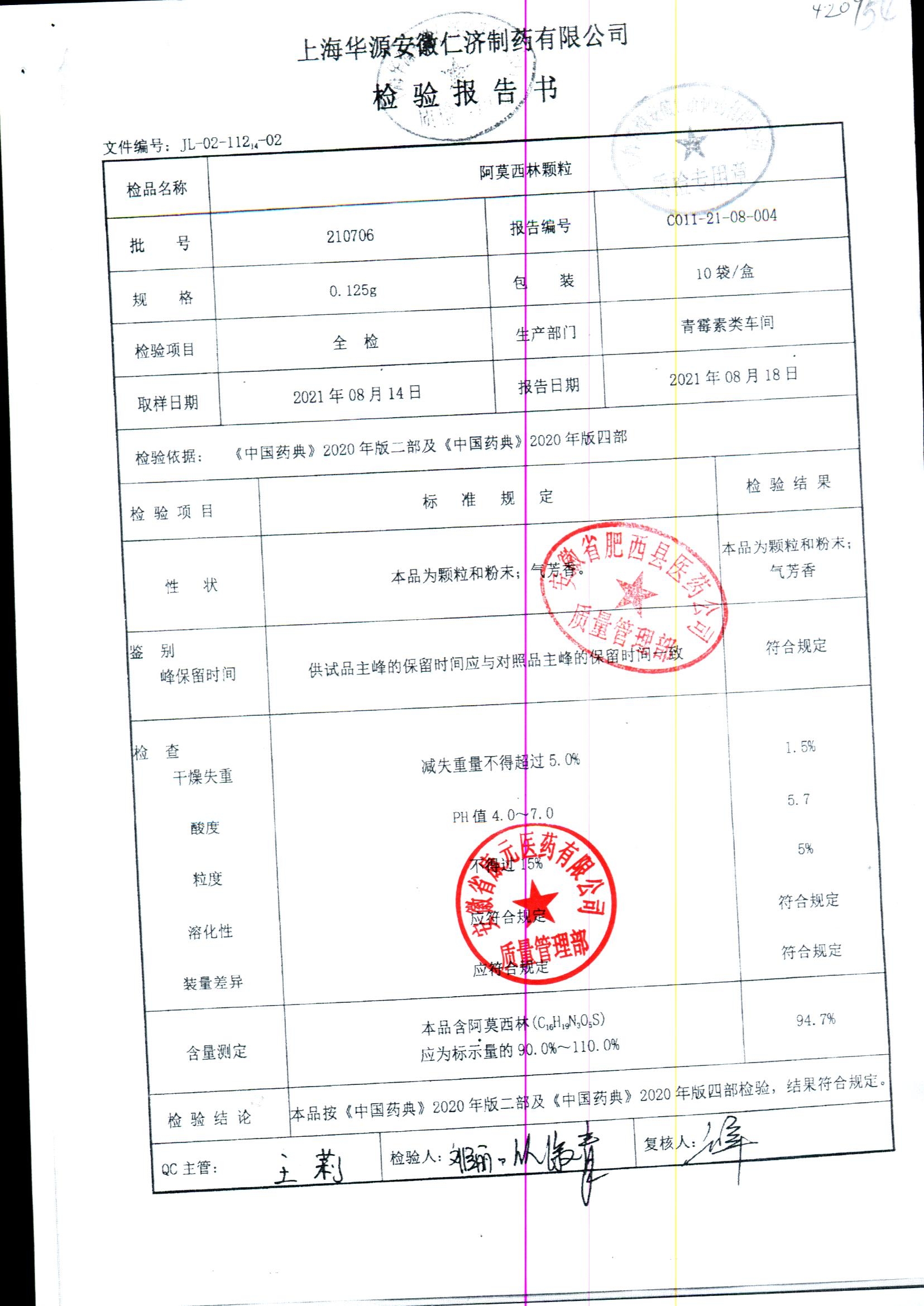 | 阿莫西林颗粒 | 0.125G*10袋 | 210706 | 查看详情 |