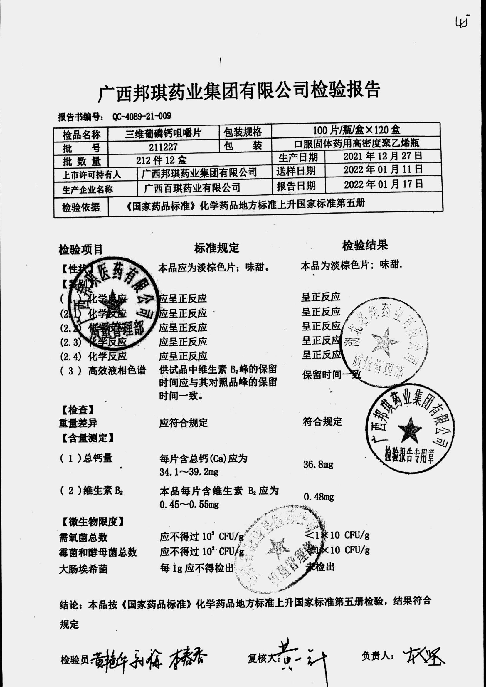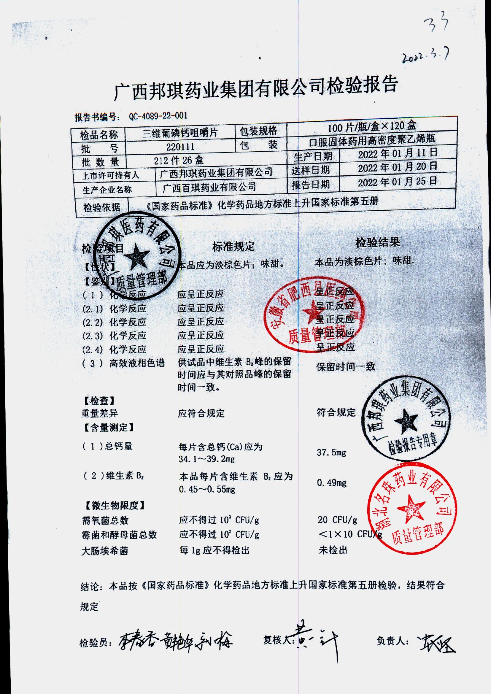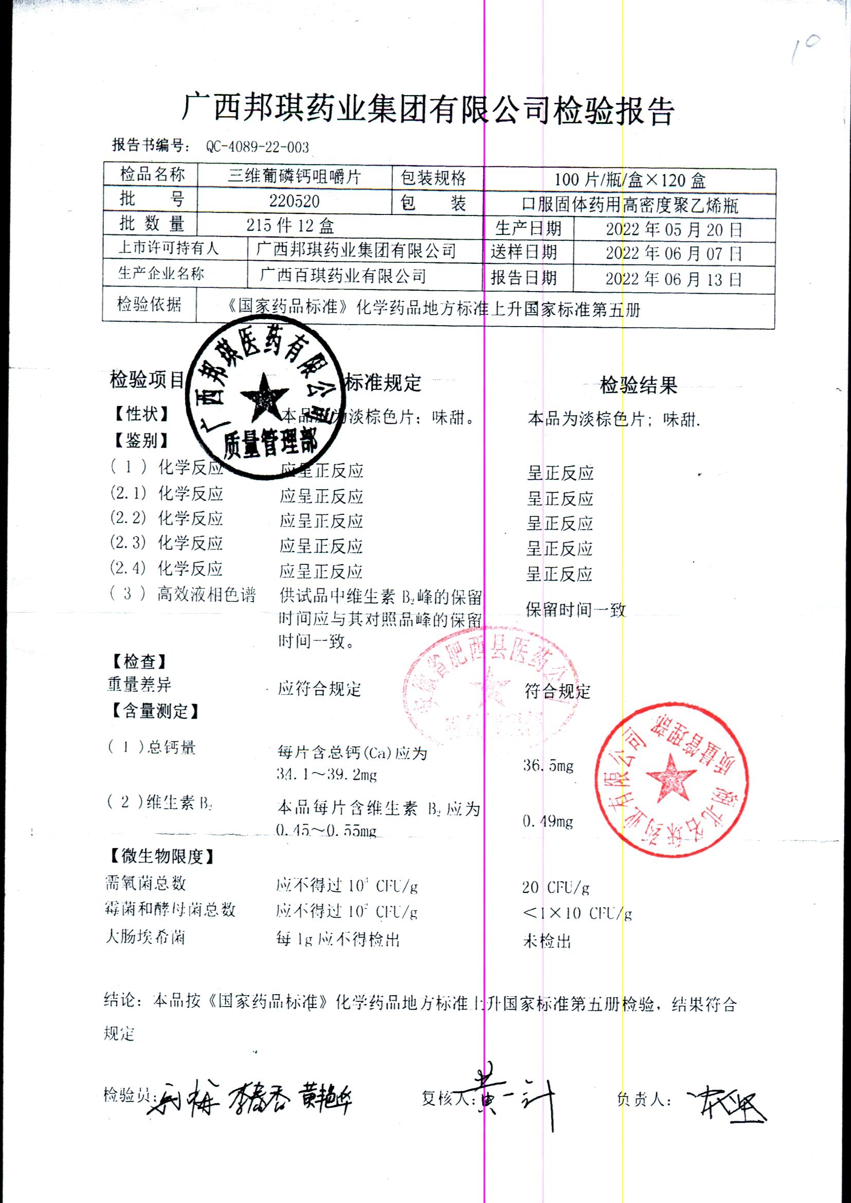 | 三维葡磷钙咀嚼片 | 100片 | 220520 | 查看详情 |