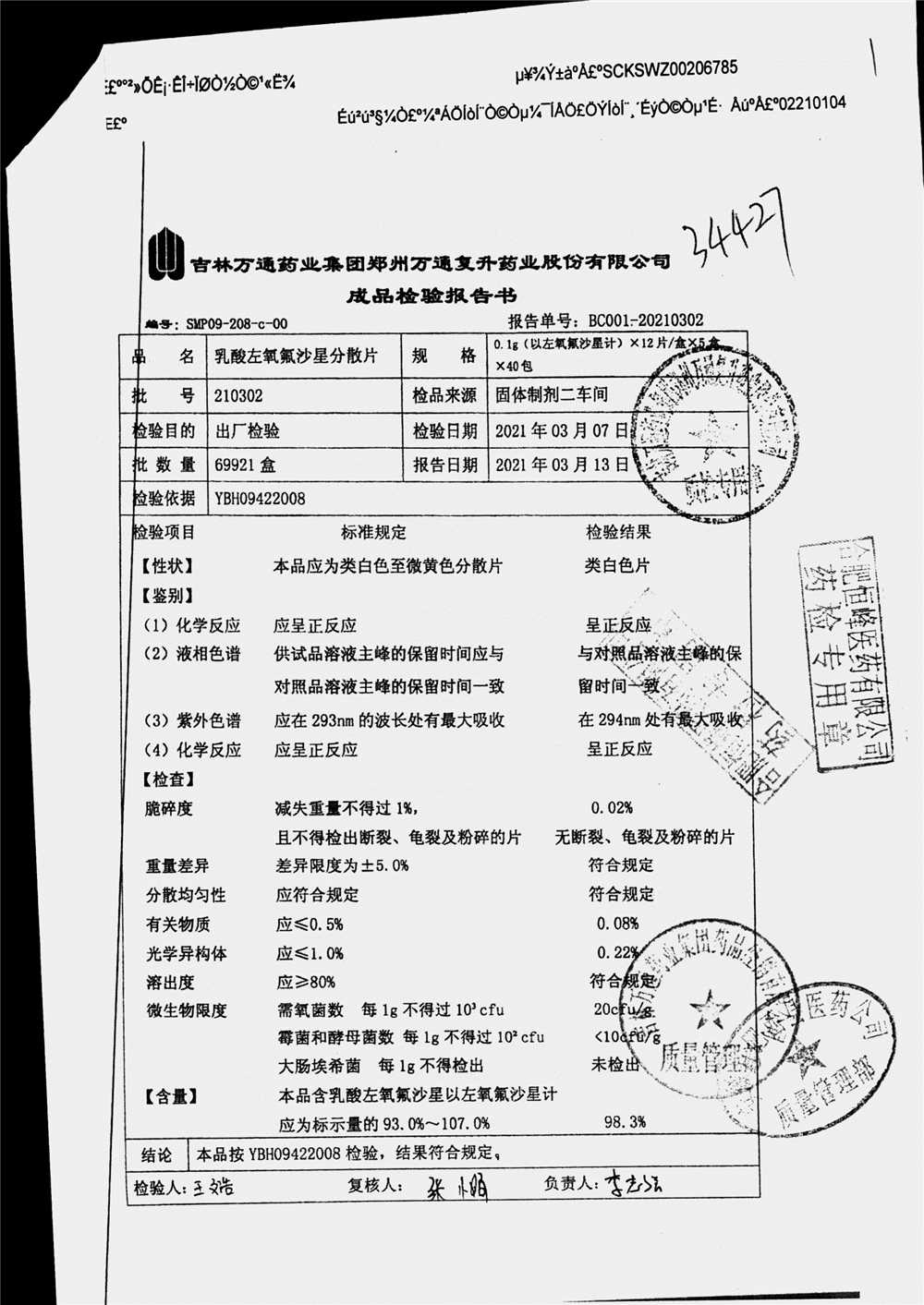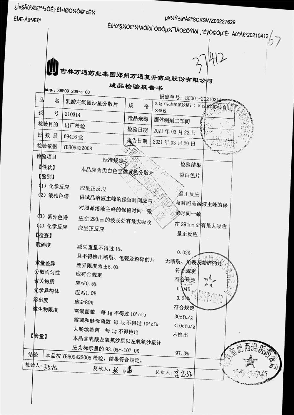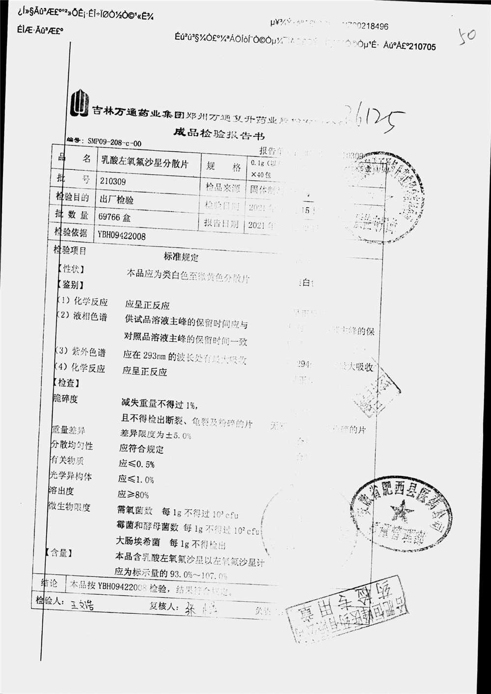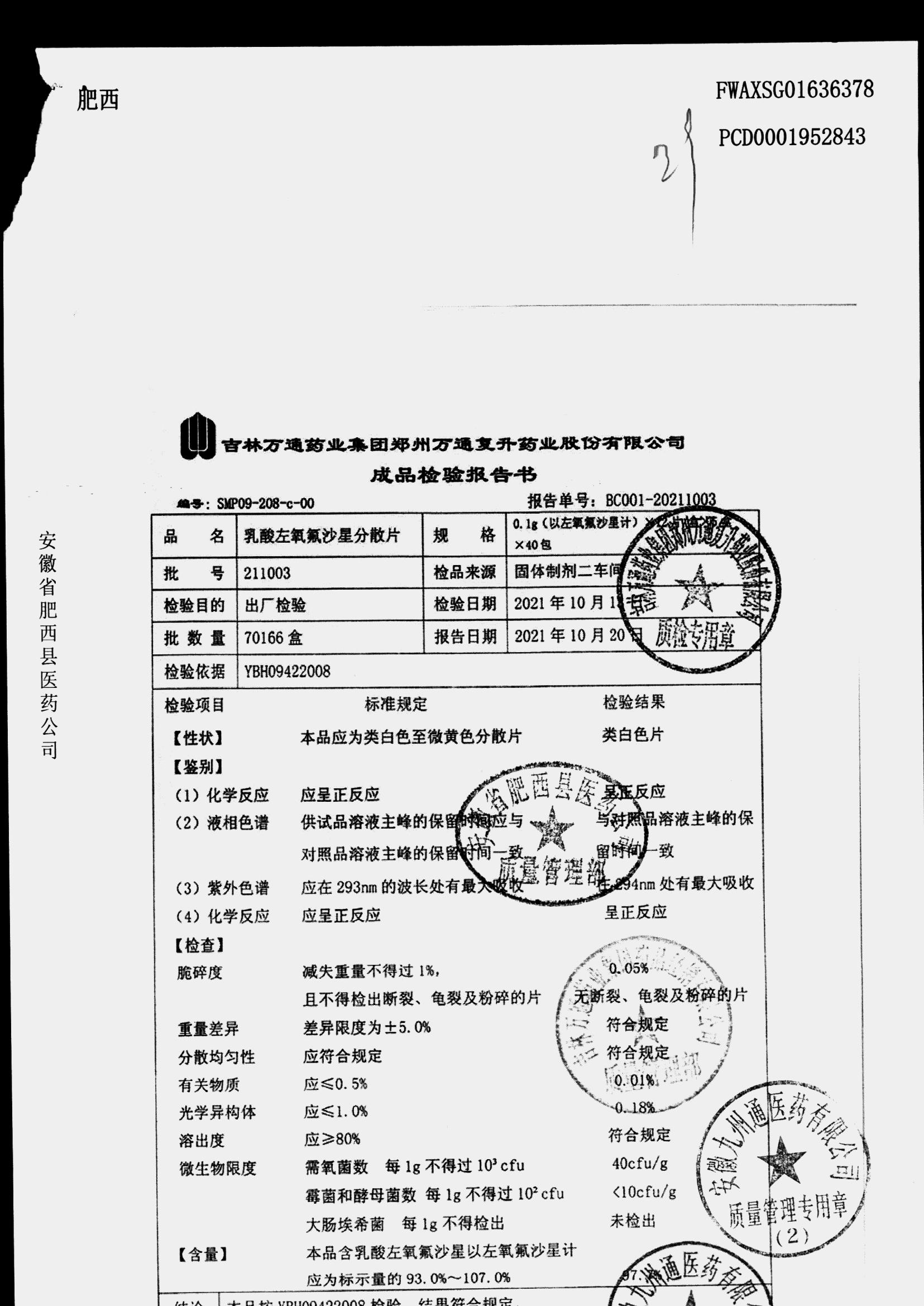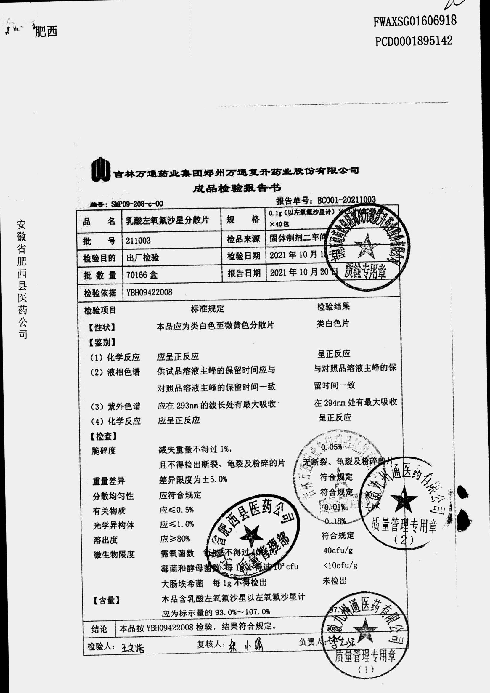 | 乳酸左氧氟沙星分散片 | 0.1g*12*5 | 210309 | 查看详情 |