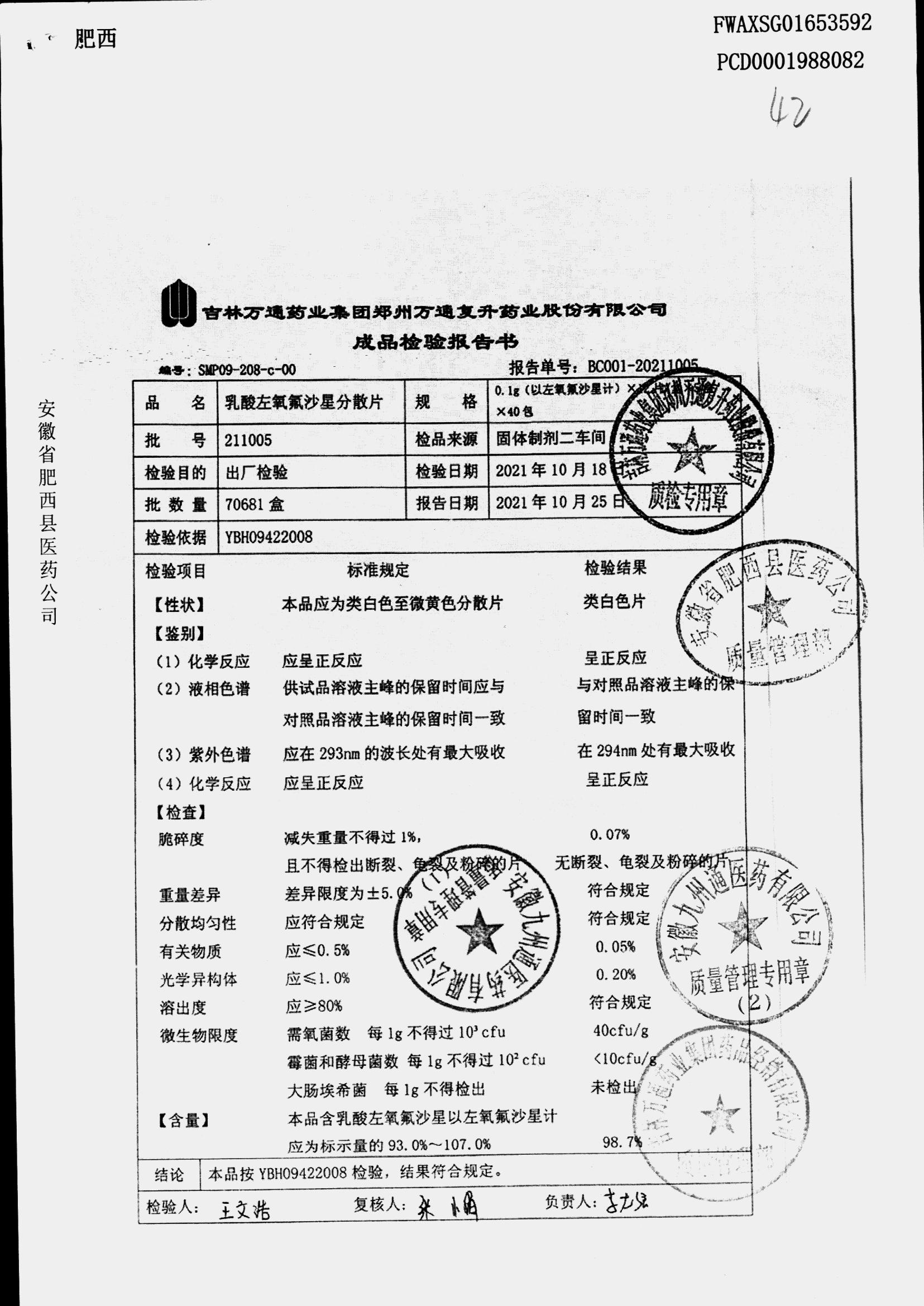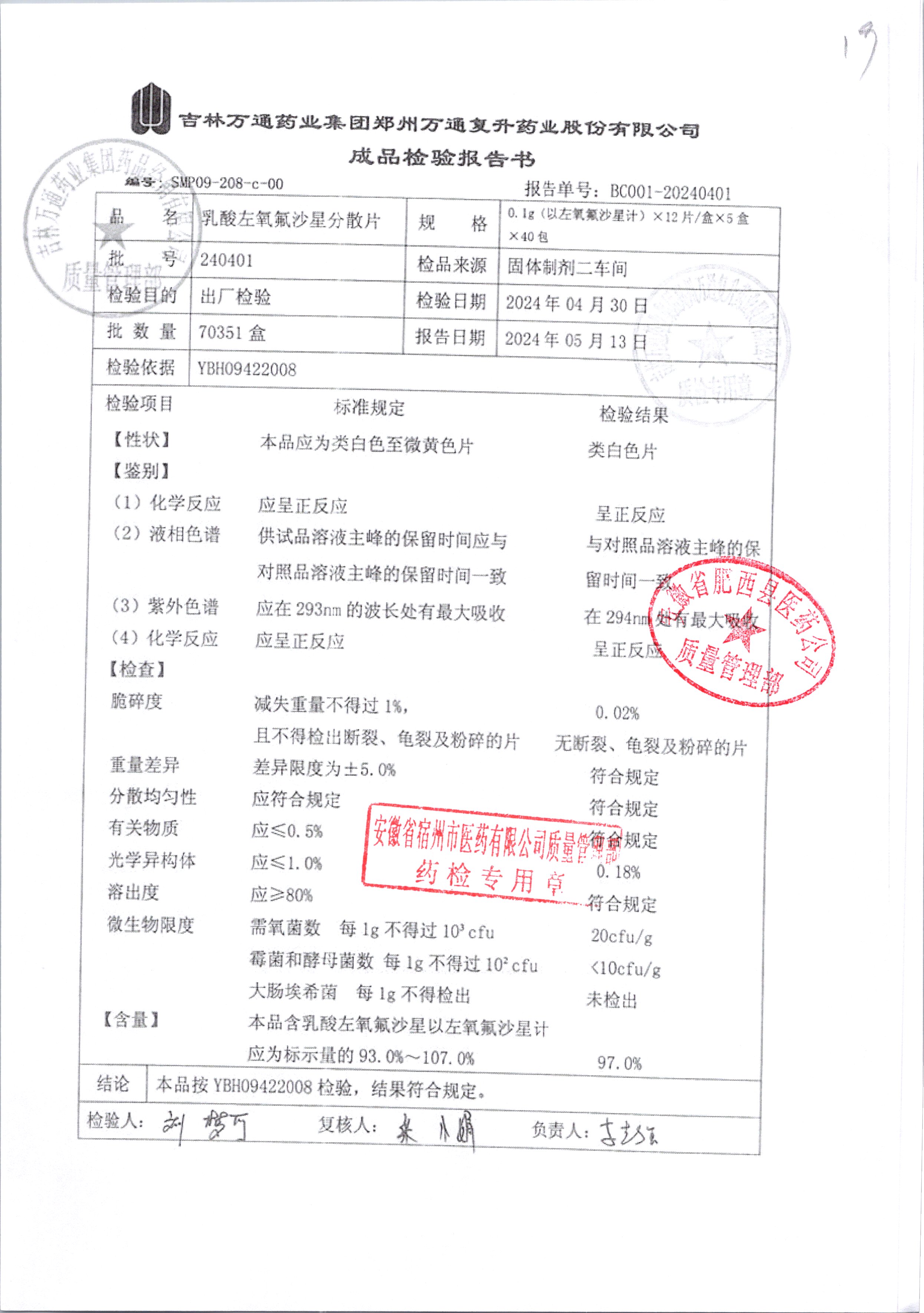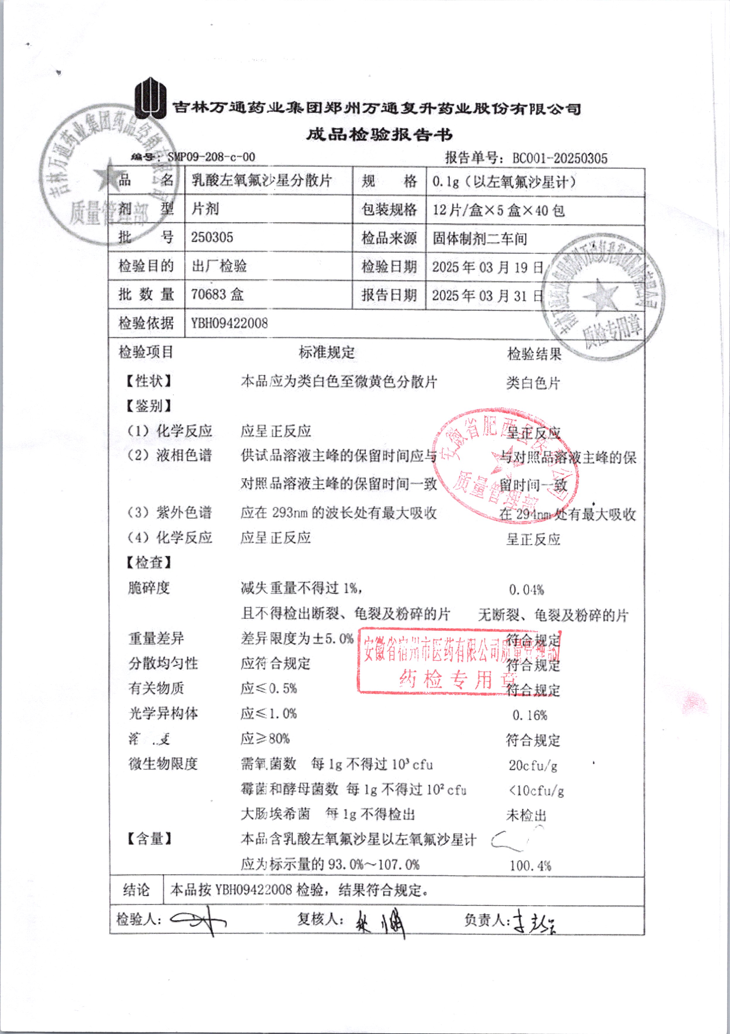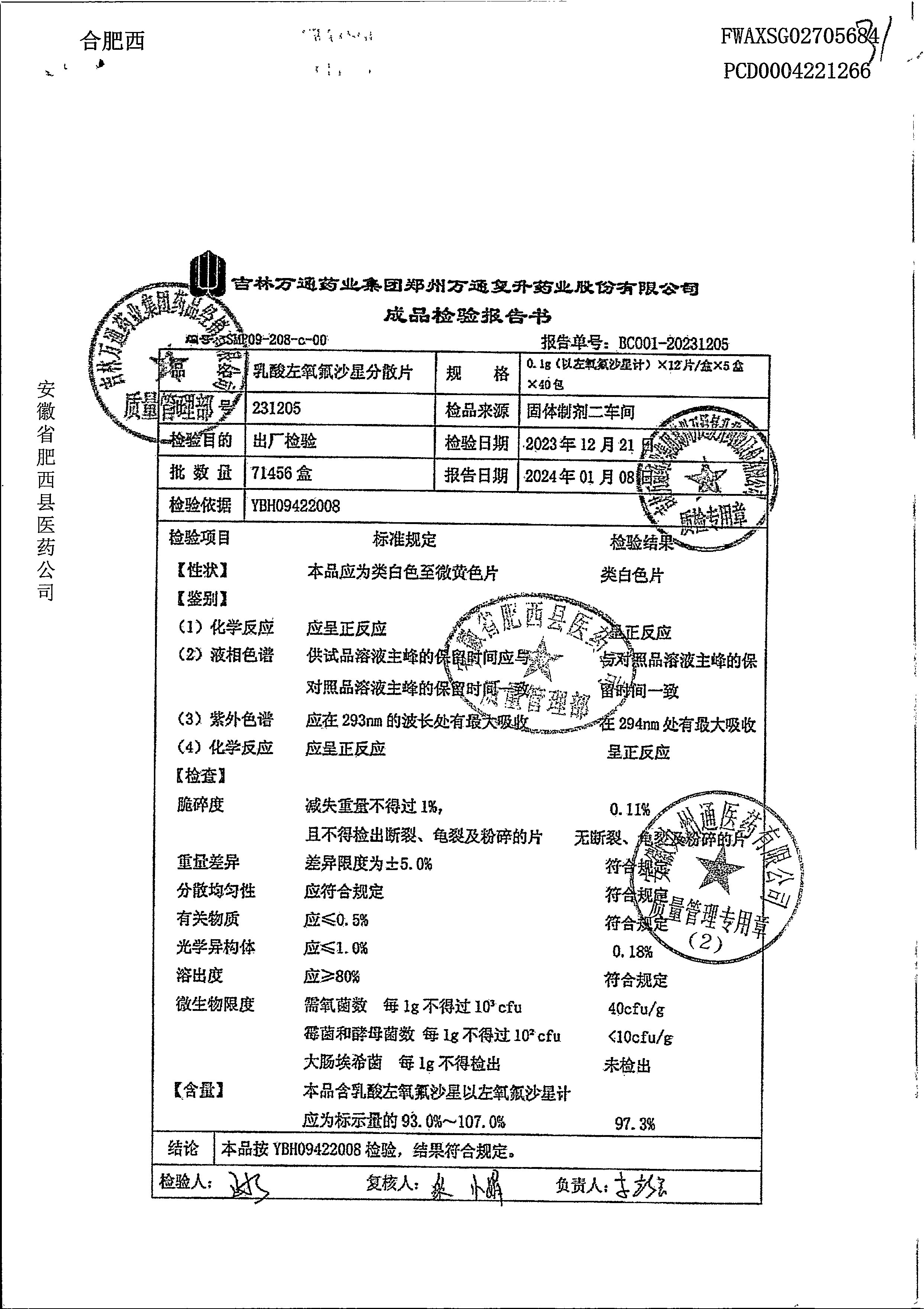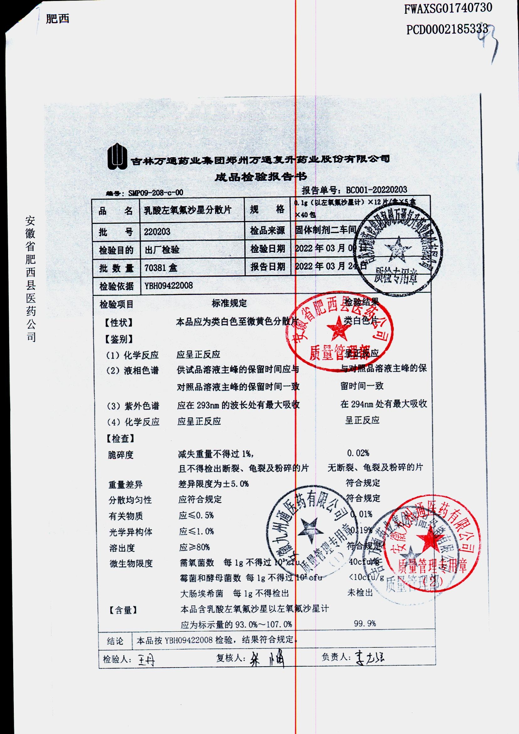 | 乳酸左氧氟沙星分散片 | 0.1g*12*5 | 240403 | 查看详情 |
