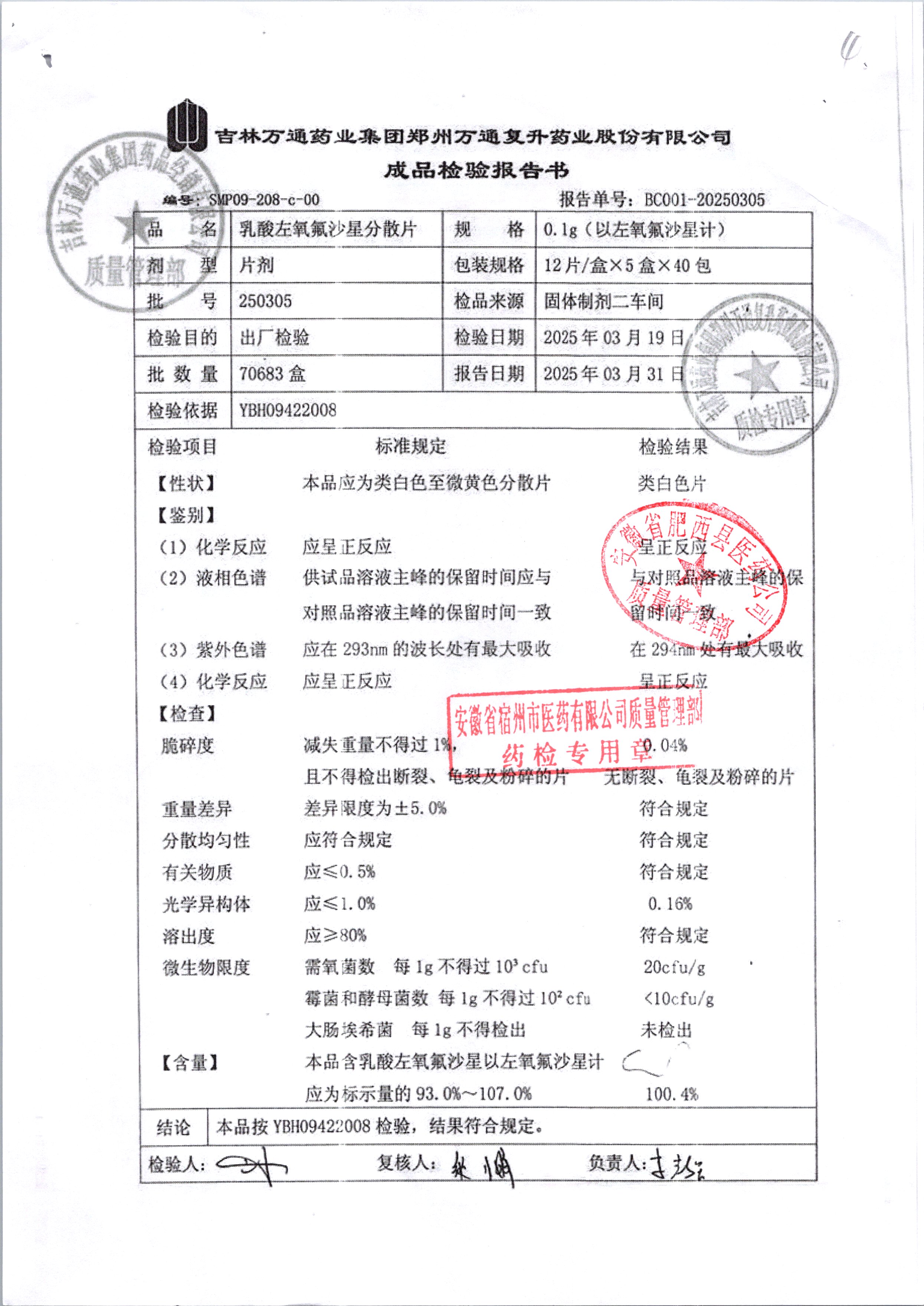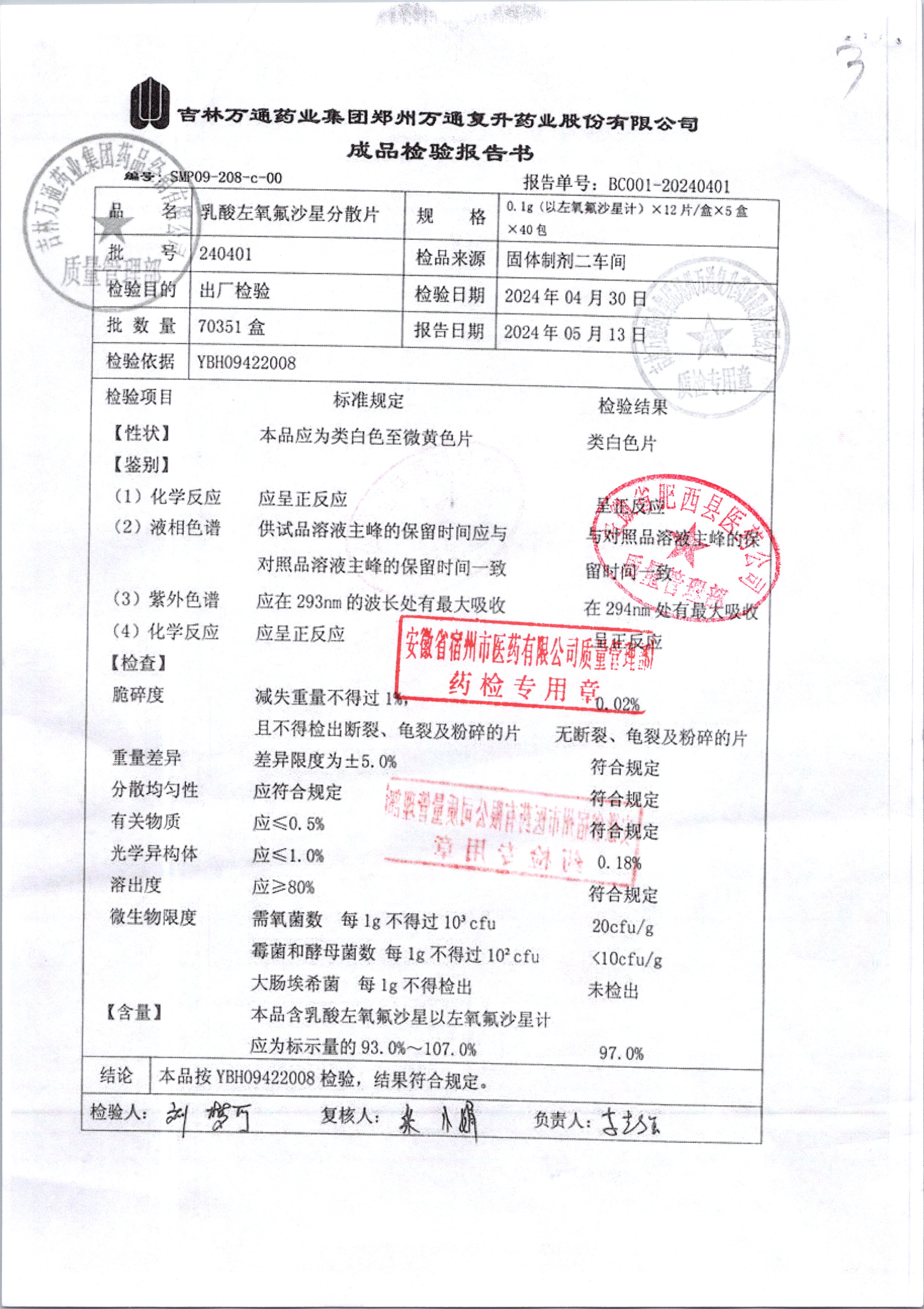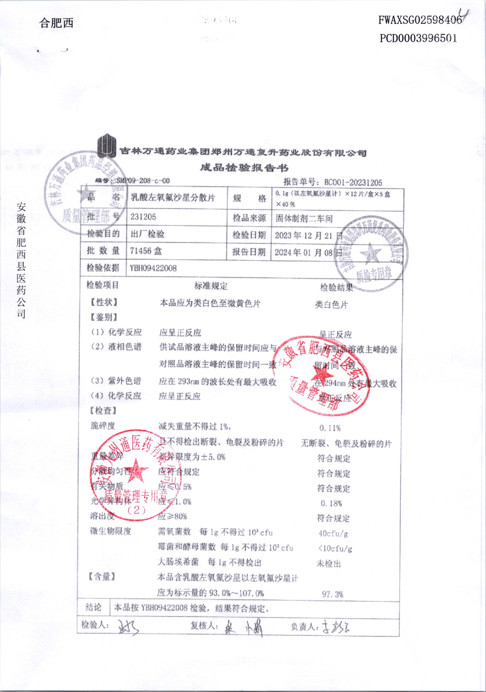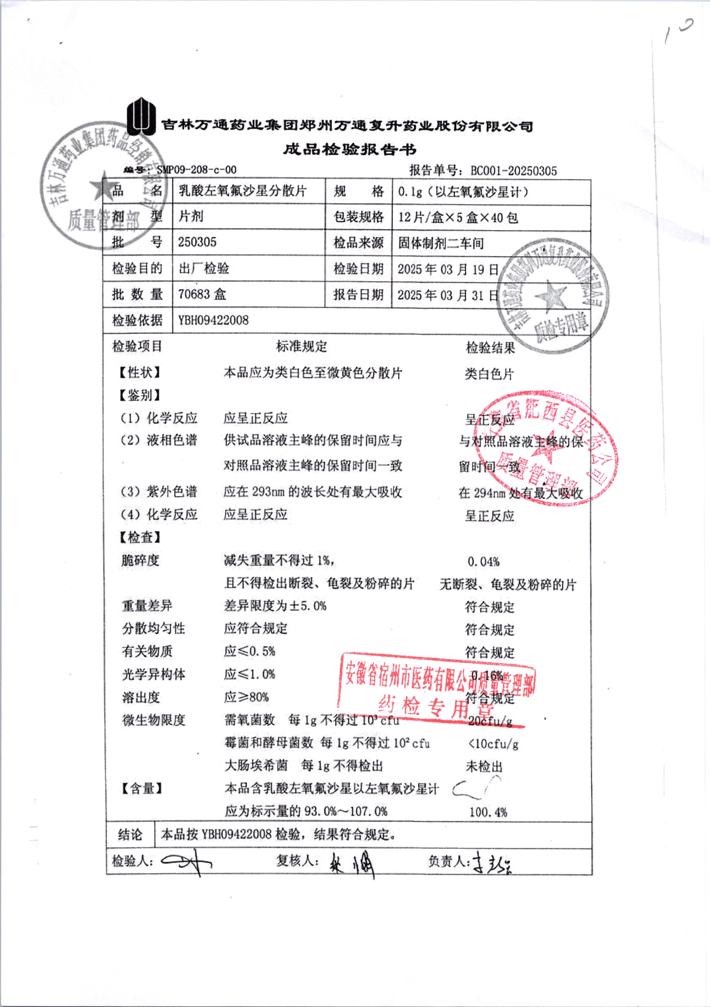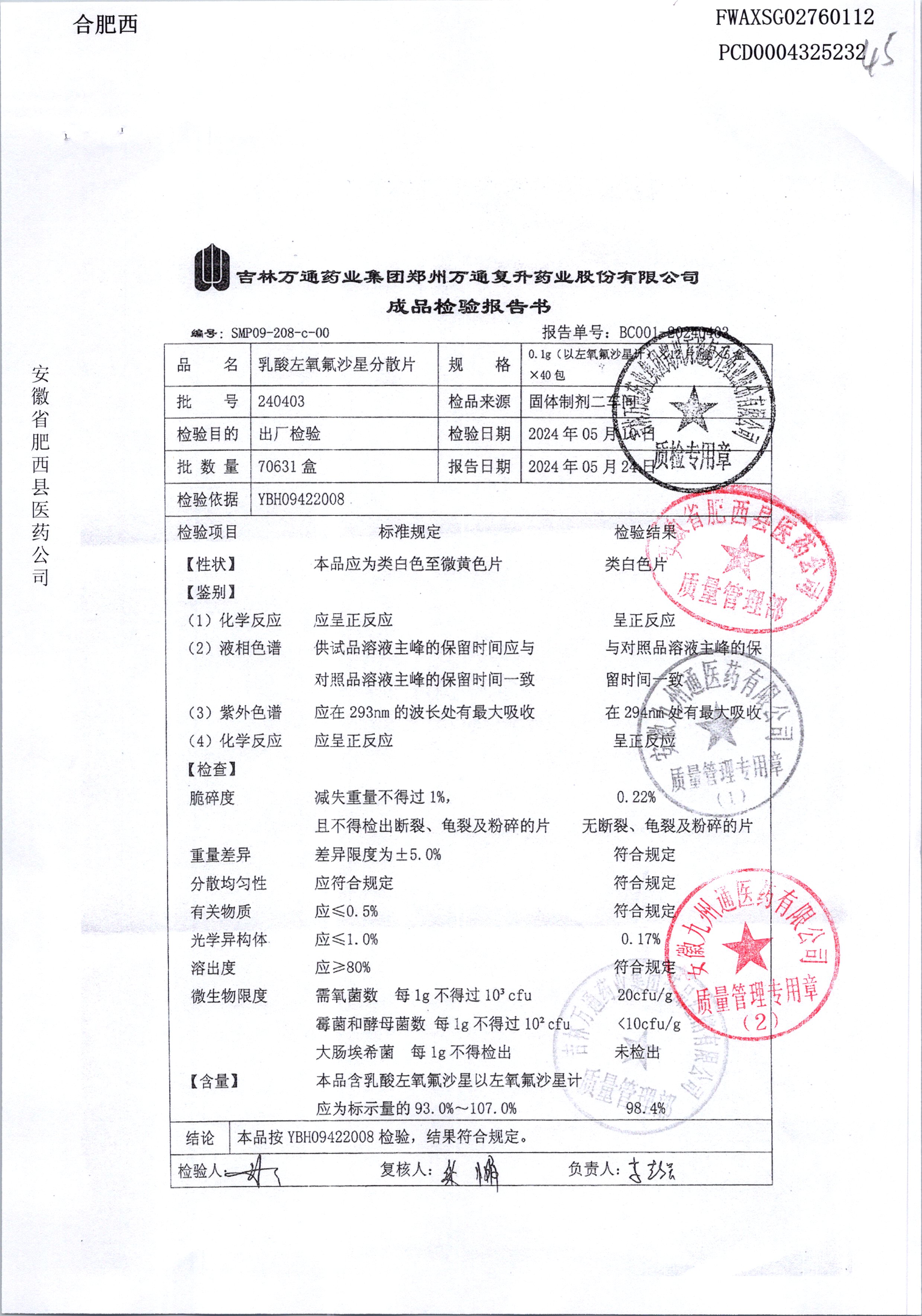| 乳酸左氧氟沙星分散片 | 0.1g*12*5 | 240403 | 查看详情 |