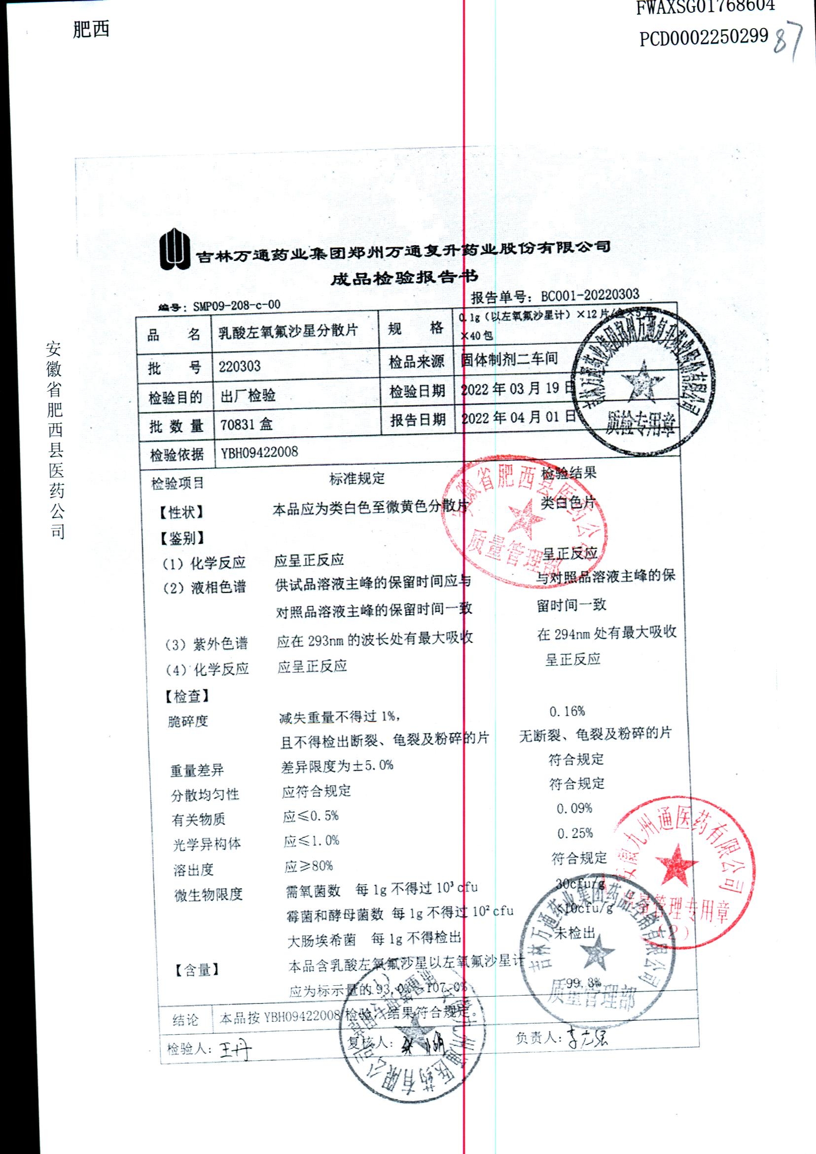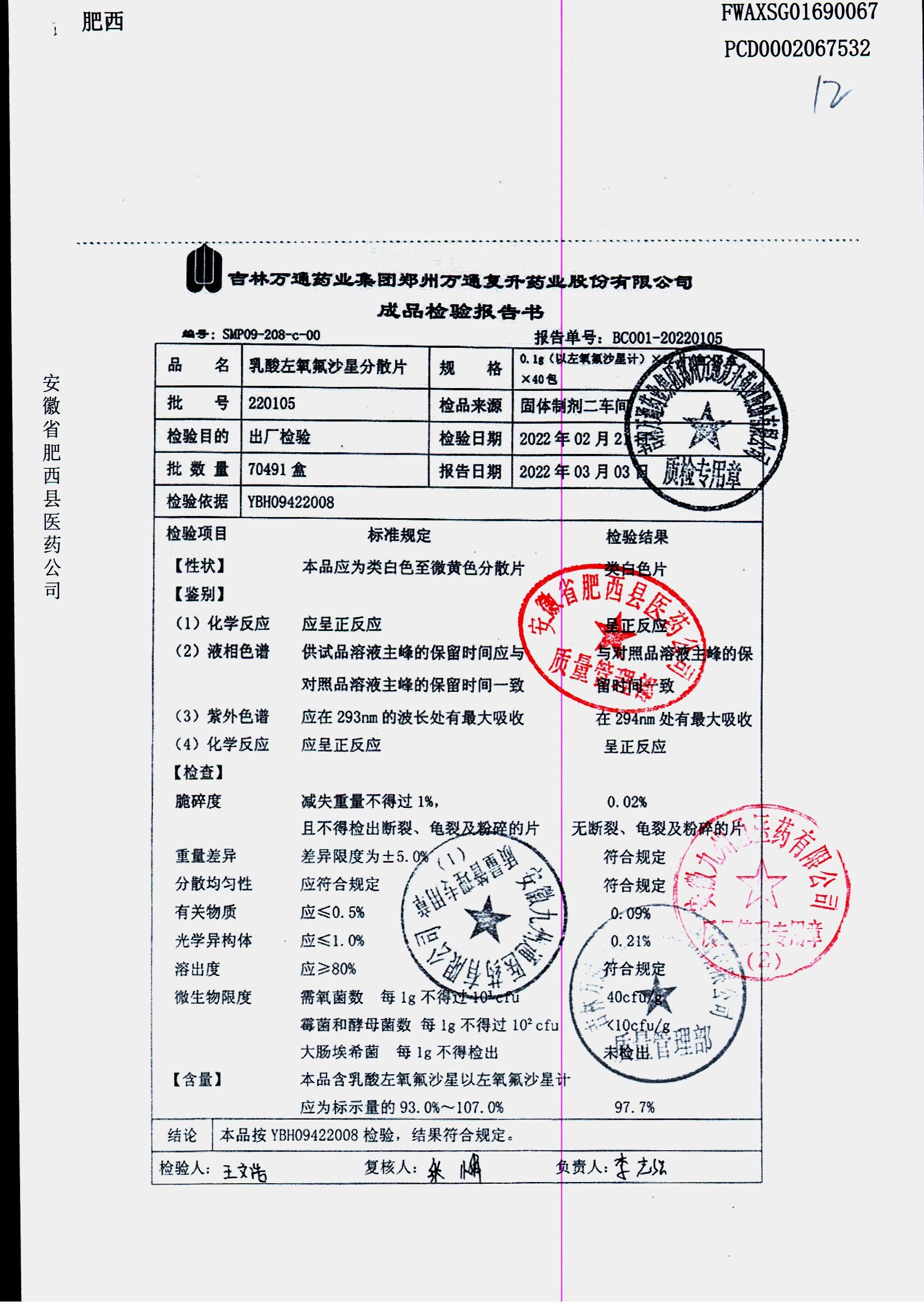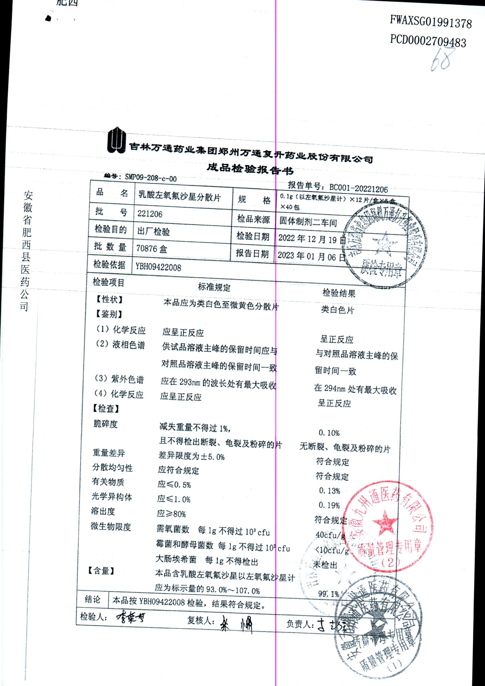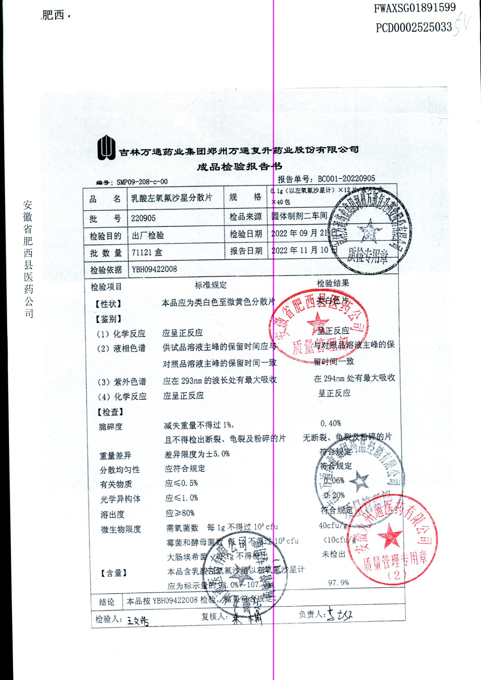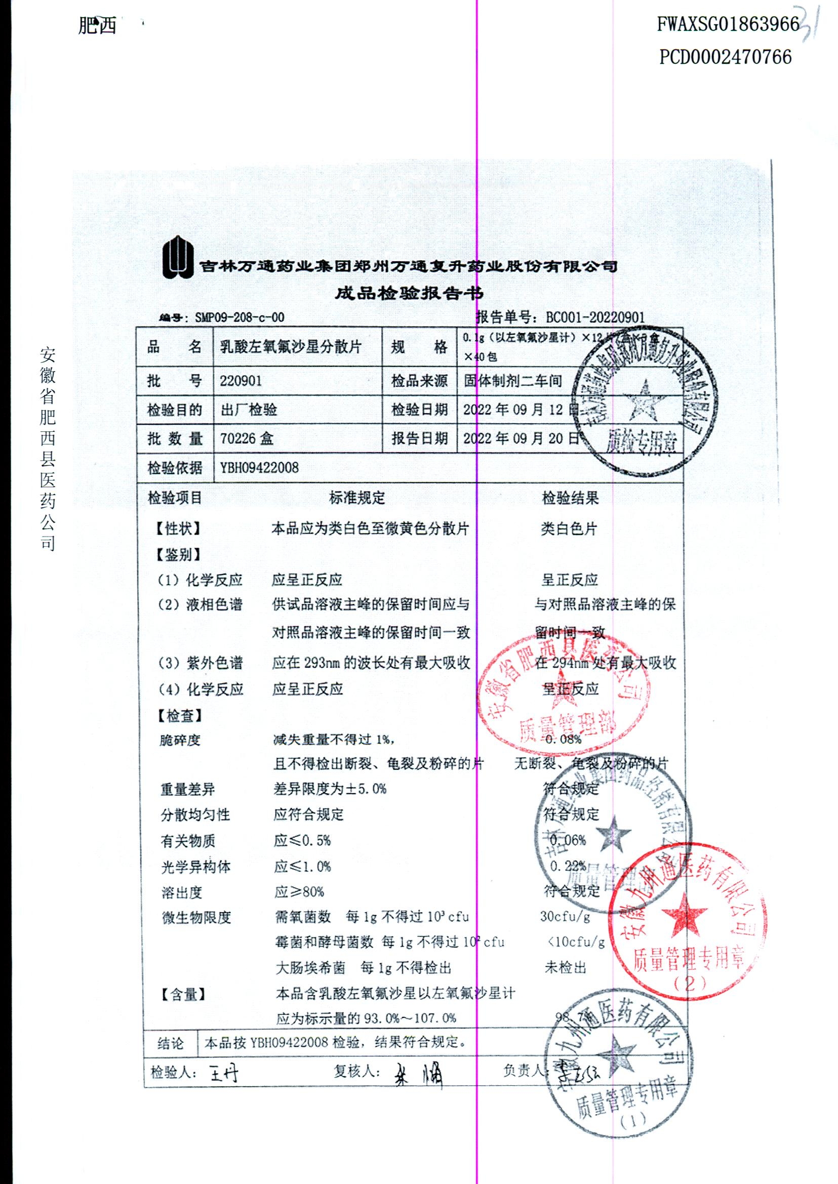 | 乳酸左氧氟沙星分散片 | 0.1g*12*5 | 220901 | 查看详情 |