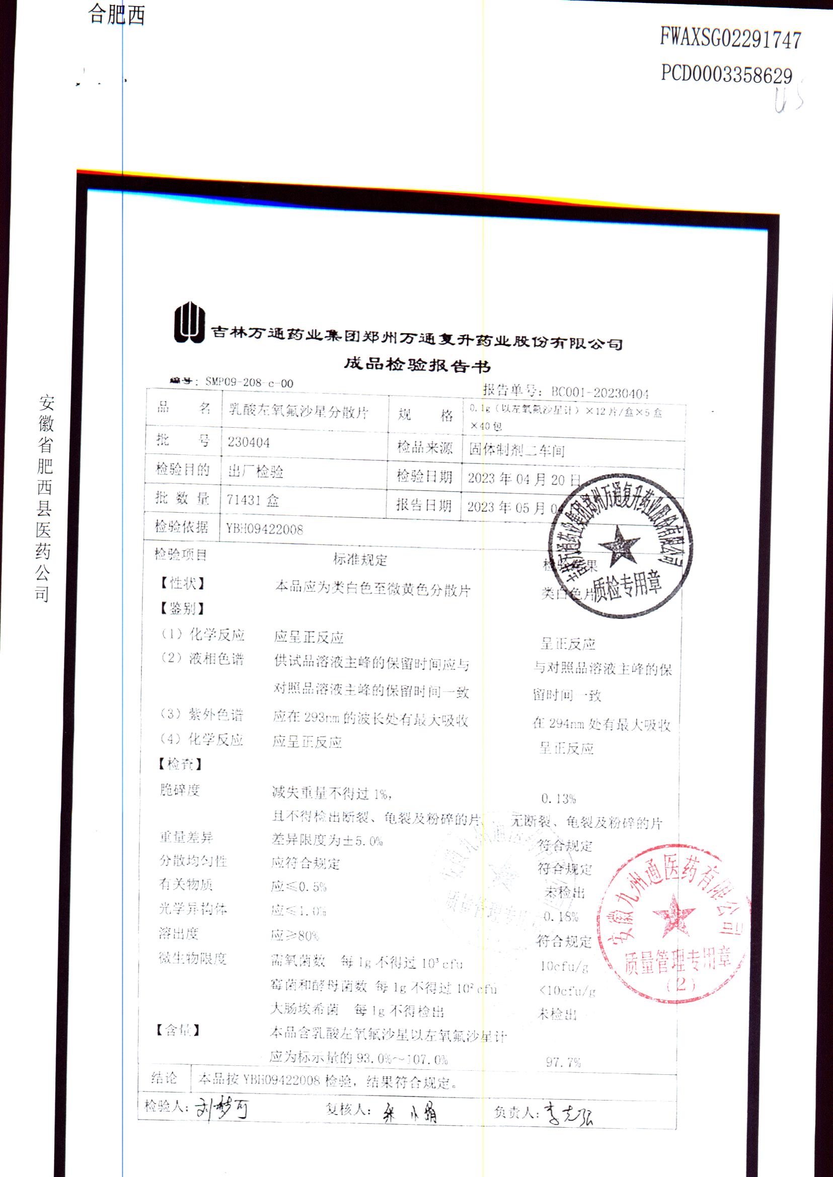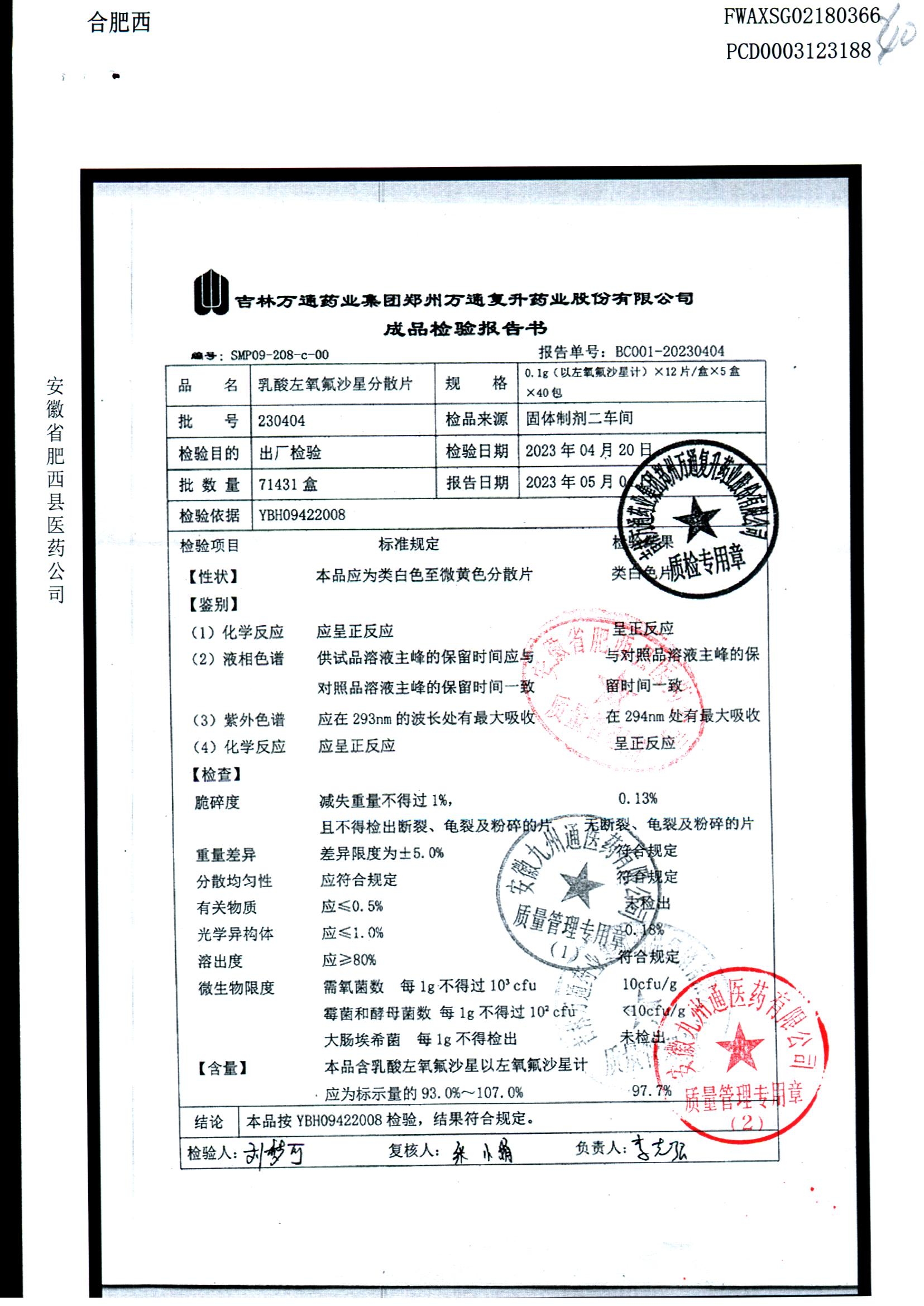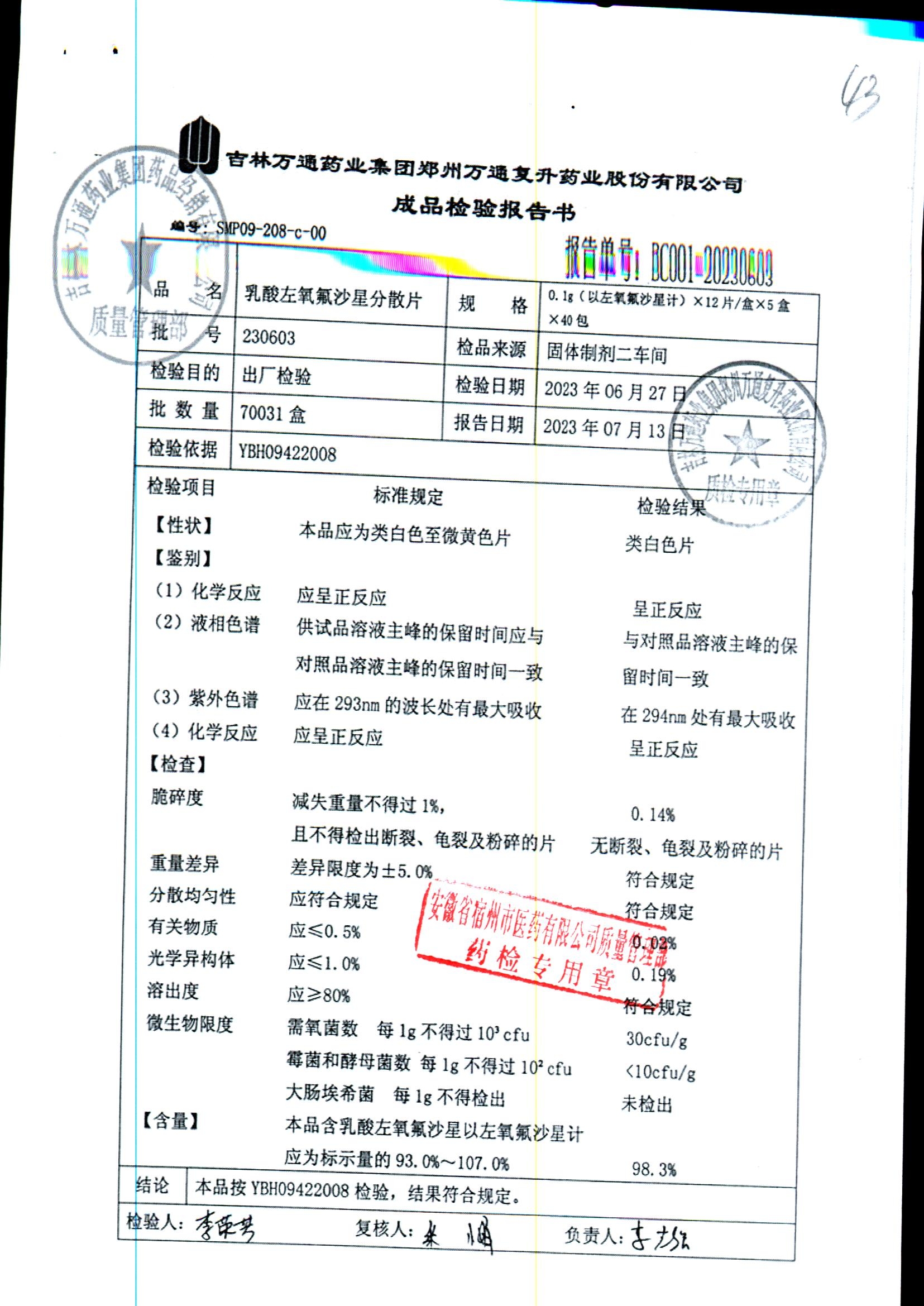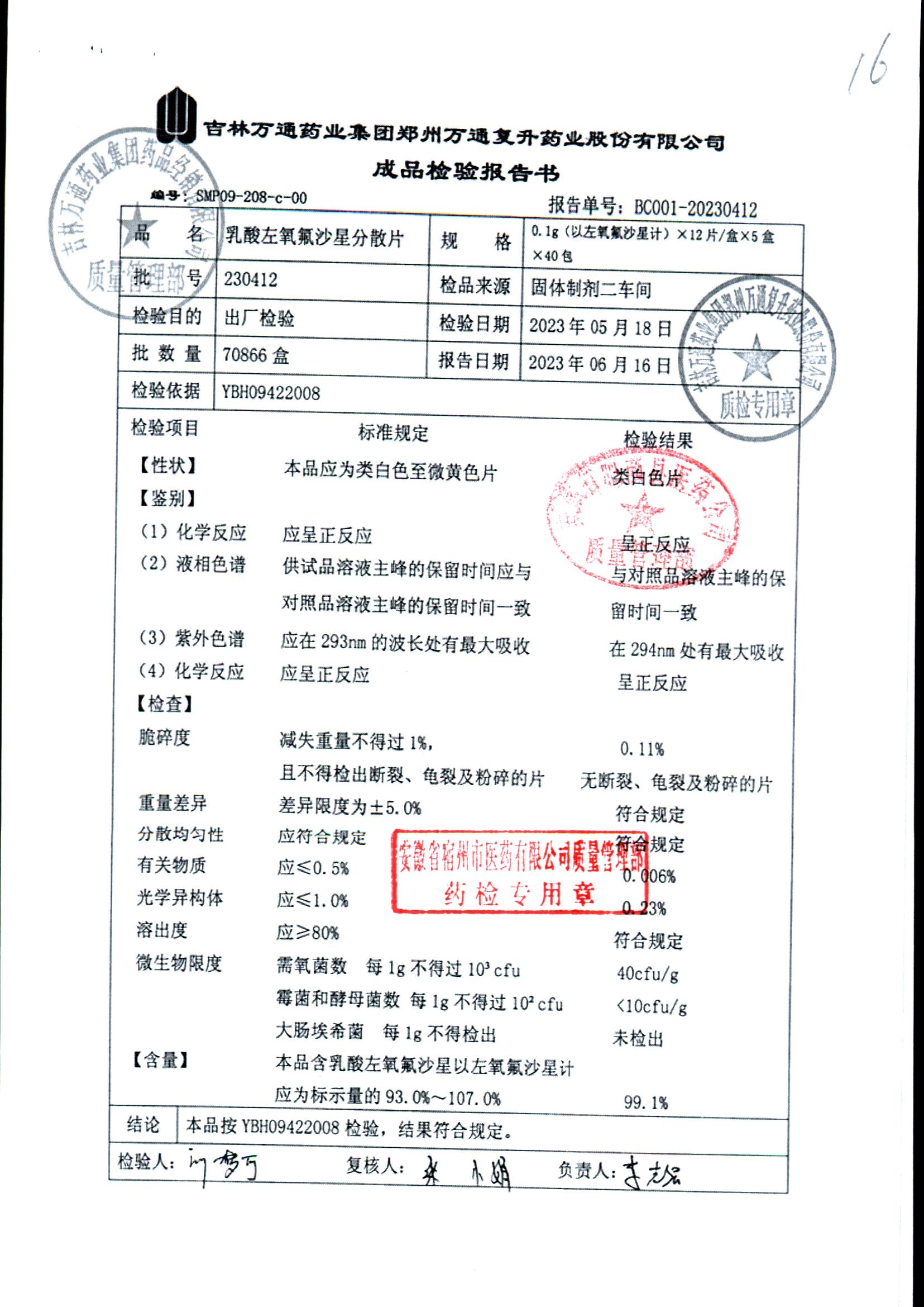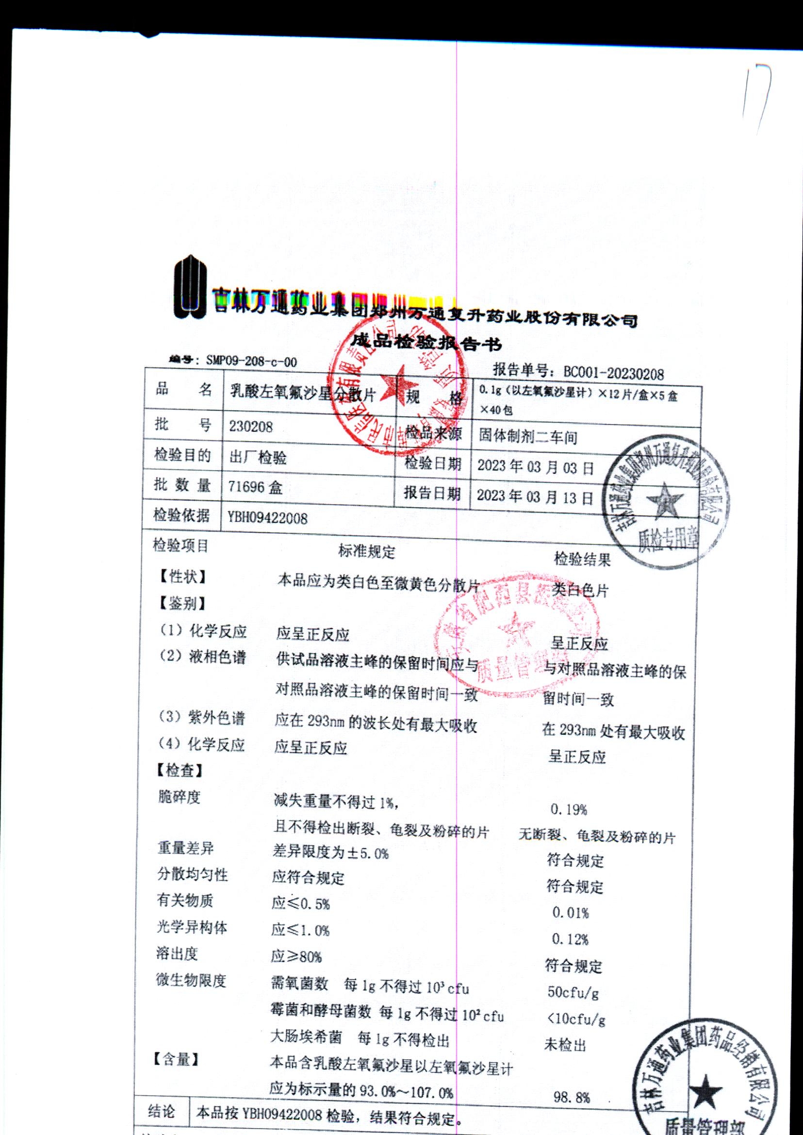 | 乳酸左氧氟沙星分散片 | 0.1g*12*5 | 230603 | 查看详情 |