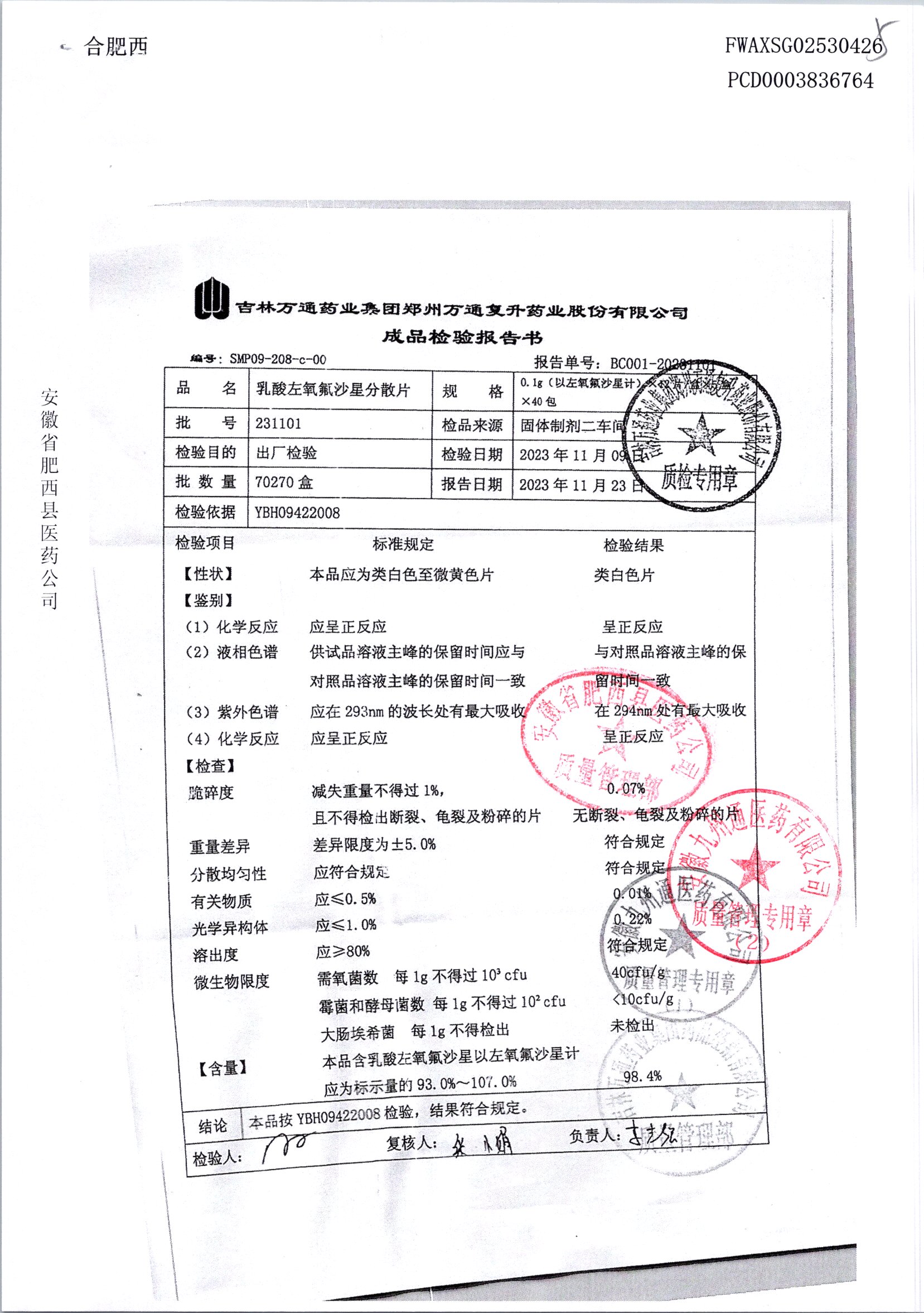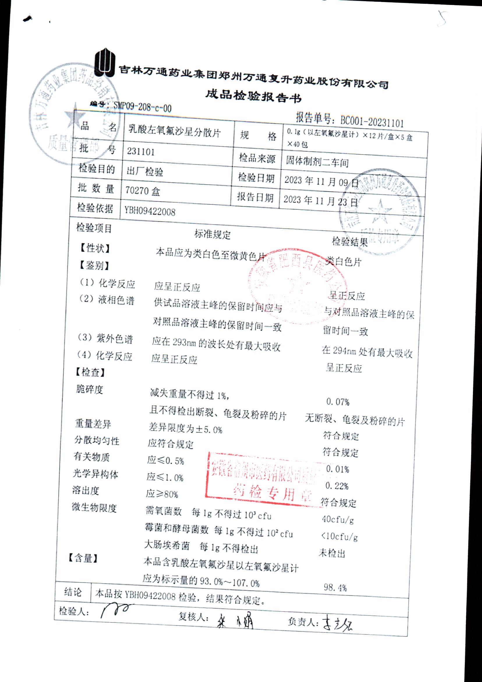 | 乳酸左氧氟沙星分散片 | 0.1g*12*5 | 231101 | 查看详情 |