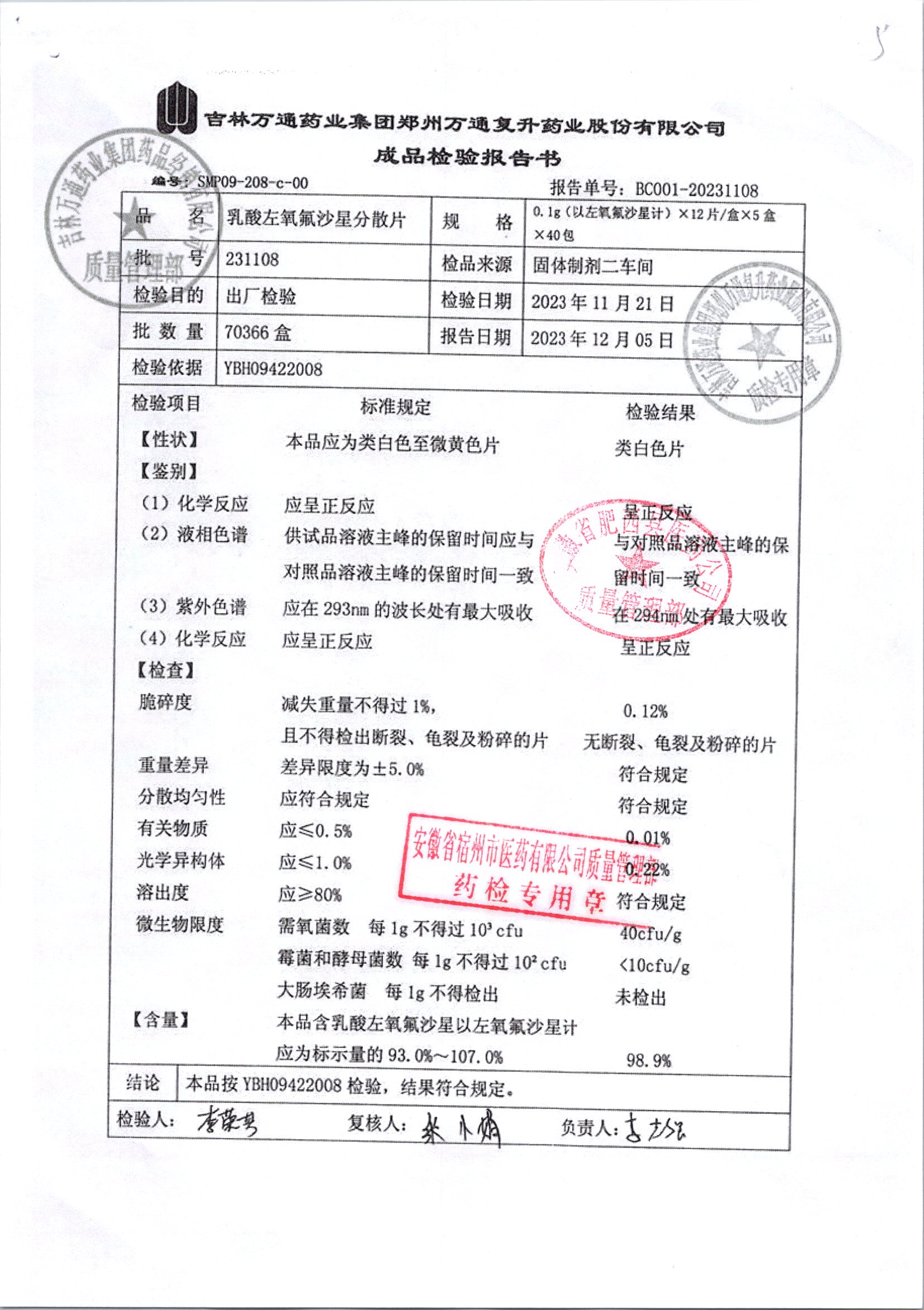 | 乳酸左氧氟沙星分散片 | 0.1g*12*5 | 231205 | 查看详情 |