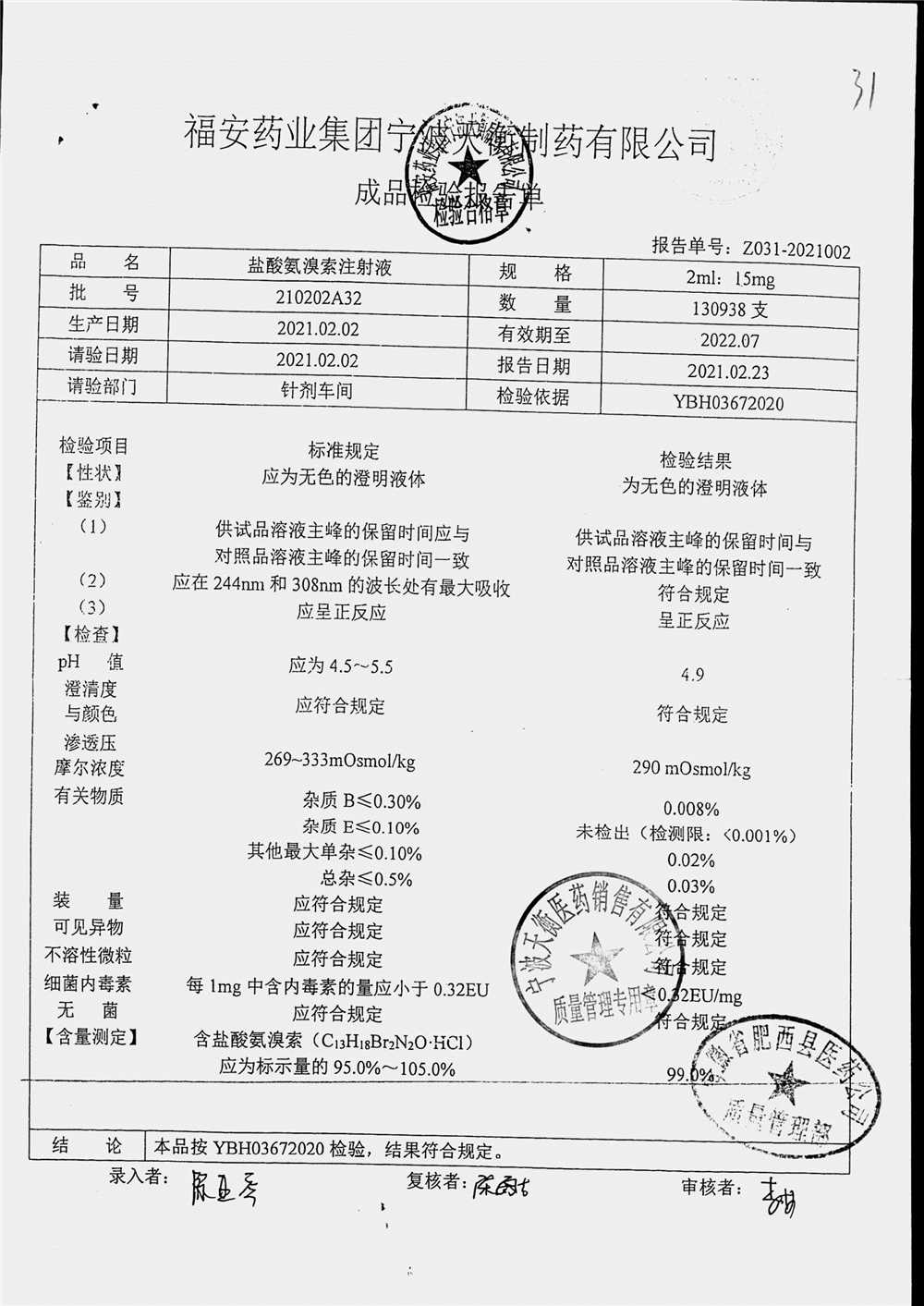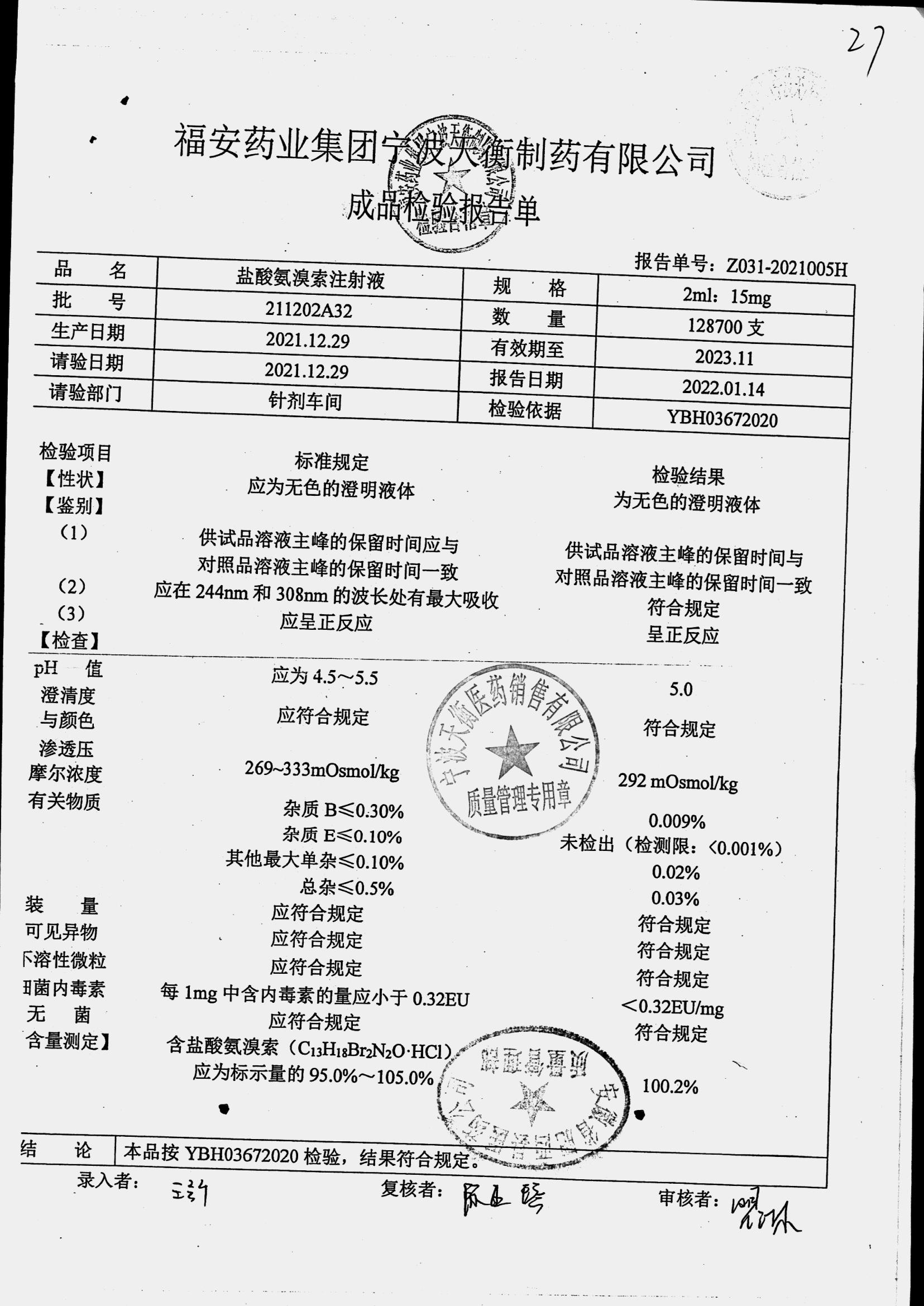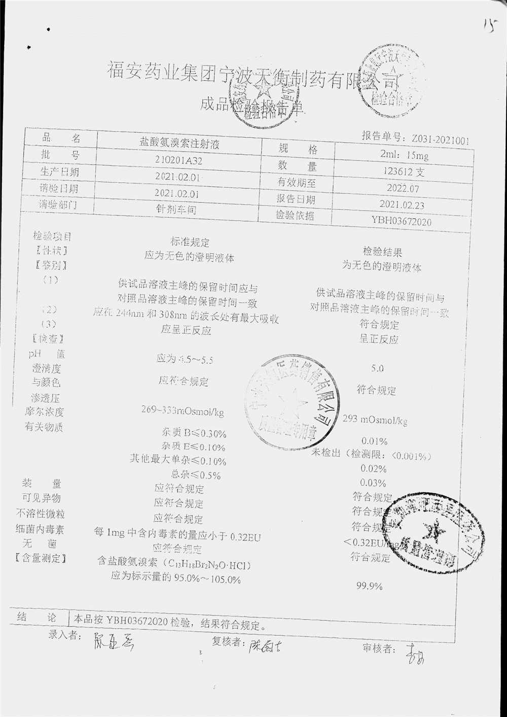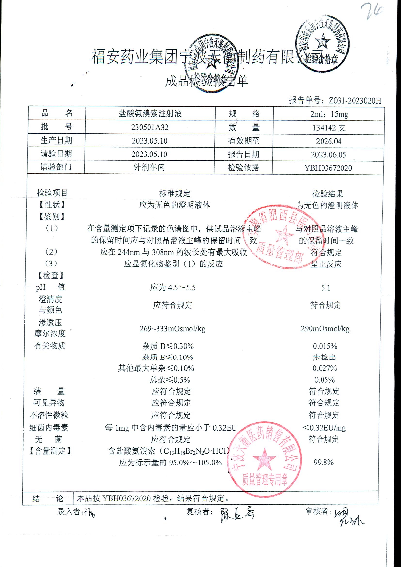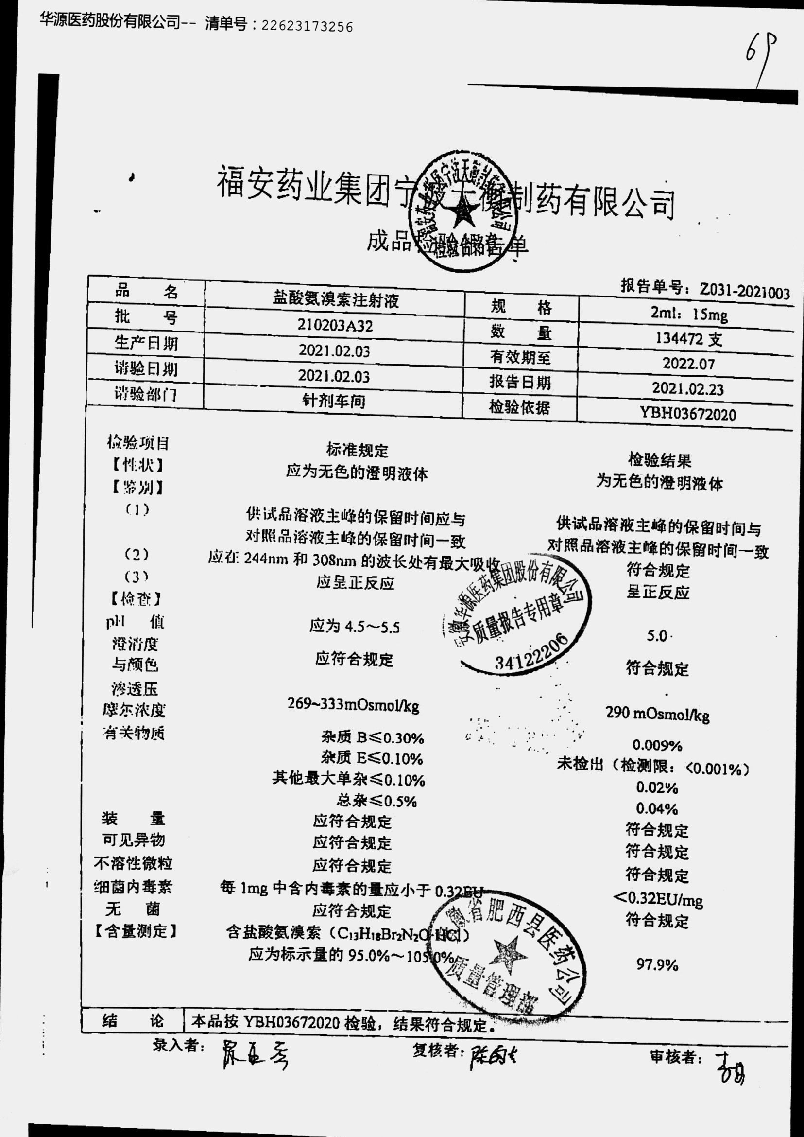 | 盐酸氨溴索注射液 | 2ml:15mg*6支 | 211202A32 | 查看详情 |