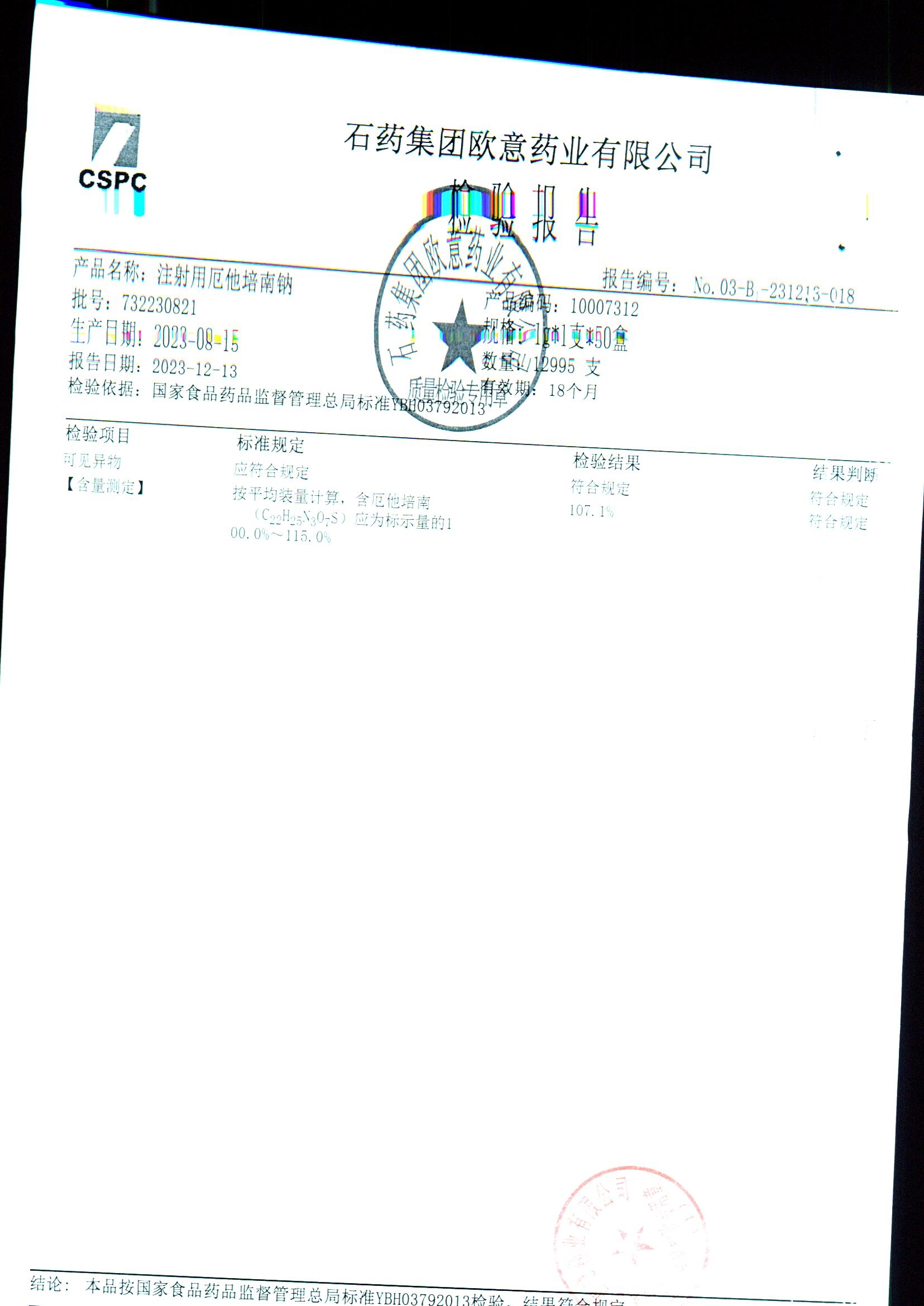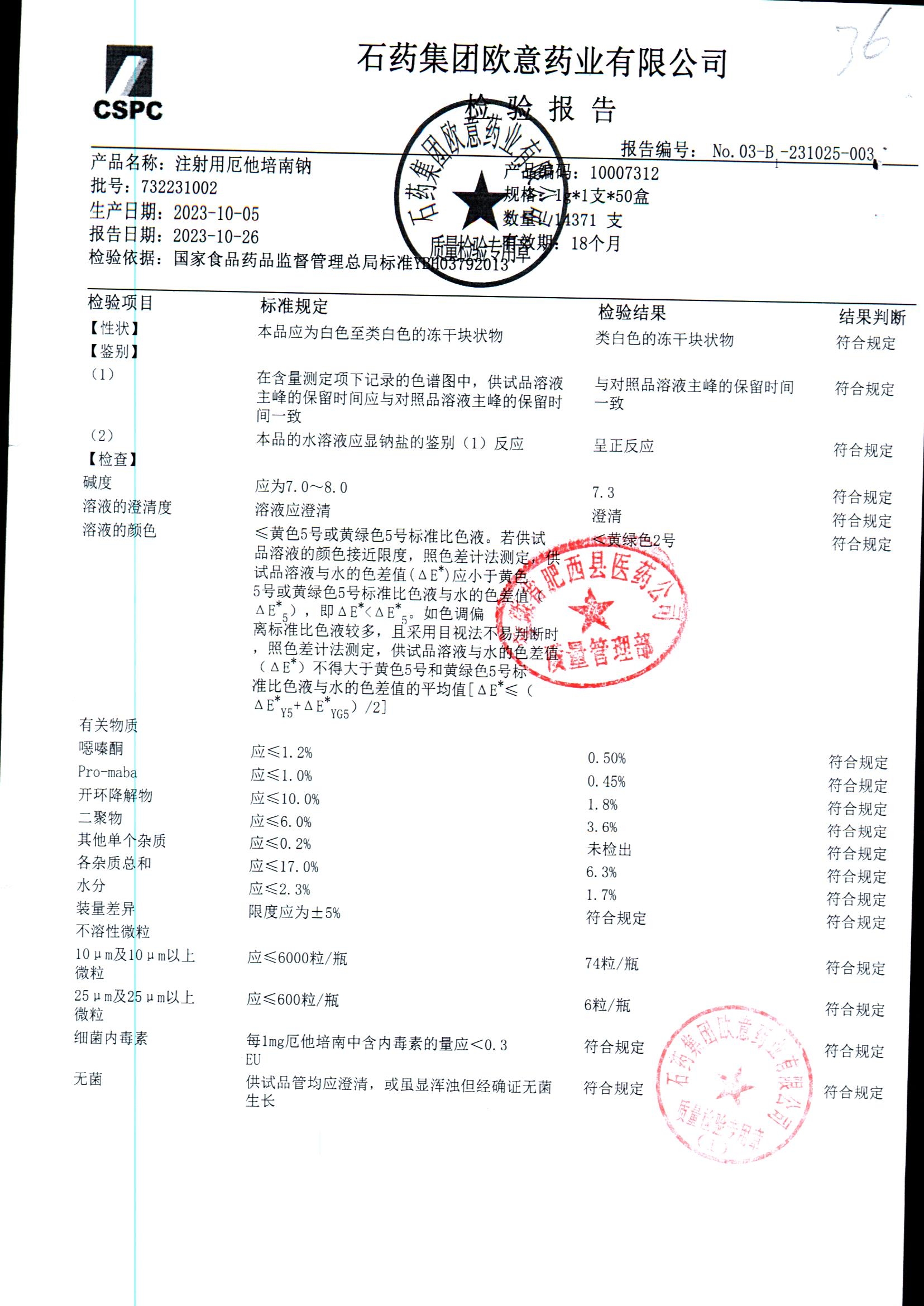 | 注射用厄他培南钠 | 1.0g(以厄他培南计)/瓶 | 732210603(2/2) | 查看详情 |