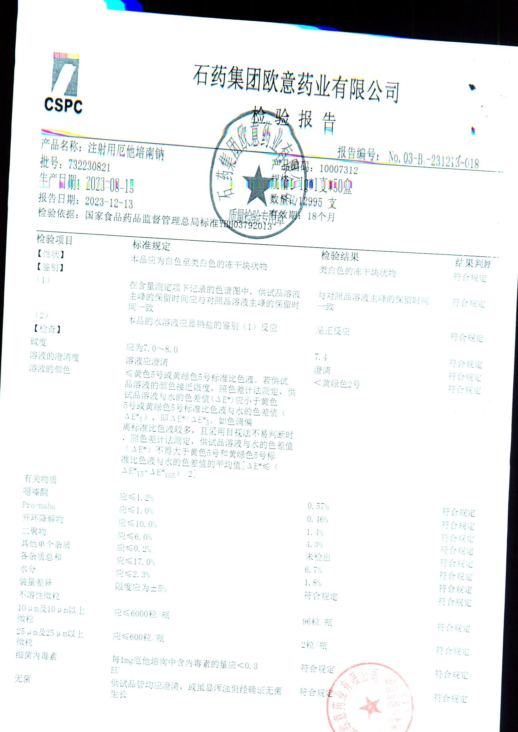 | 注射用厄他培南钠 | 1.0g(以厄他培南计)/瓶 | 732230821/2 | 查看详情 |