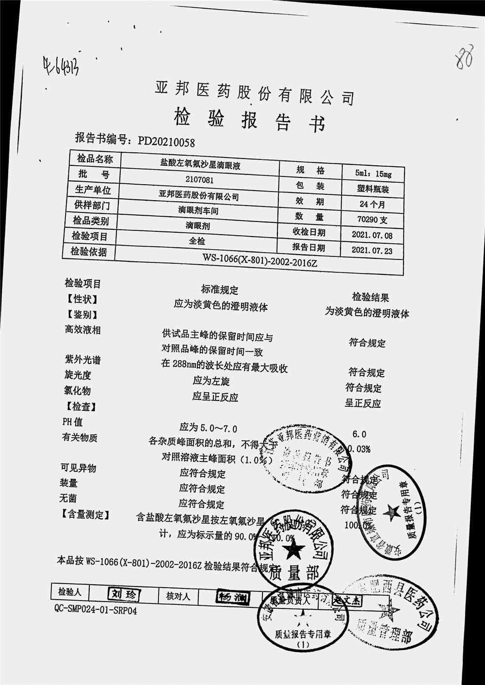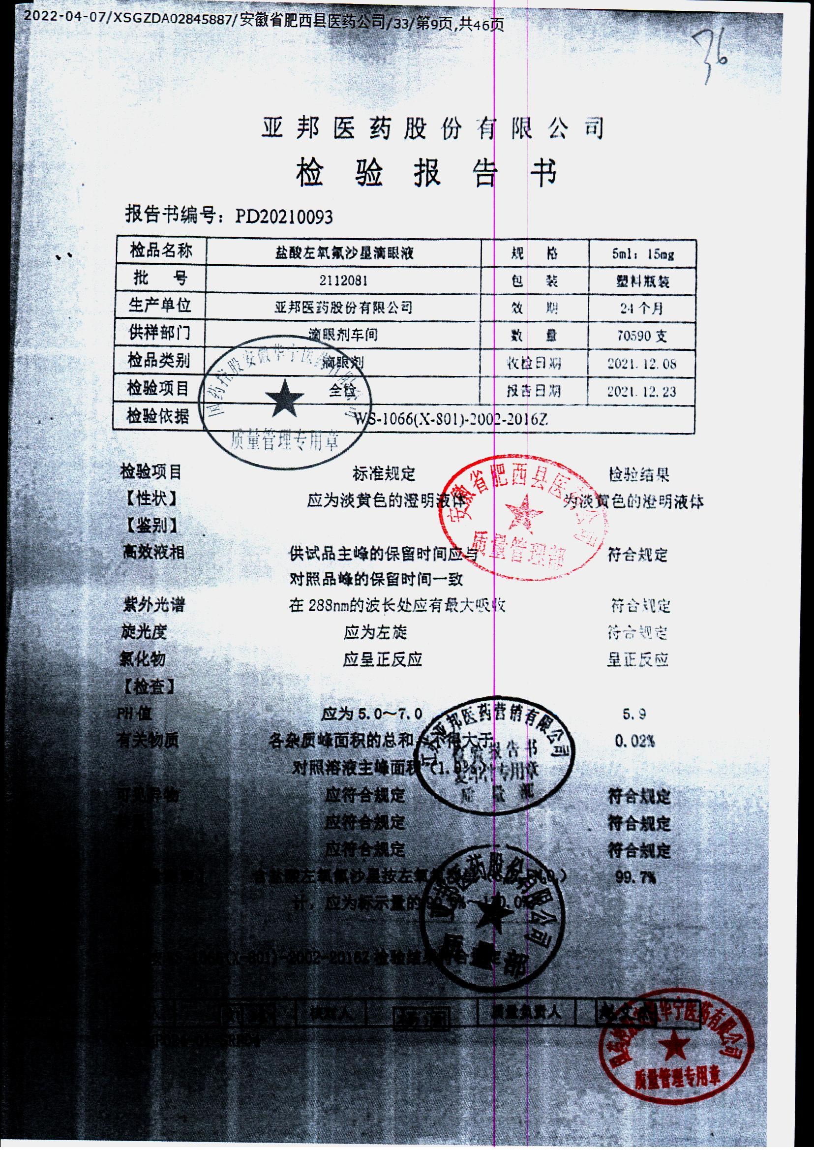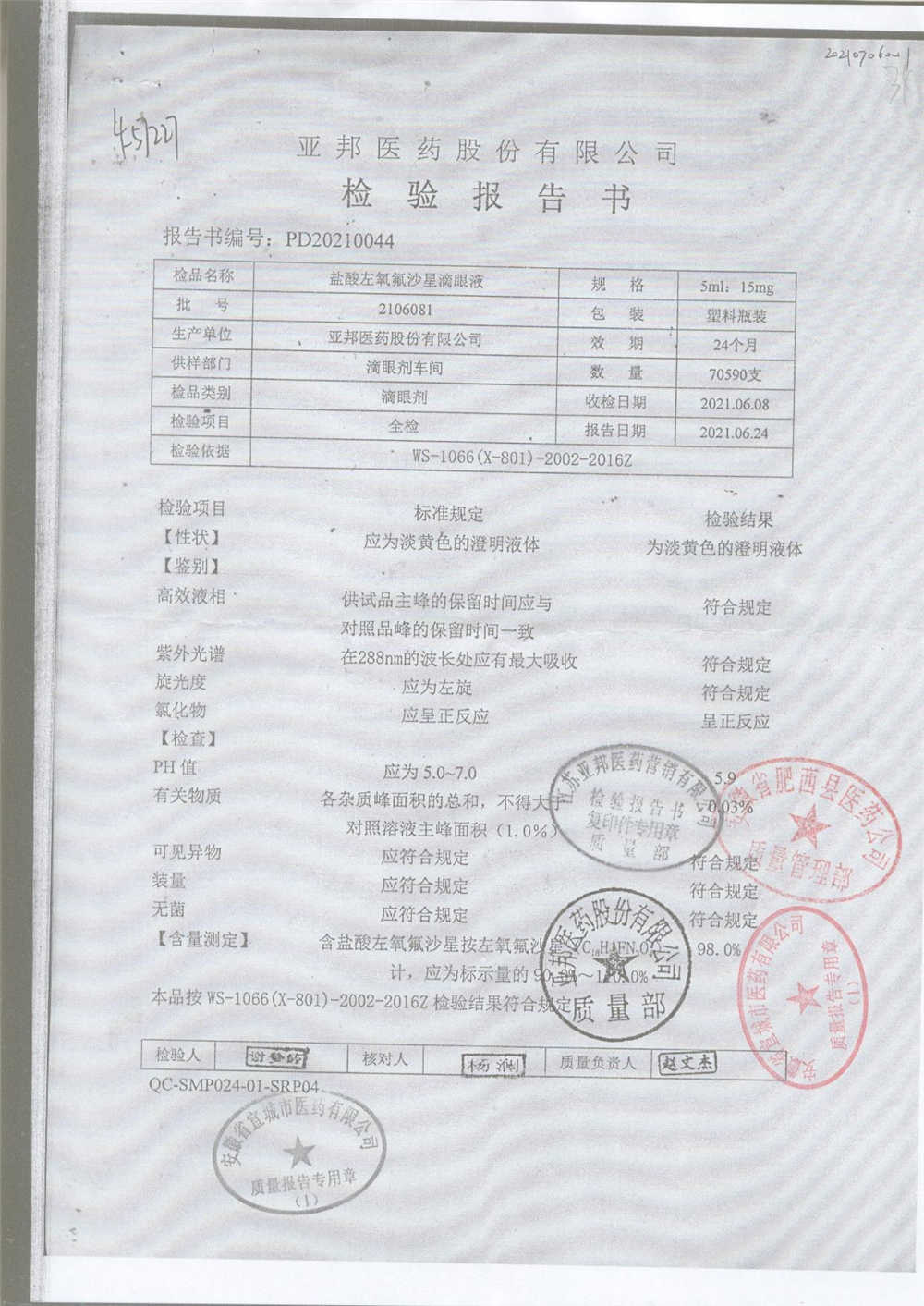 盐酸左氧氟沙星滴眼液 | 5ml:15mg/300 | 2112081 | 查看详情 |