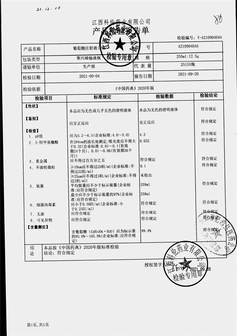 葡萄糖注射液 | 250ml:12.5g(聚丙烯输液瓶) | C21090404A | 查看详情 |