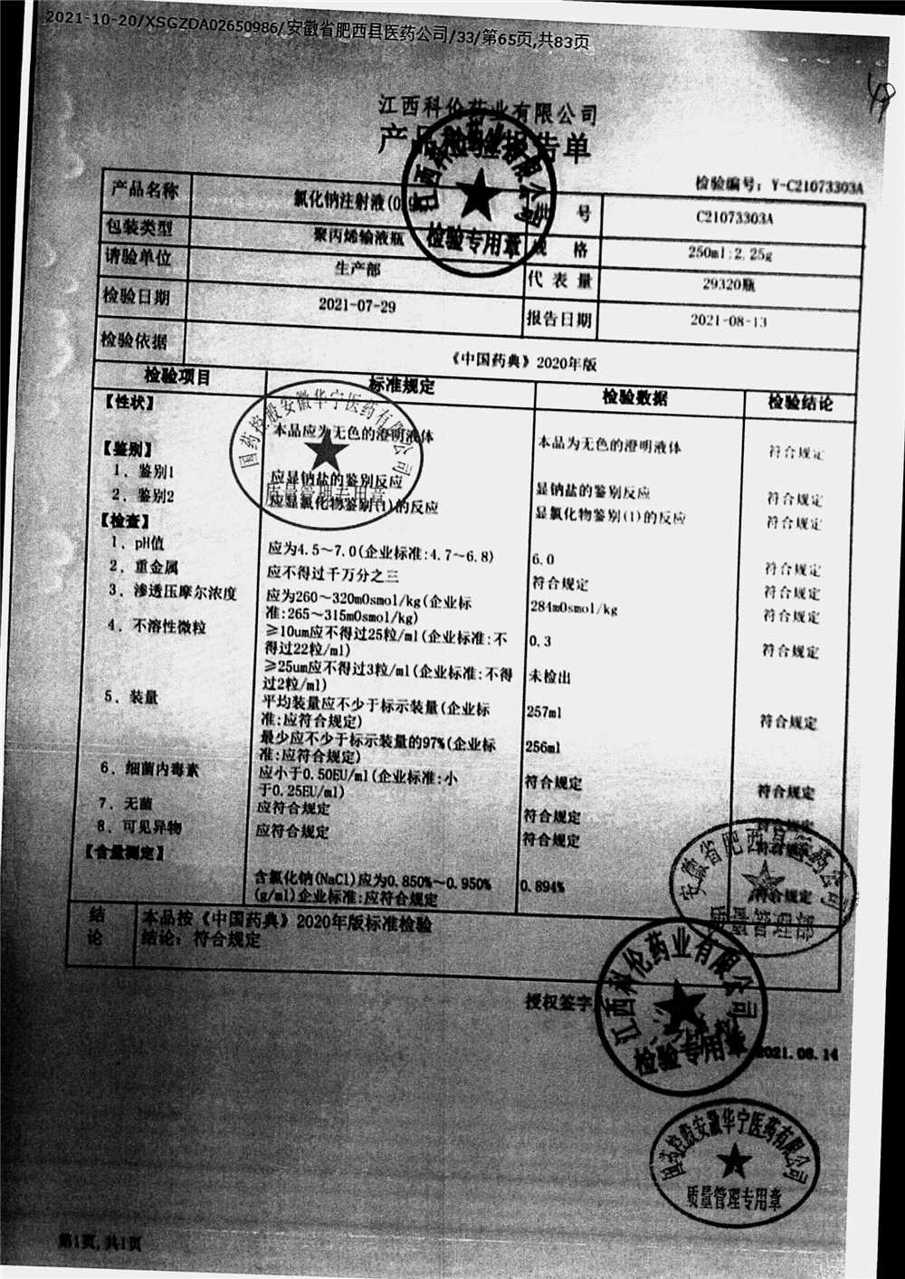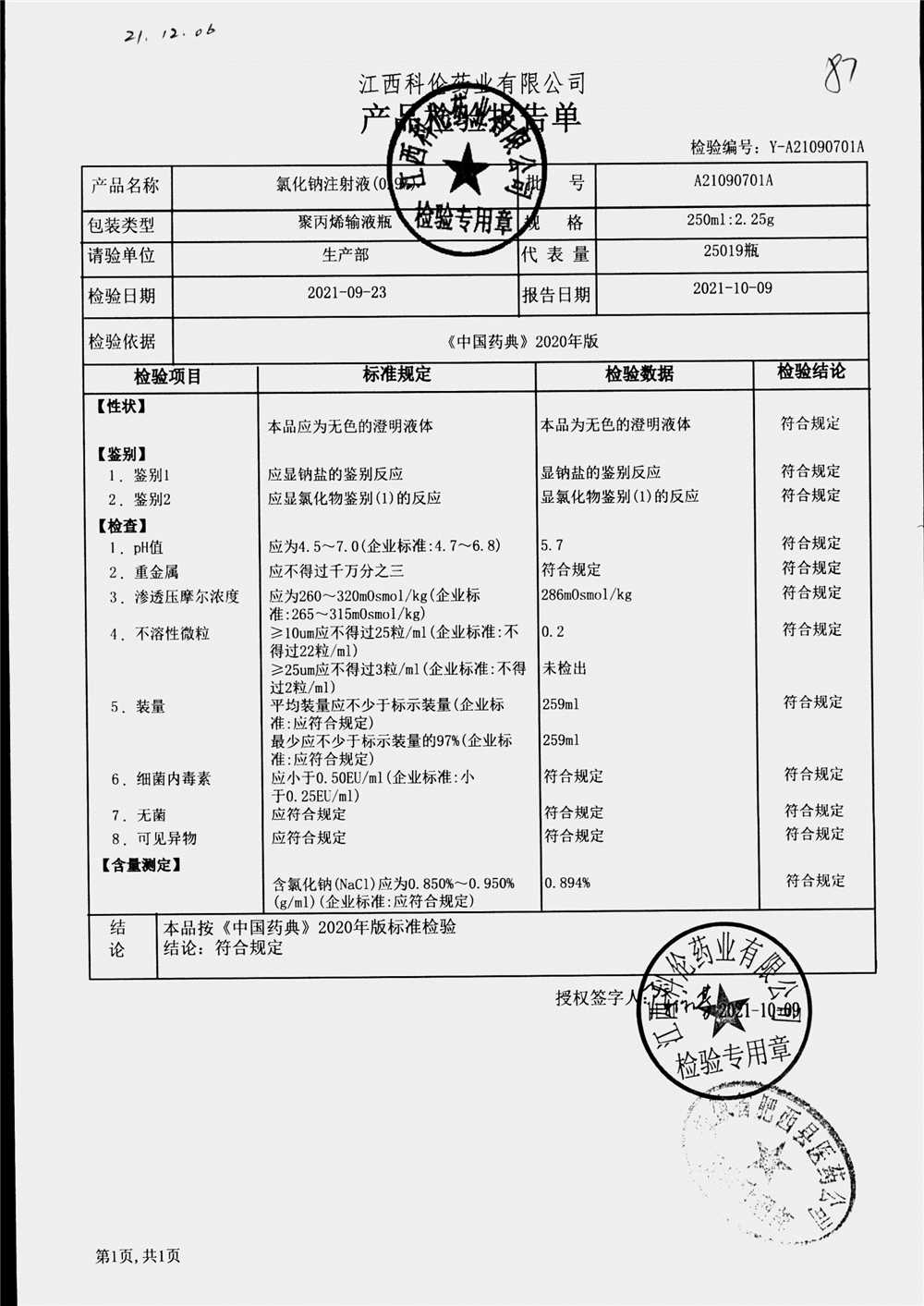 氯化钠注射液 | 250ml:2.25g(聚丙烯输液瓶) | C21090701A | 查看详情 |