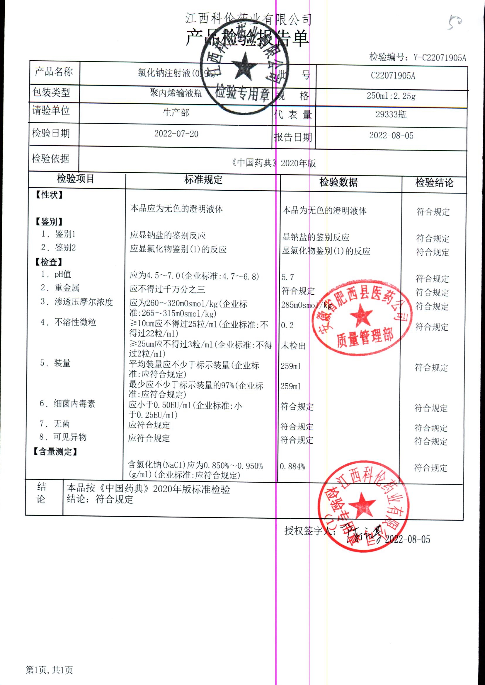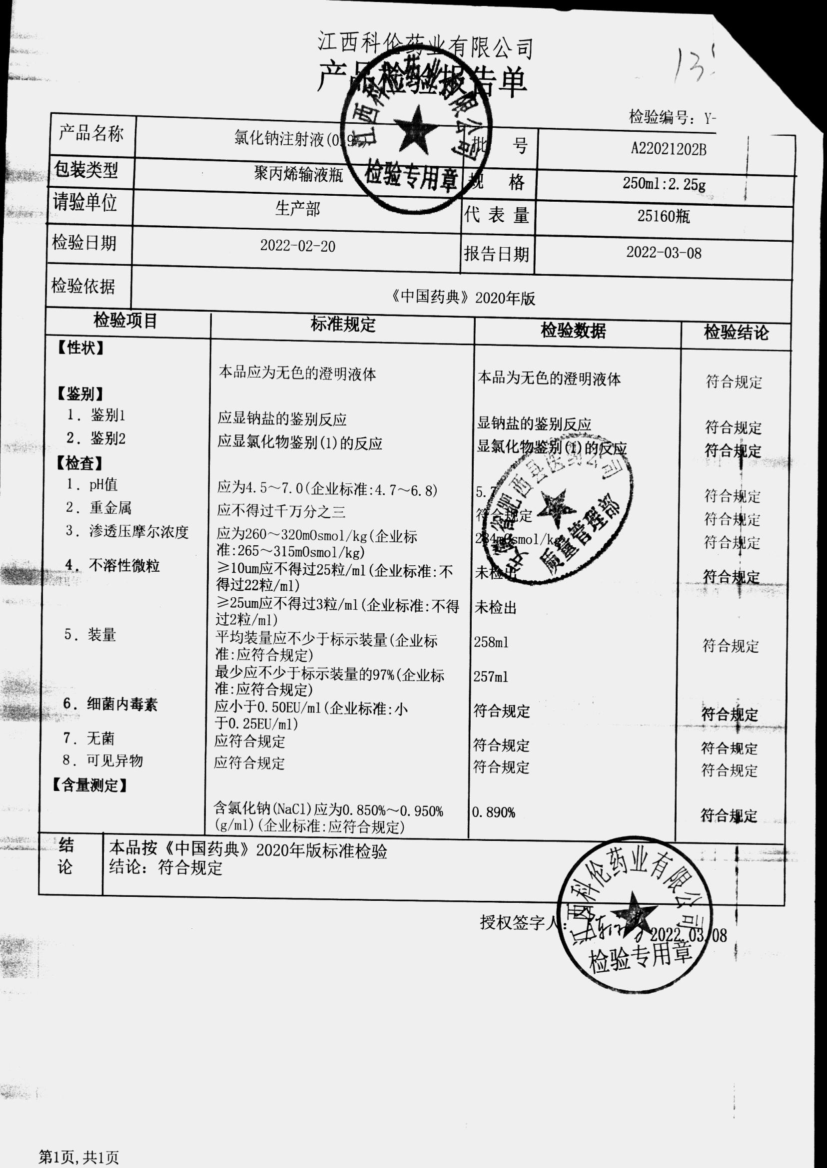氯化钠注射液 | 250ml:2.25g(聚丙烯输液瓶) | C22071905A | 查看详情 |
