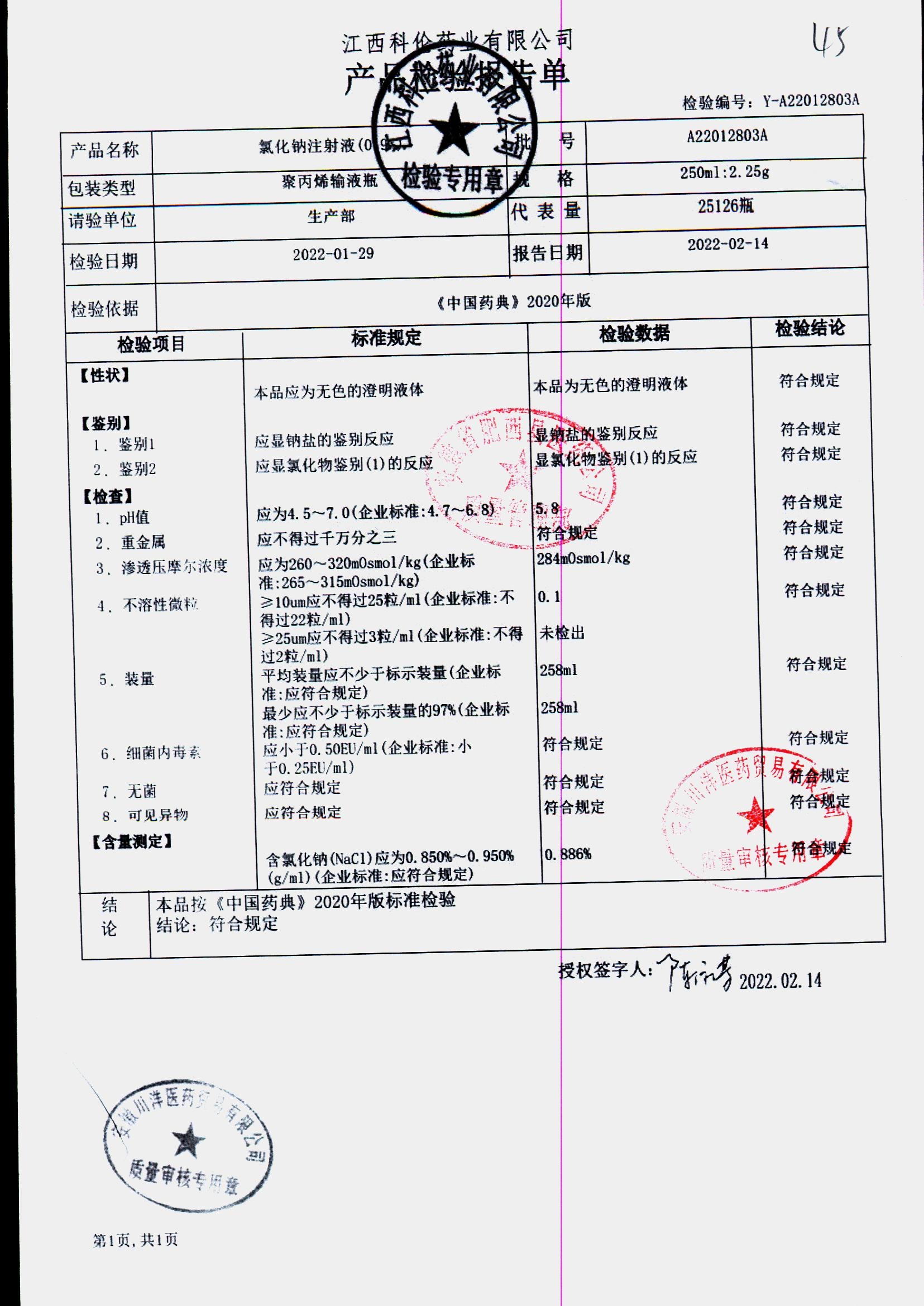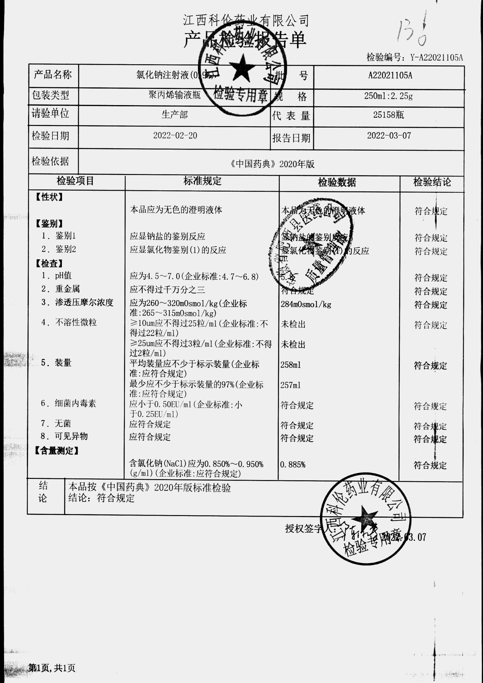 氯化钠注射液 | 250ml:2.25g(聚丙烯输液瓶) | A22021105A | 查看详情 |
