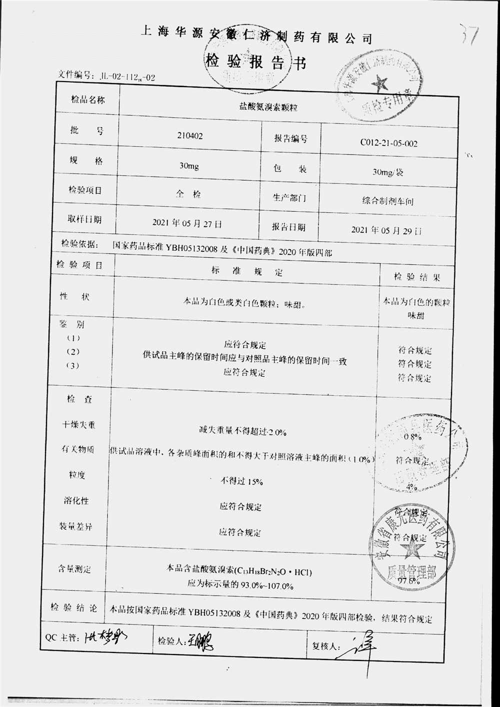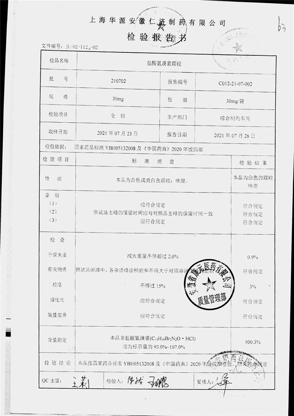 盐酸氨溴索颗粒 | 30mg*9袋 | 210702 | 查看详情 |