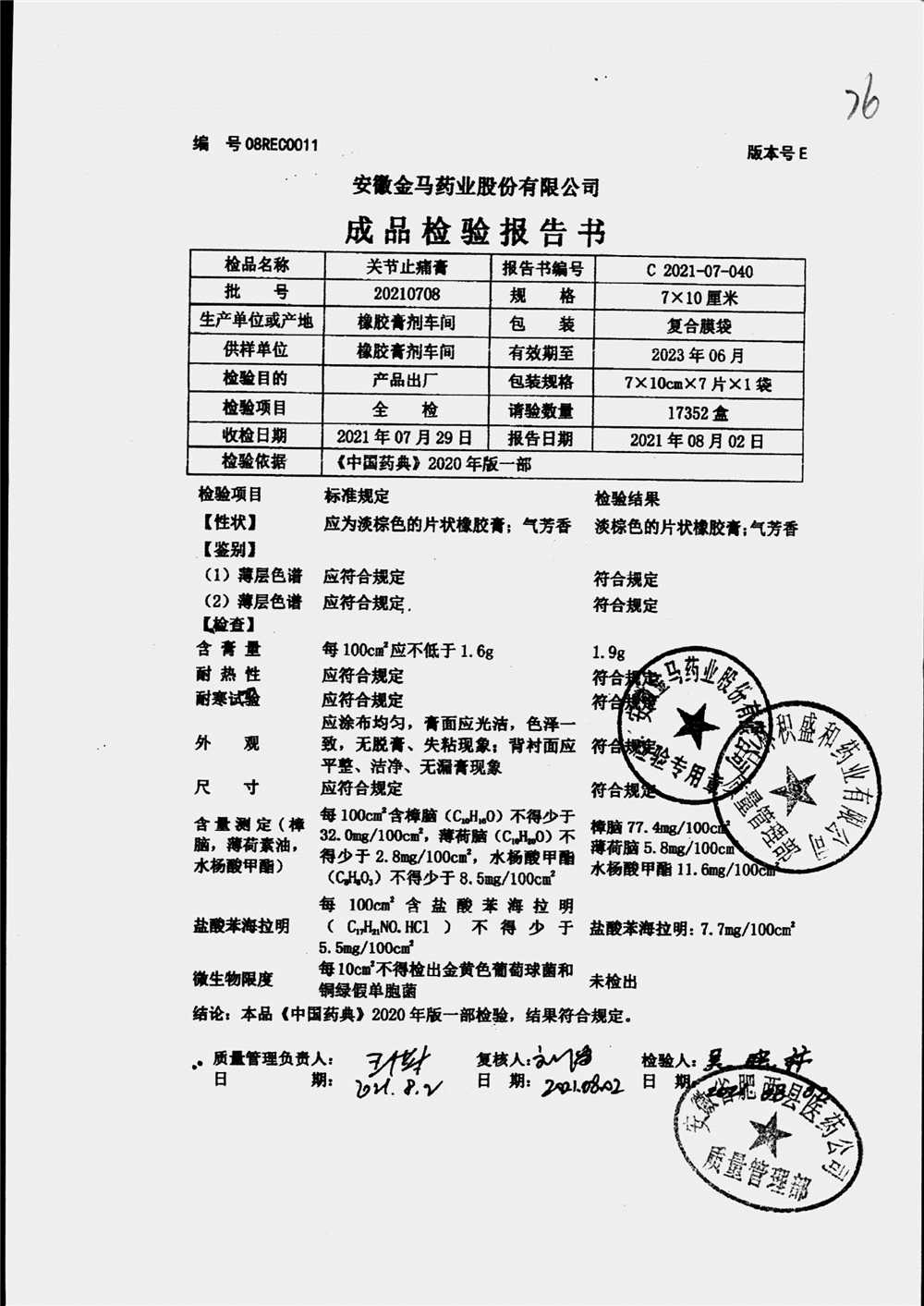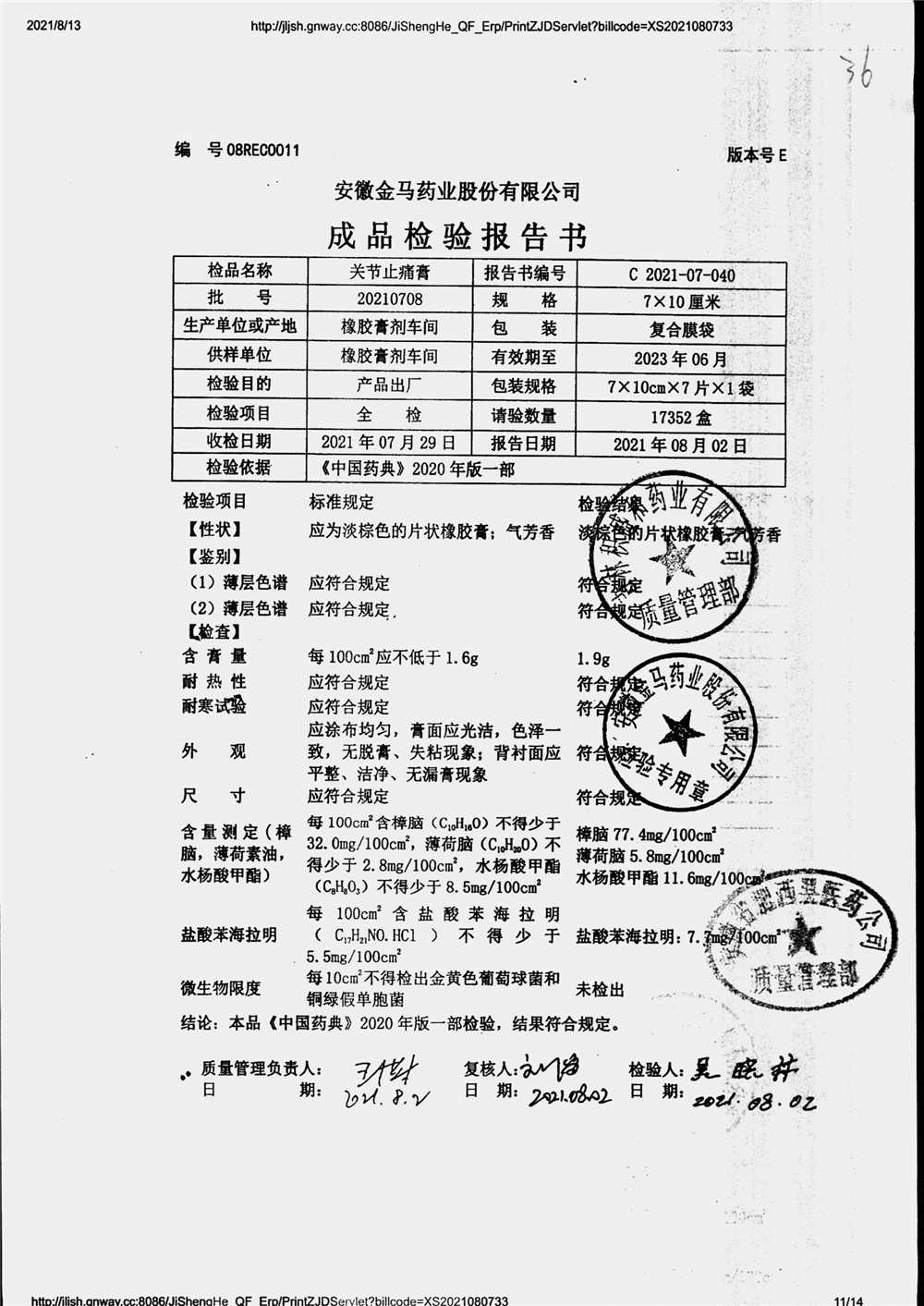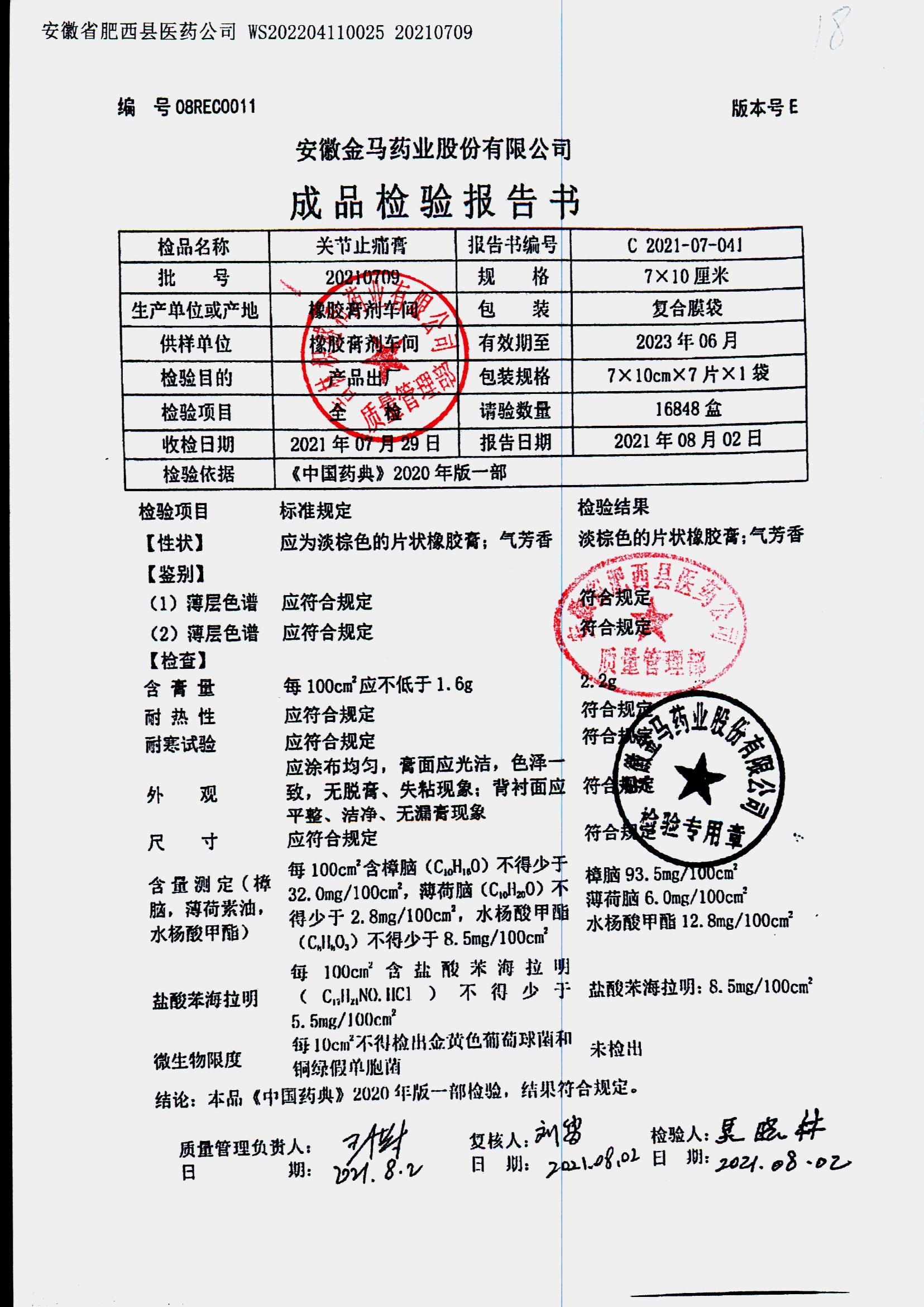 关节止痛膏 | 7x10cm*7片 | 20210708 | 查看详情 |