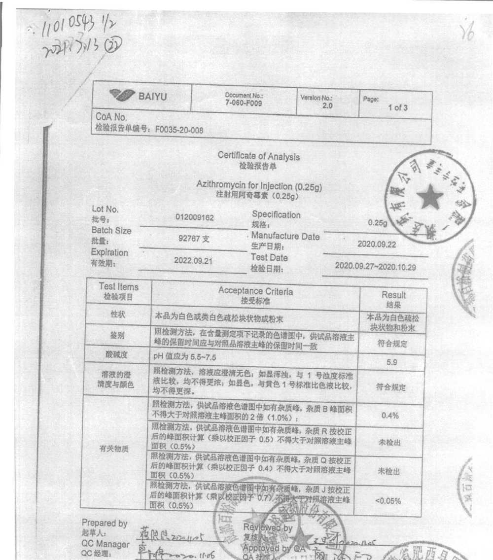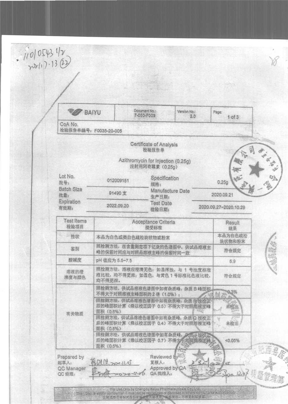 注射用阿奇霉素 | 0.25g*6支 | 012009151(2/2) | 查看详情 |