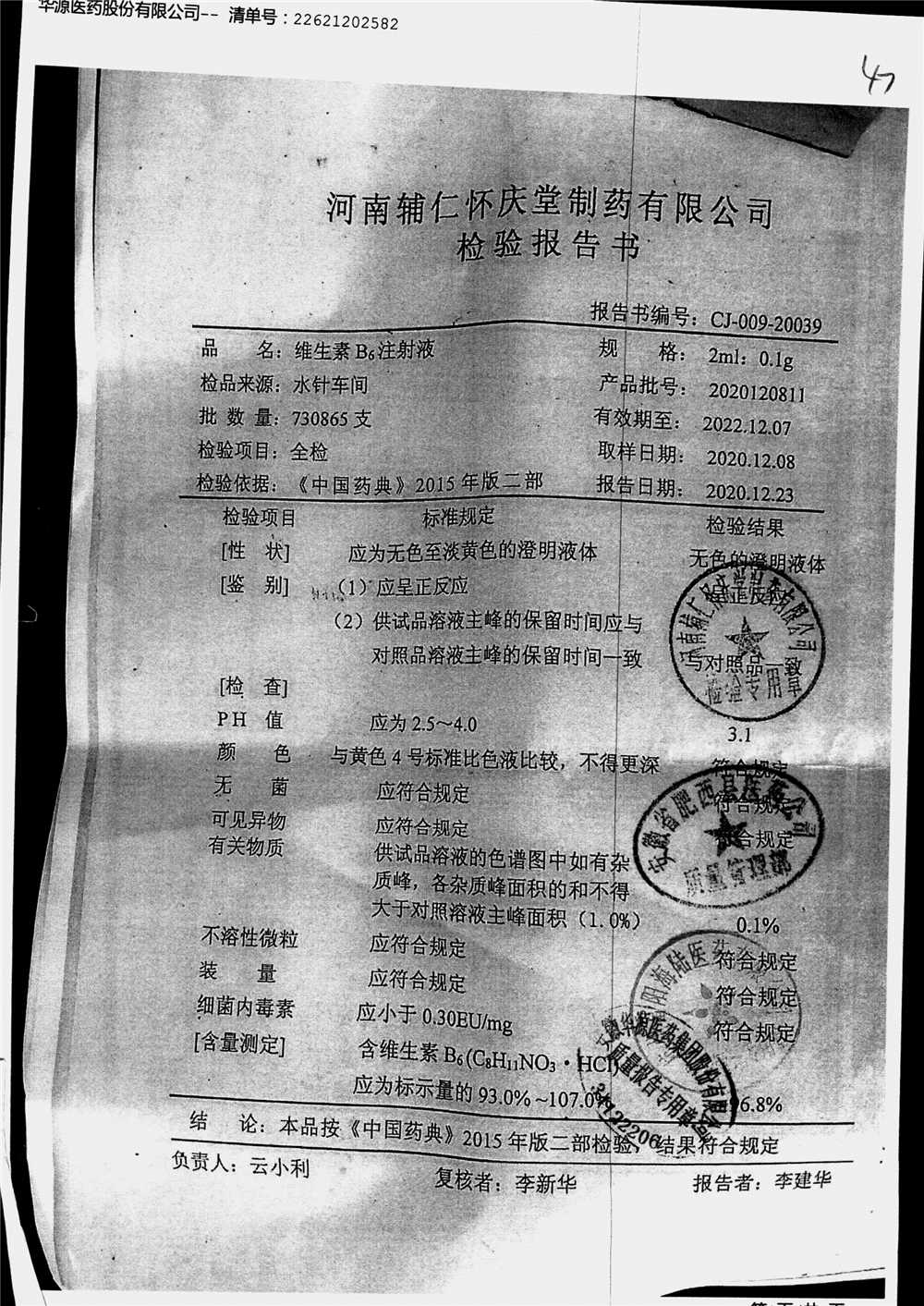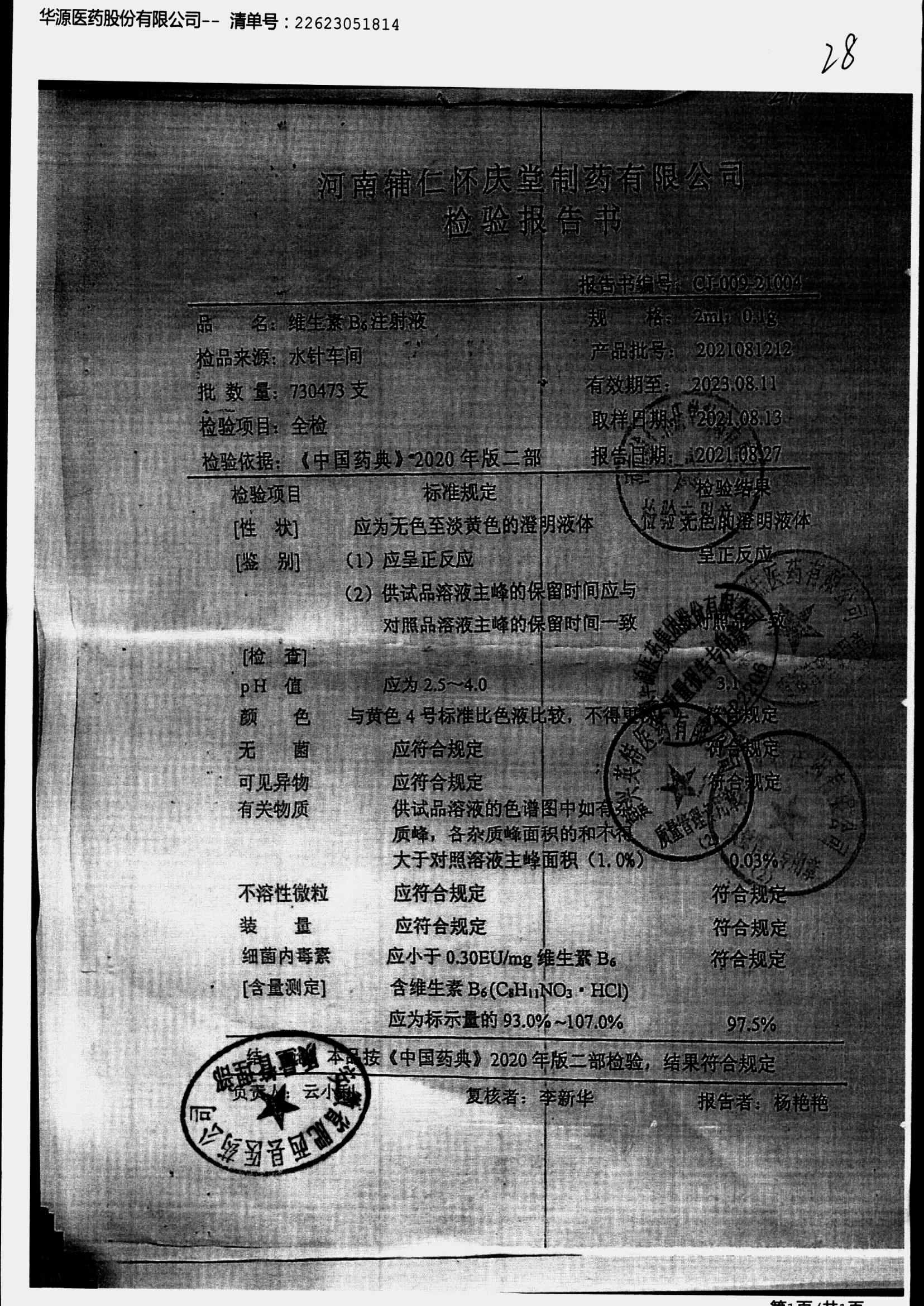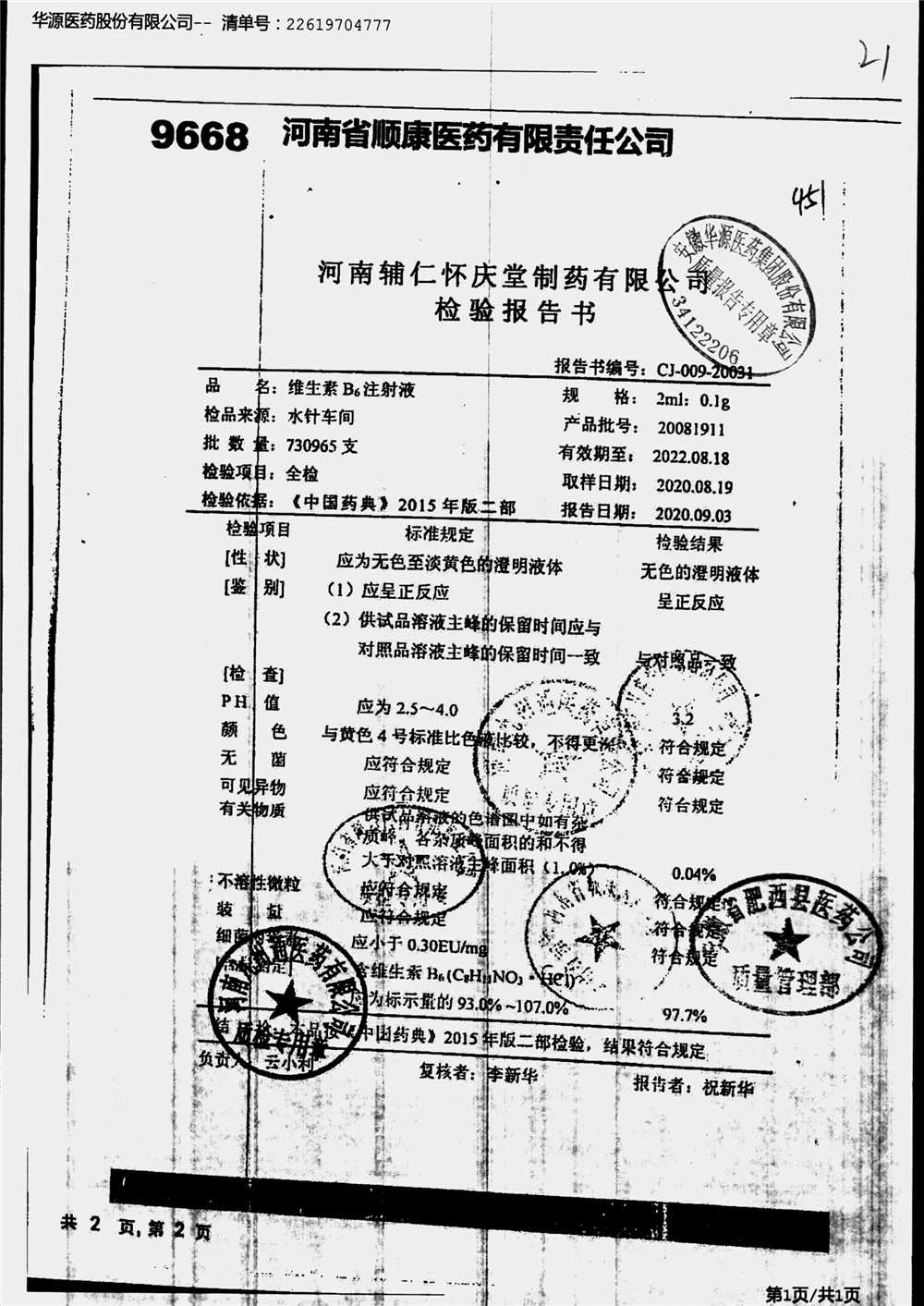 维生素B6注射液 | 2ml:0.1g*10支 | 2020120811 | 查看详情 |