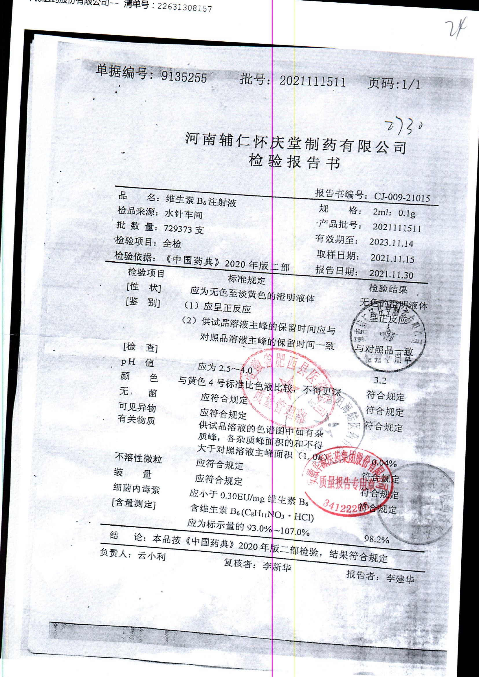 维生素B6注射液 | 2ml:0.1g*10支 | 2021082012 | 查看详情 |