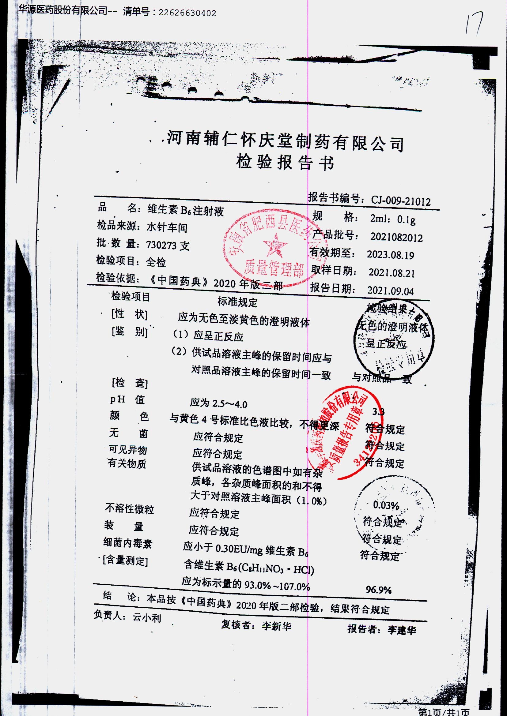 维生素B6注射液 | 2ml:0.1g*10支 | 2021081712 | 查看详情 |