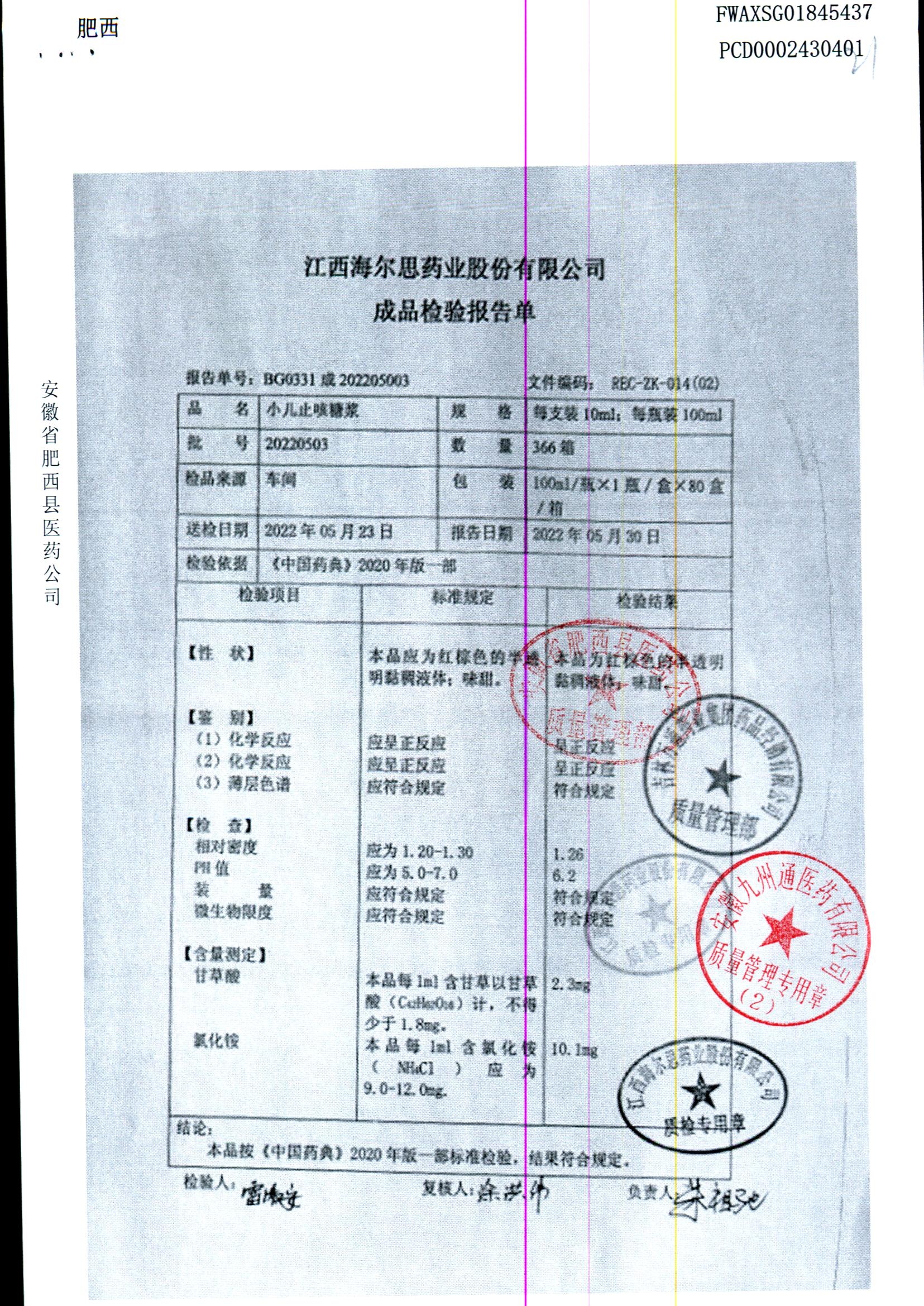 小儿止咳糖浆 | 100ml/瓶 | 20220503 | 查看详情 |