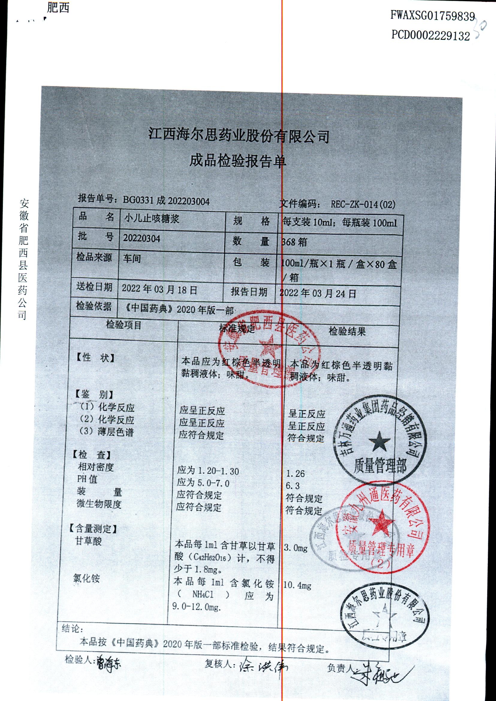 小儿止咳糖浆 | 100ml/瓶 | 20220304 | 查看详情 |