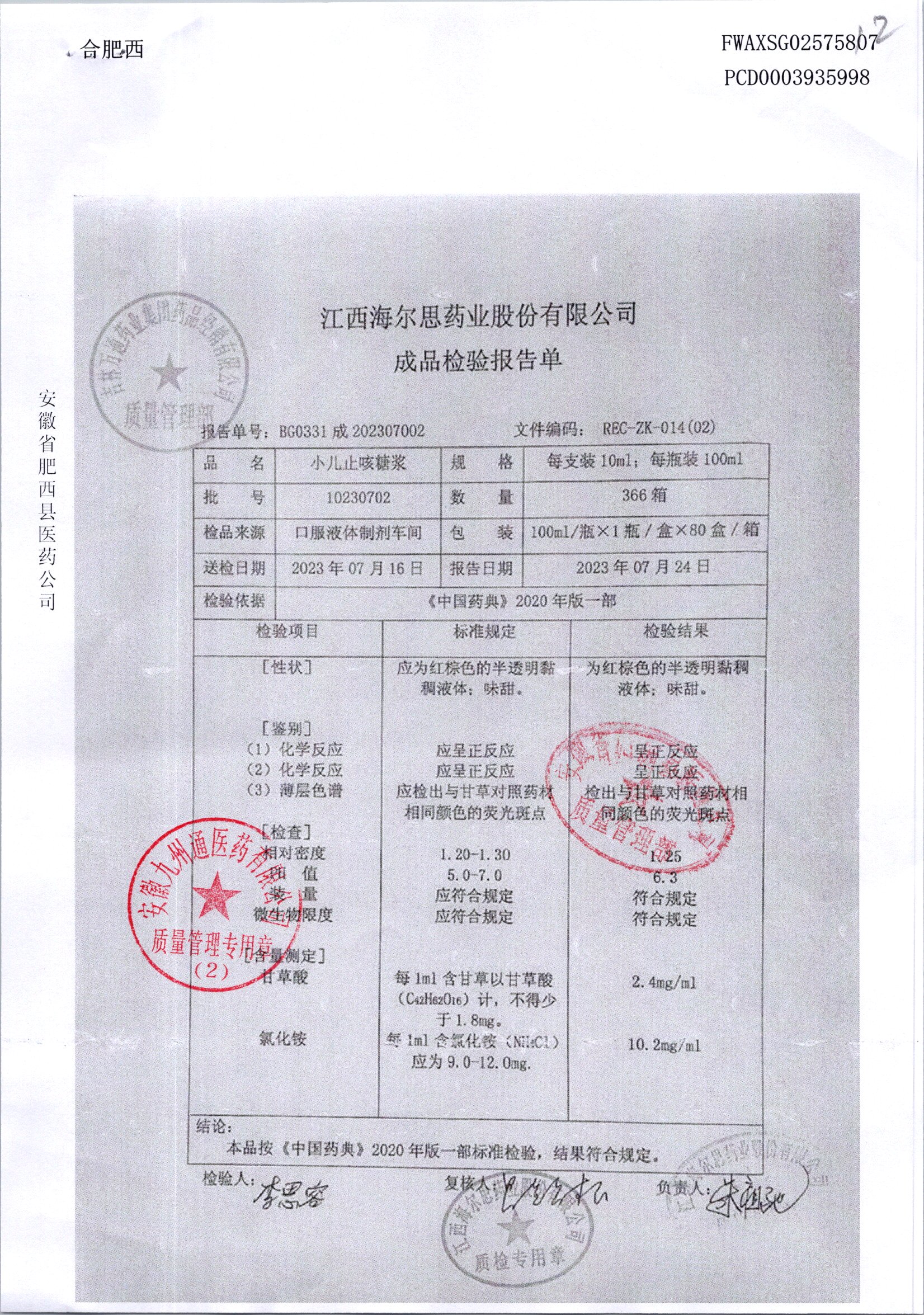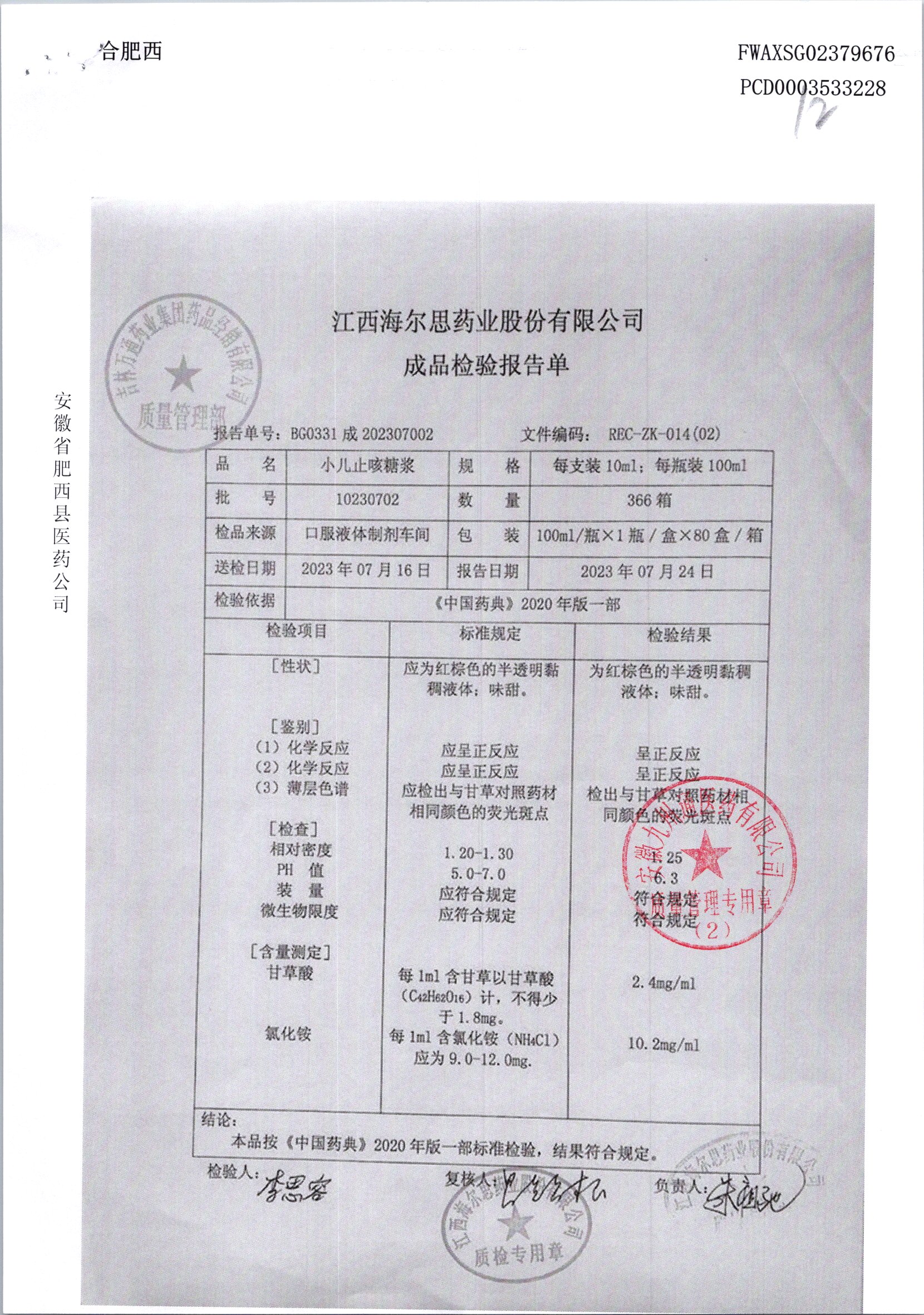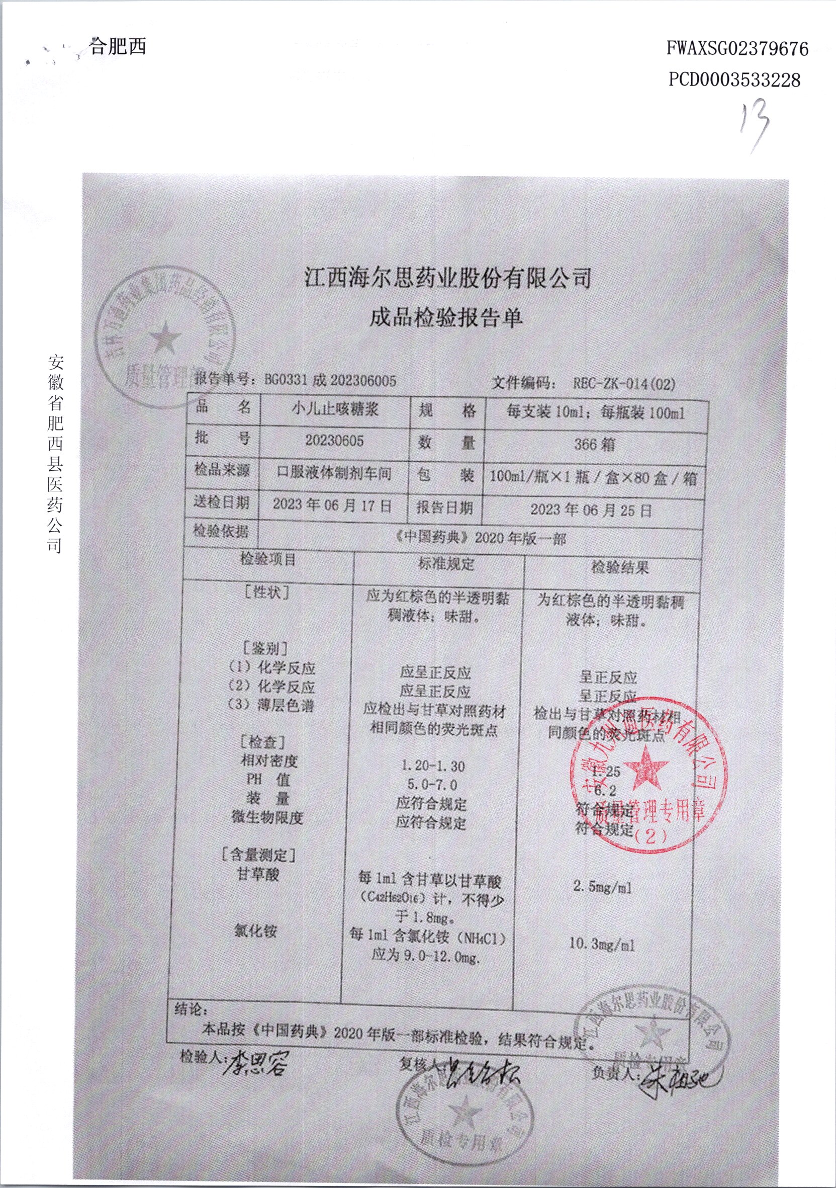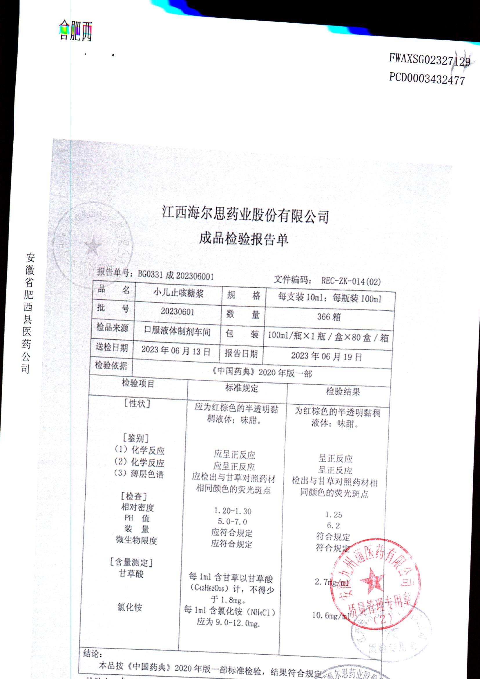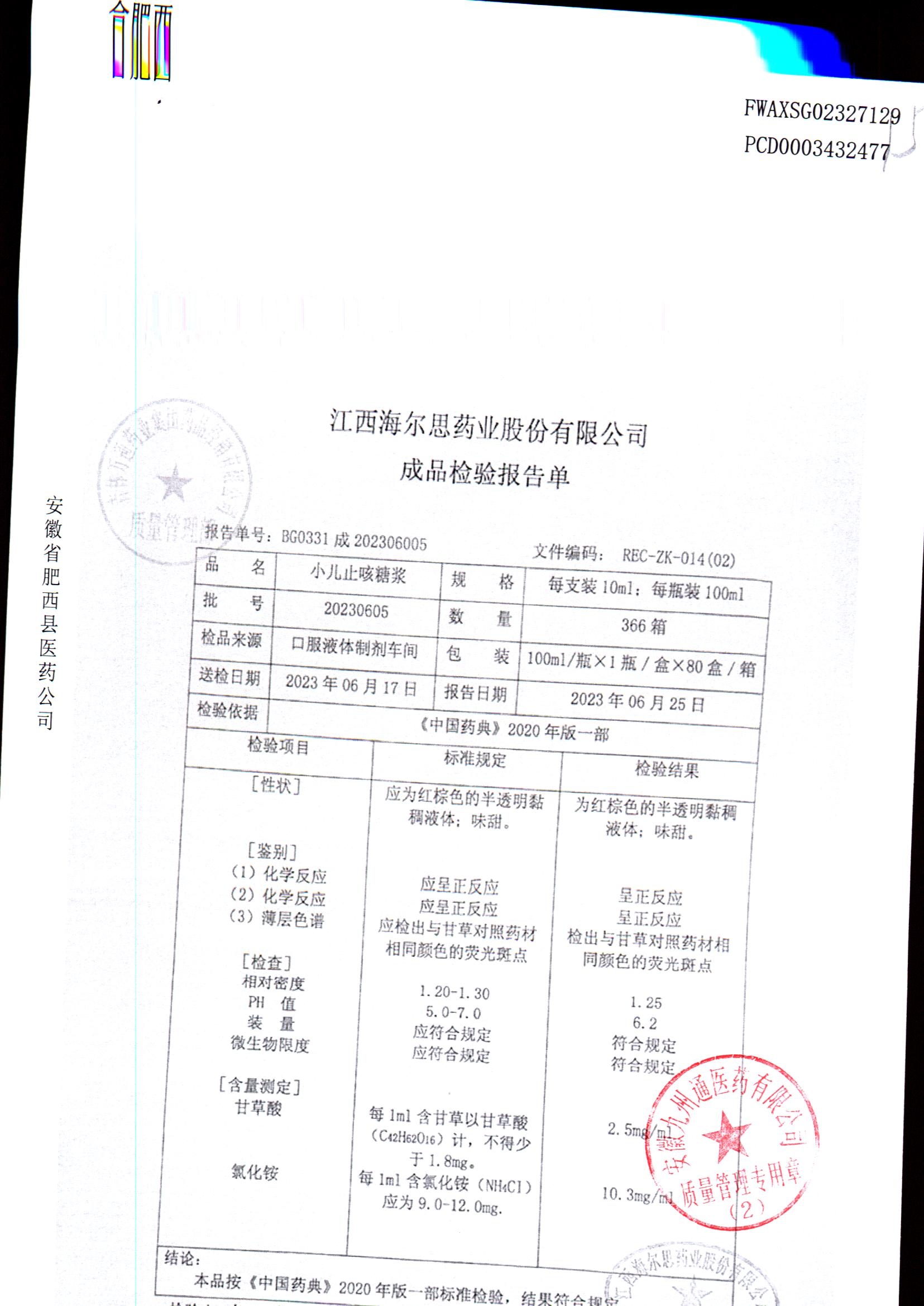 小儿止咳糖浆 | 100ml/瓶 | 20230605 | 查看详情 |