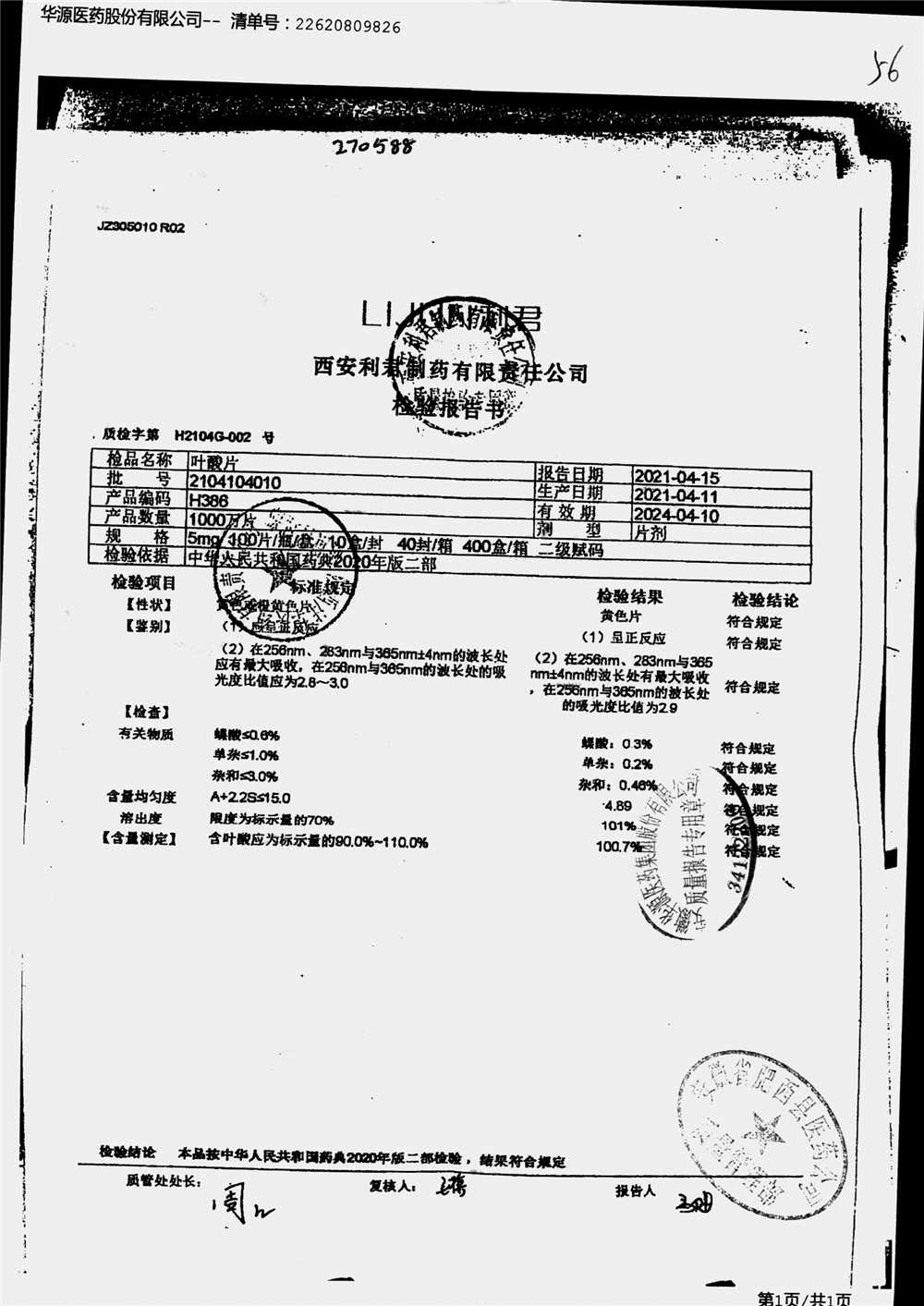 叶酸片 | 5mg*100片 | 2104129010 | 查看详情 |