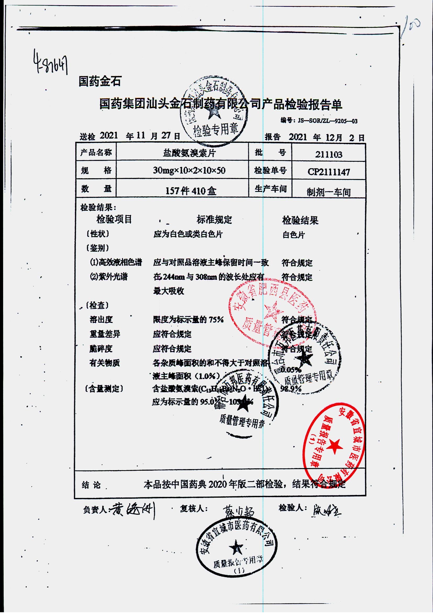 盐酸氨溴索片 | 30mg*20s | 211103 | 查看详情 |